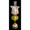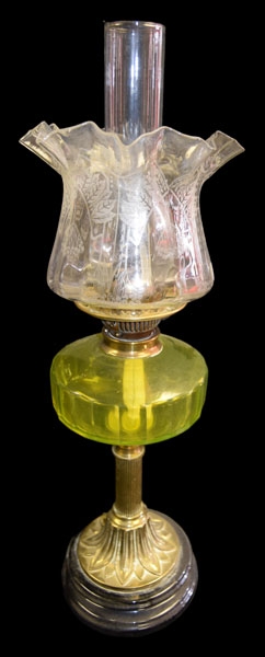 An Oil Lamp, Coloured Glass Bowl and Etched Shade