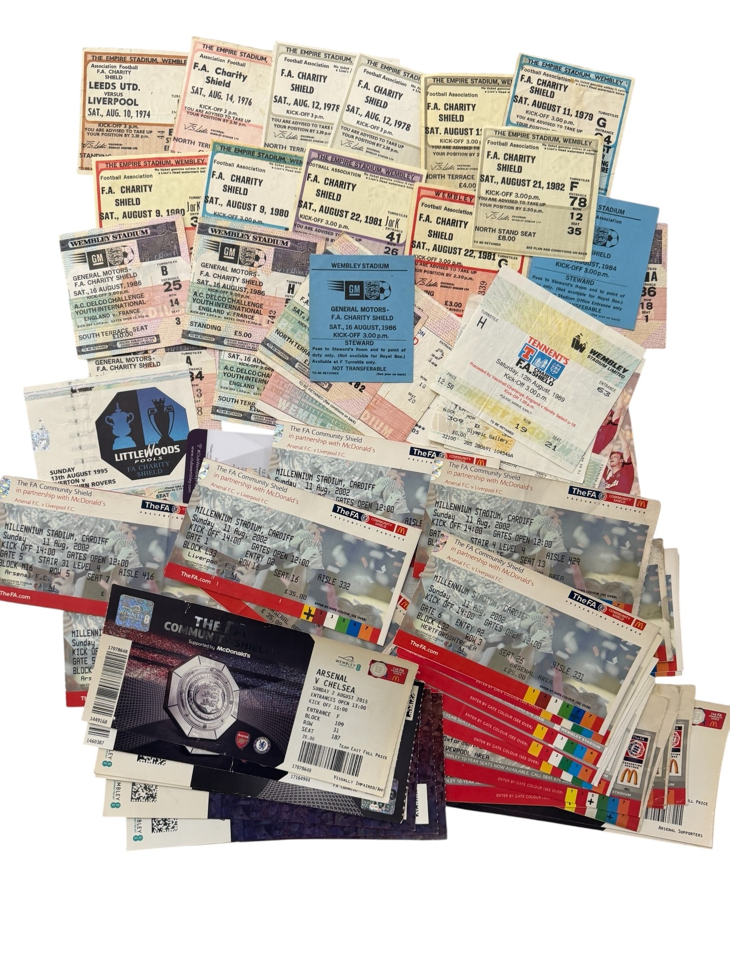 COLLECTION OF FA CHARITY SHIELD FOOTBALL TICKET STUBS, 1974/76/78 x2/79 X2/80 x2/81 x2/82/84 x2/86 x6/87/88 x2/89 x2/91/92 x2/95, x30 2000s ONWARDS (HIGH DUPLICATION)