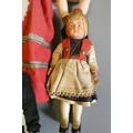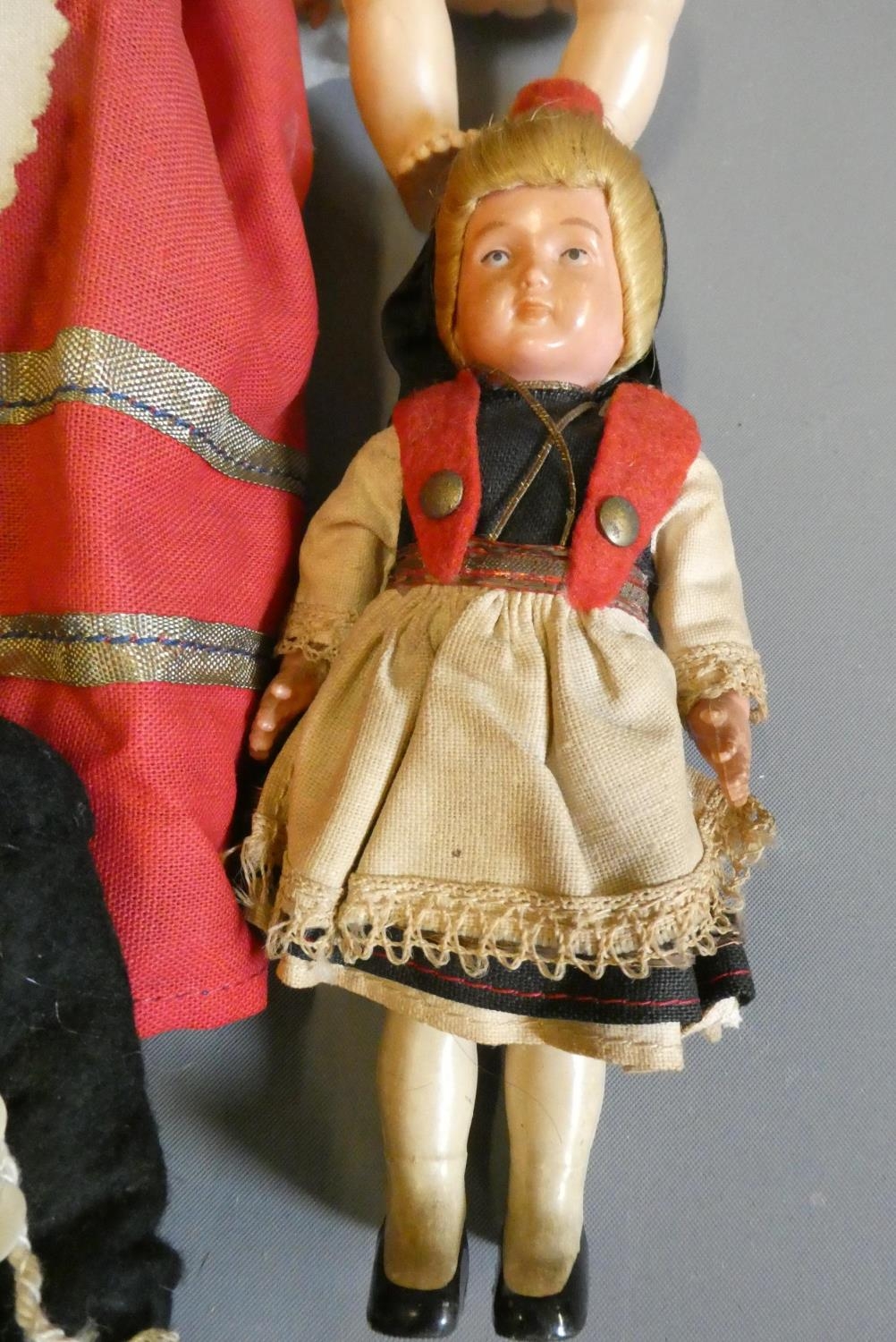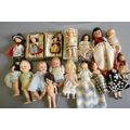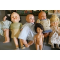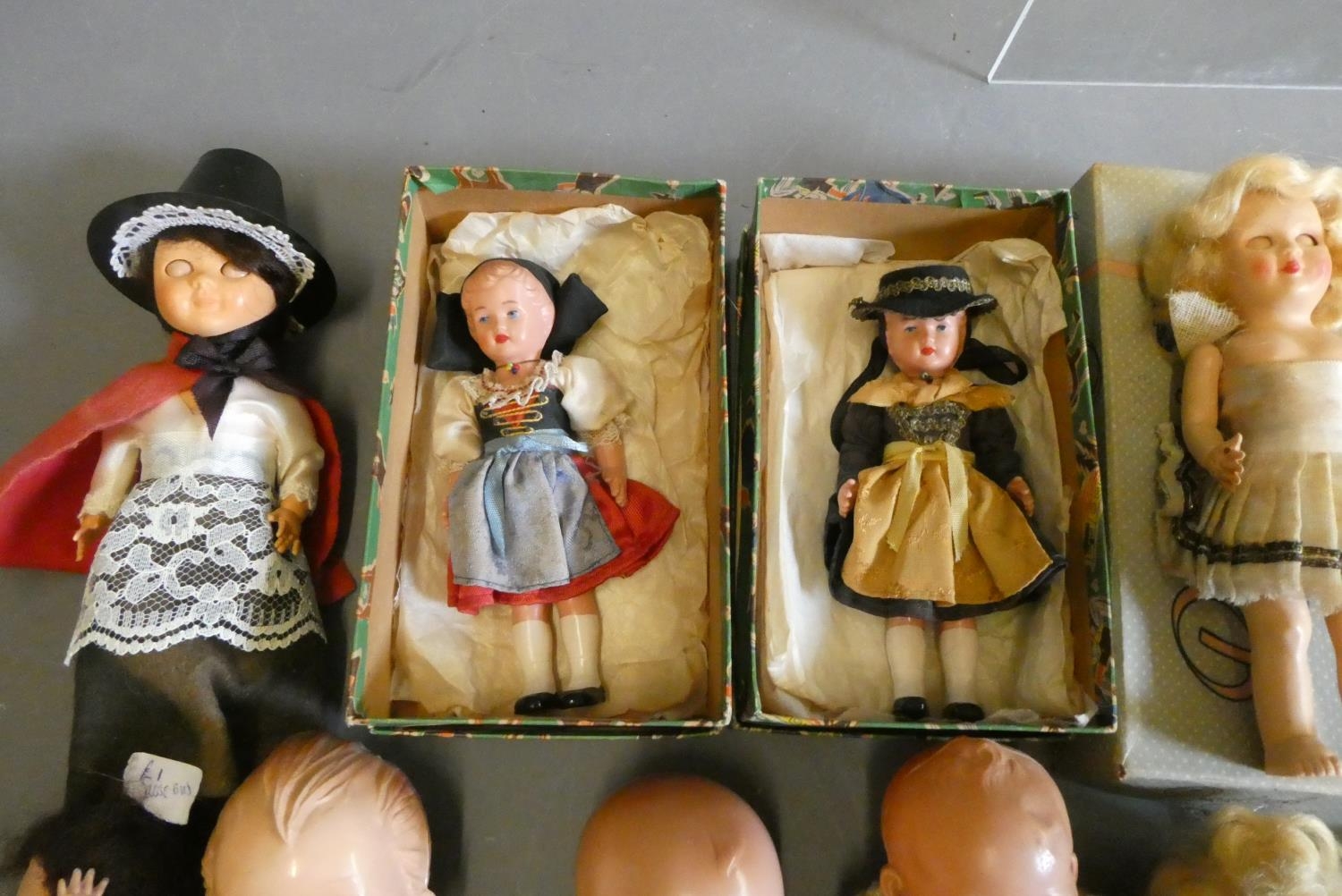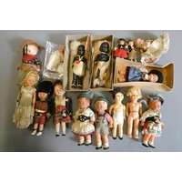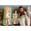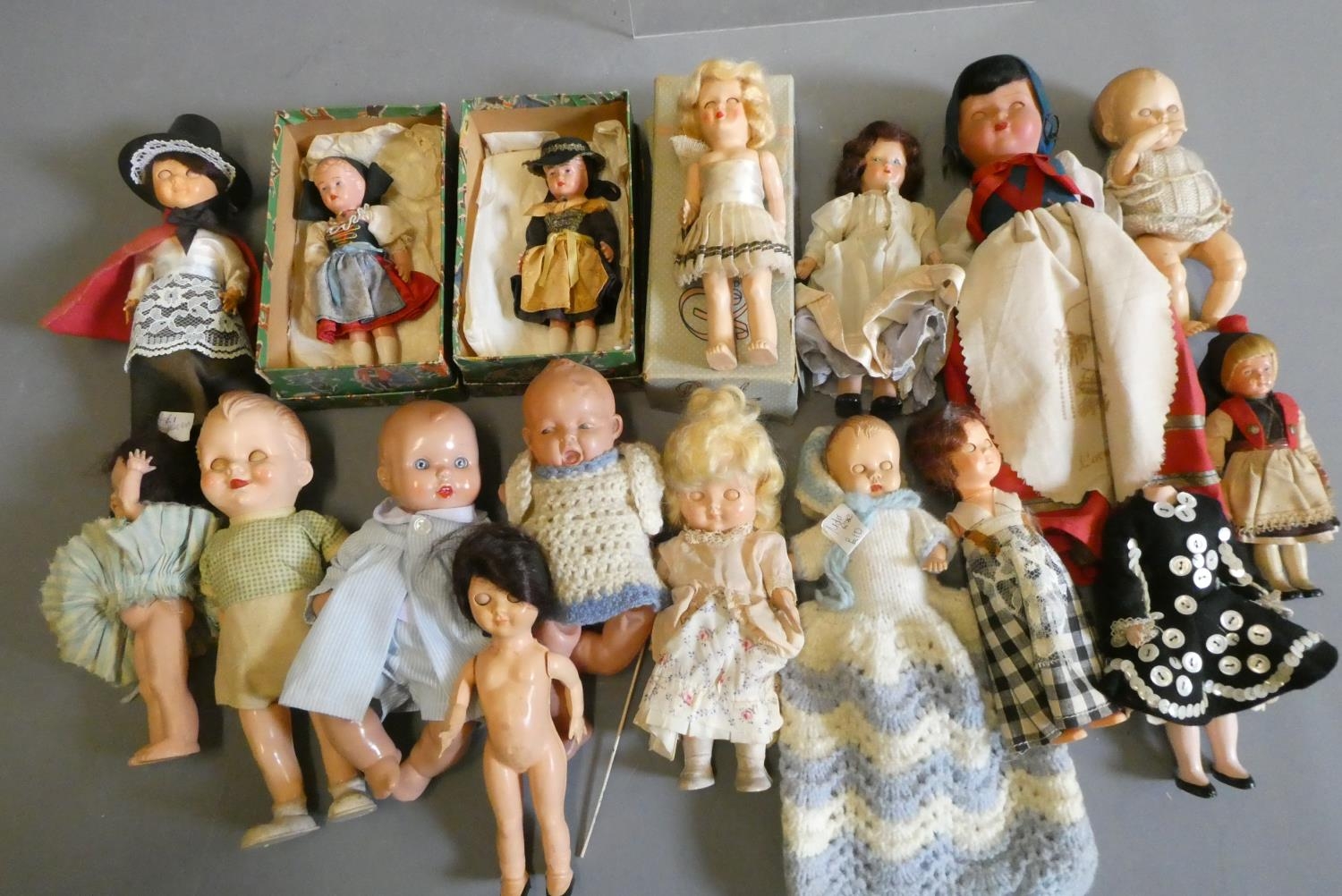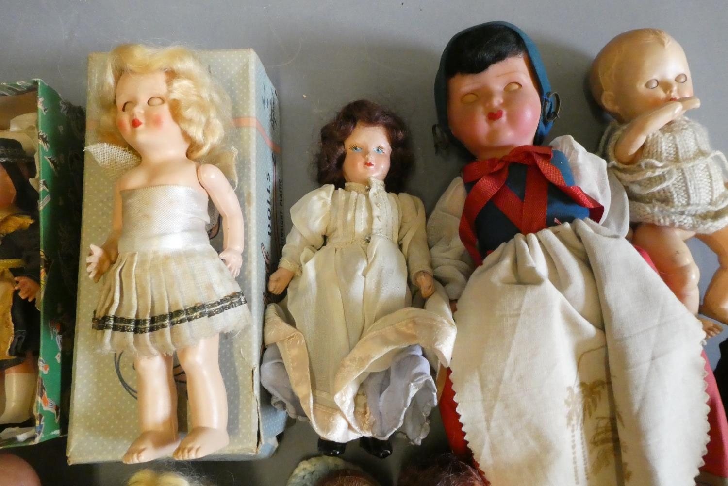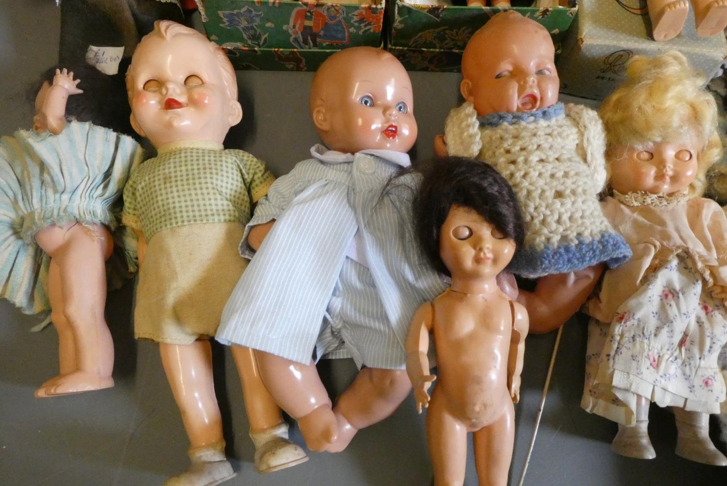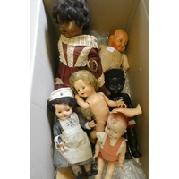 A box of vintage celluloid dolls including a Rosebud doll and others, three in original boxes