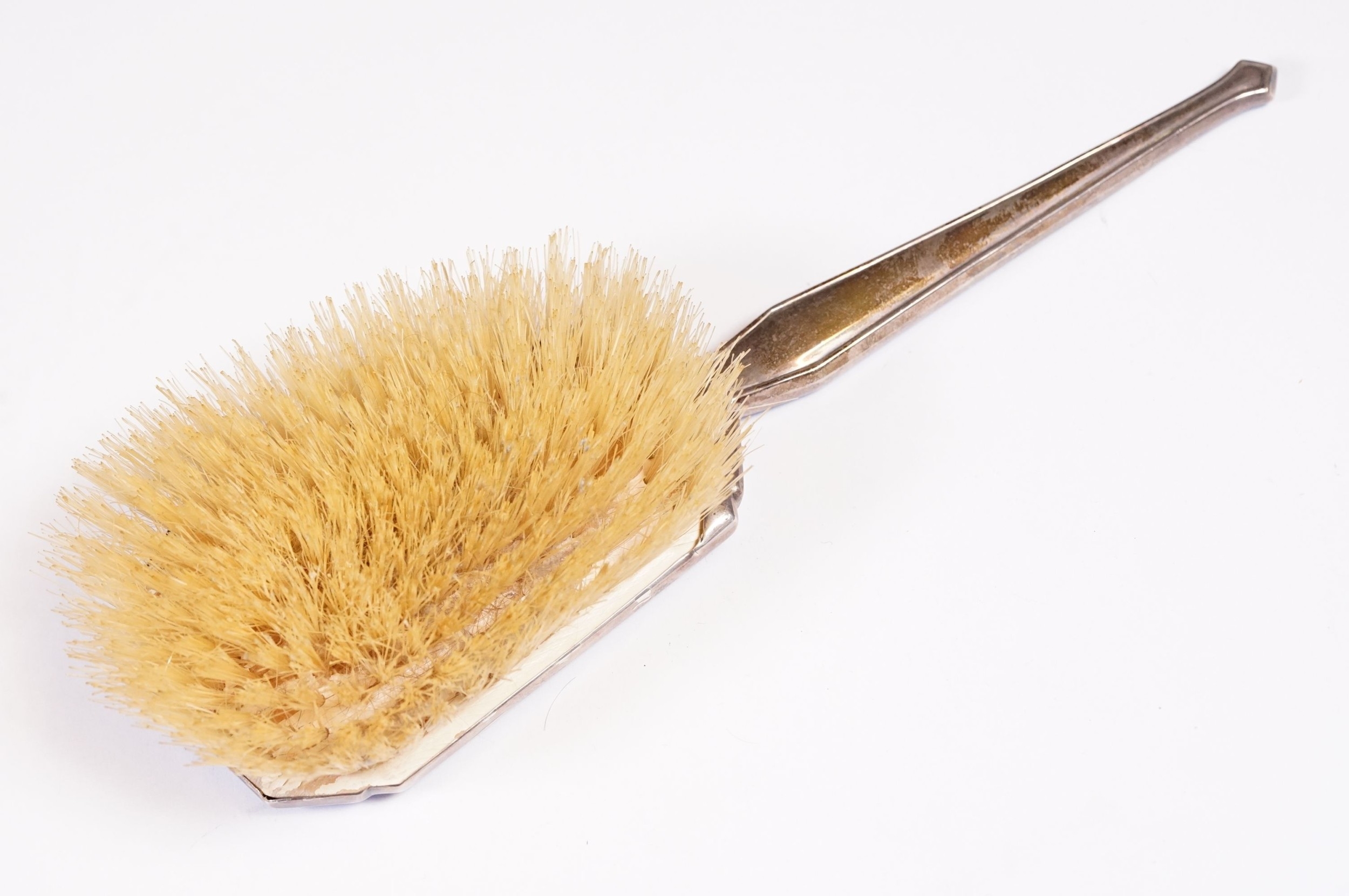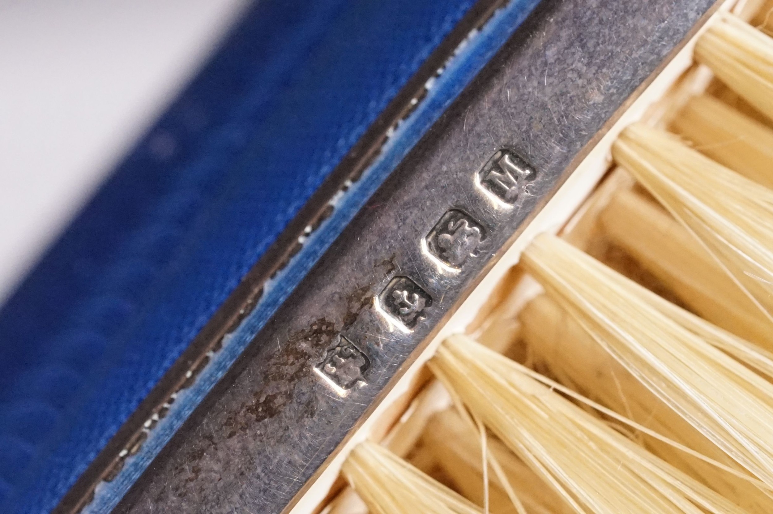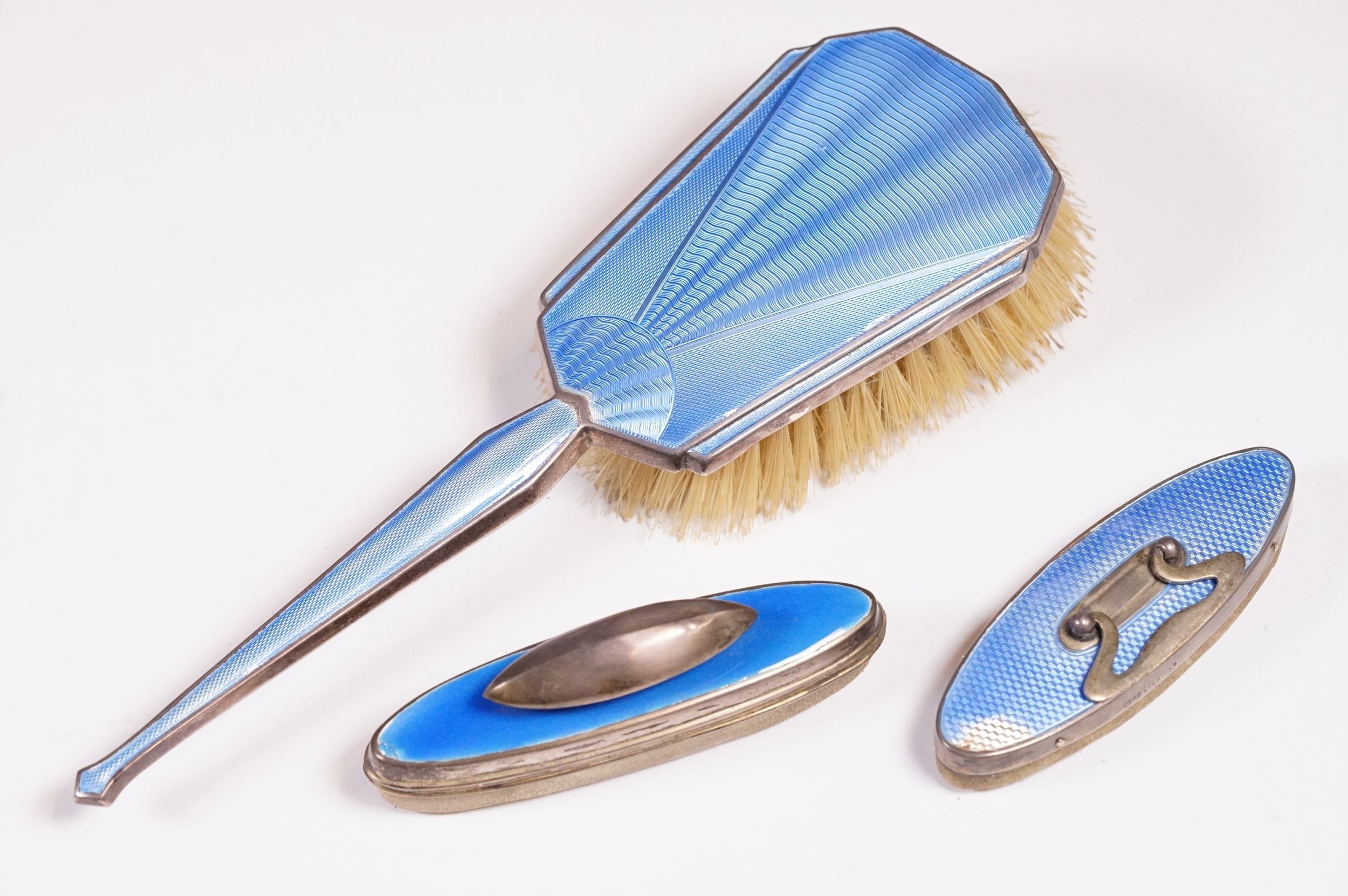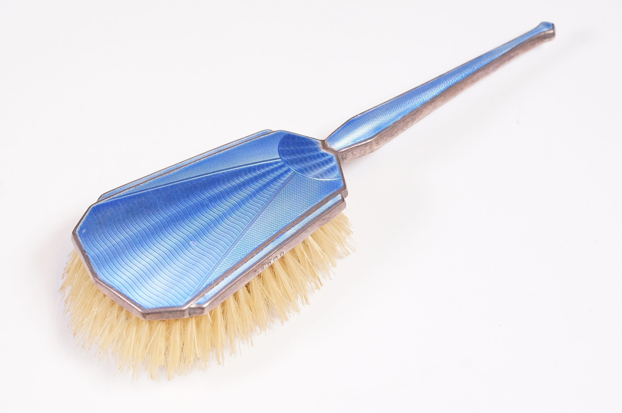An Art Deco fully hallmarked sterling silver and blue guilloche enamel vanity set to include brush and nail buffers.
