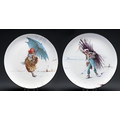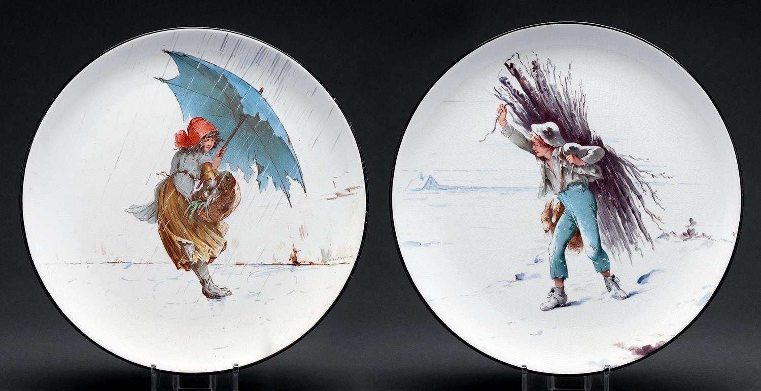 A pair of Mintons earthenware plaques, 1878, painted by A Boullemier, one signed, with a boy gathering kindling in winter or a windswept girl in a storm, 24.5cm diam, impressed marks