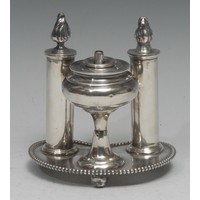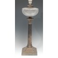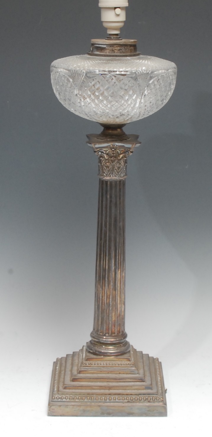 An early 20th century E.P.N.S Corinthian column table oil lamp, hobnail-cut clear glass reservoir, fluted pillar, stepped square base with beaded borders, 57cm high, fitted for electricity