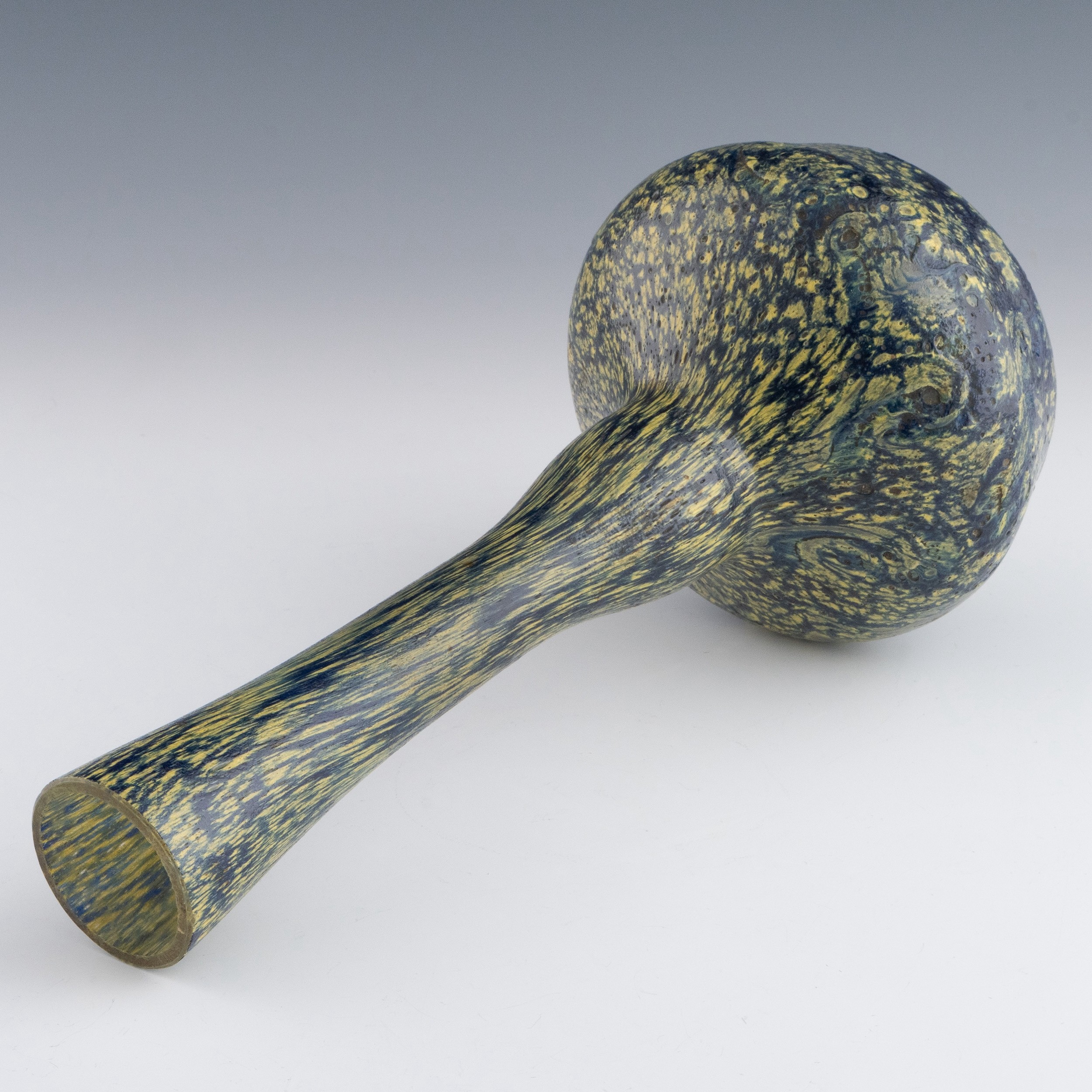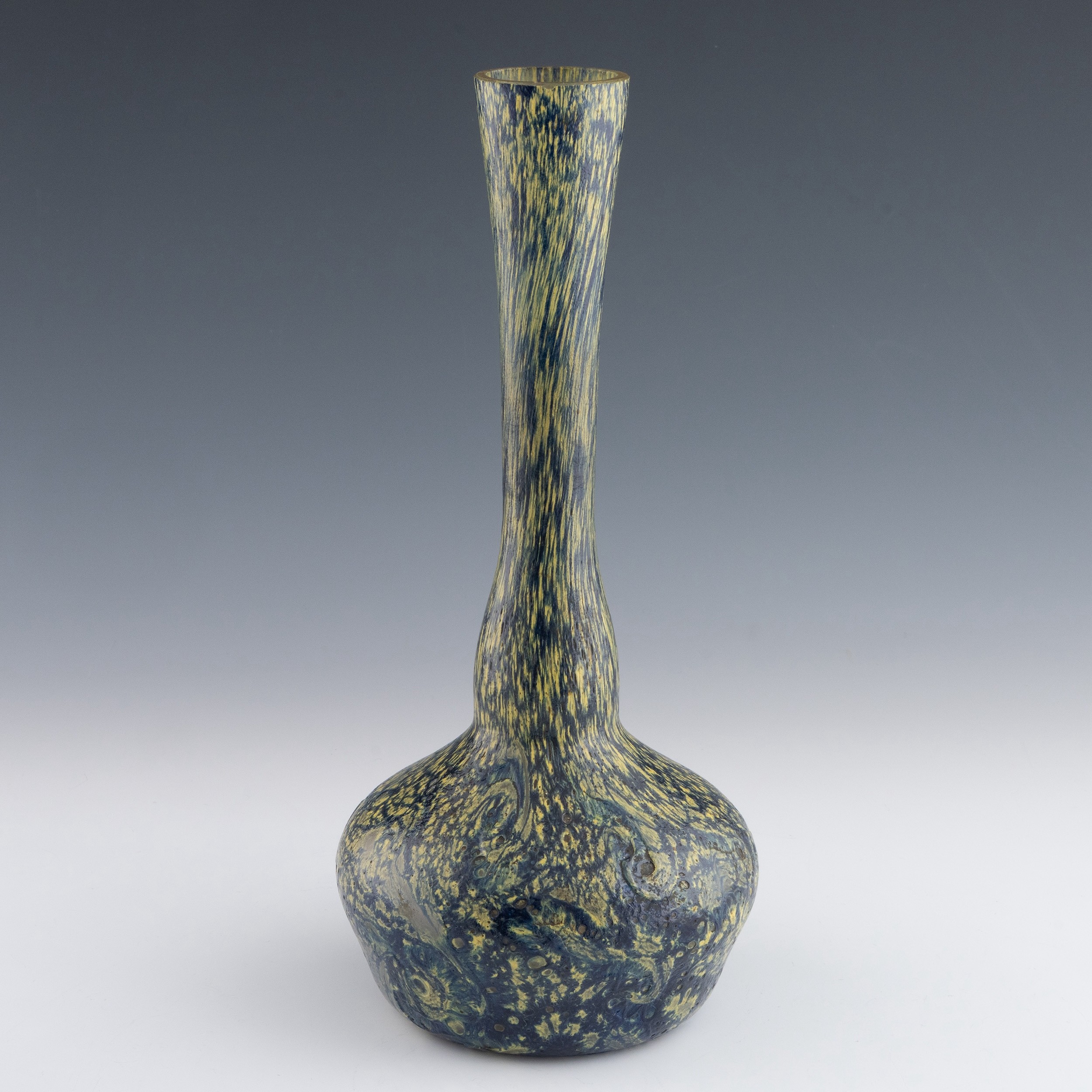 A 1920s enamelled berluze vase attributed to Degue, with gourd-shaped neck and bulbous body, decorated with thickly applied yellow and blue enamels, with swirls of enamel near the base with consistently clear centres, almost certainly French, 29.5cm height. (LDC11915)