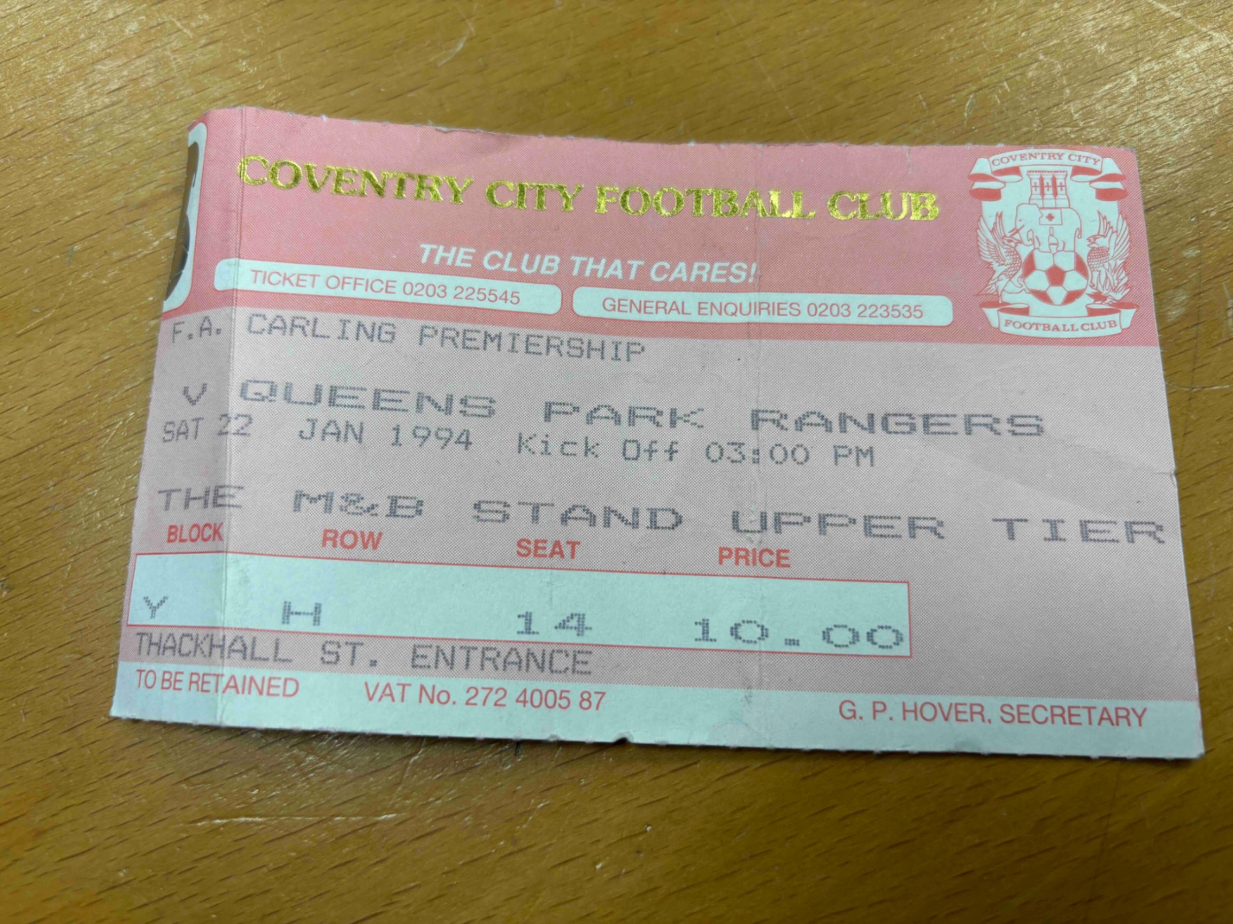 Coventry City Home ticket v Queens Park Rangers, 93/94