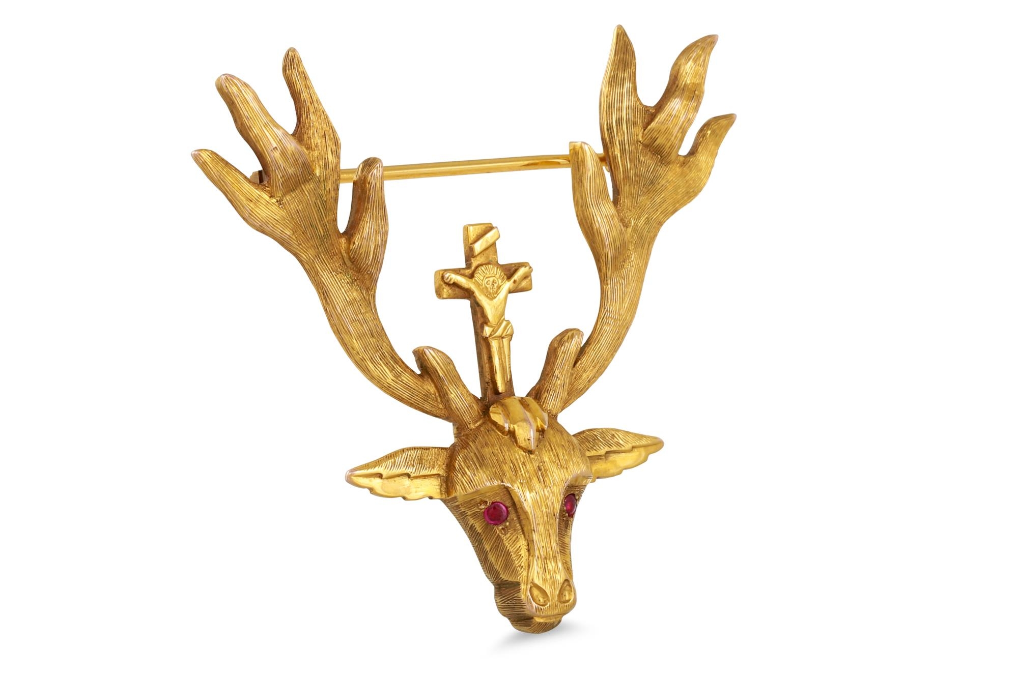 A 9CT GOLD STAG OF ST.HUBERT BROOCH, ruby eyes, (family crest of the Power / Le Poar family), in Skinner & co. box, 12.11 g.