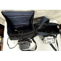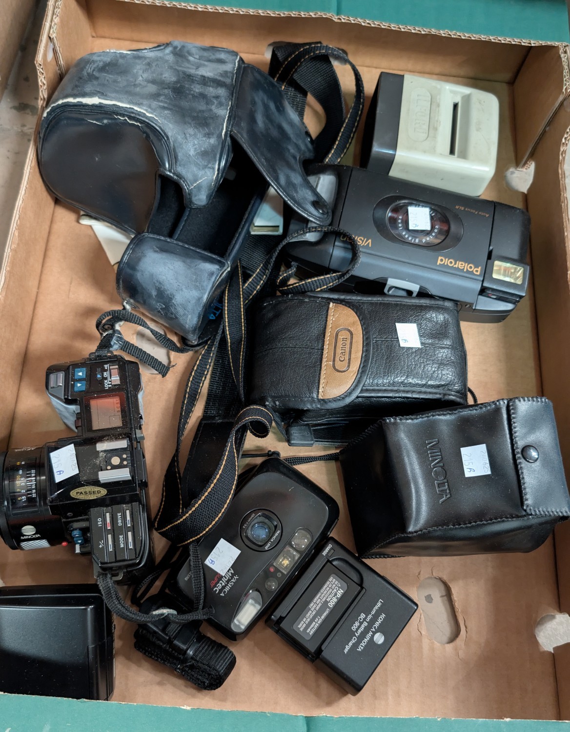 A Minolta 7000 SLR camera and accessories; a Canon camera; a Polaroid camera.