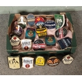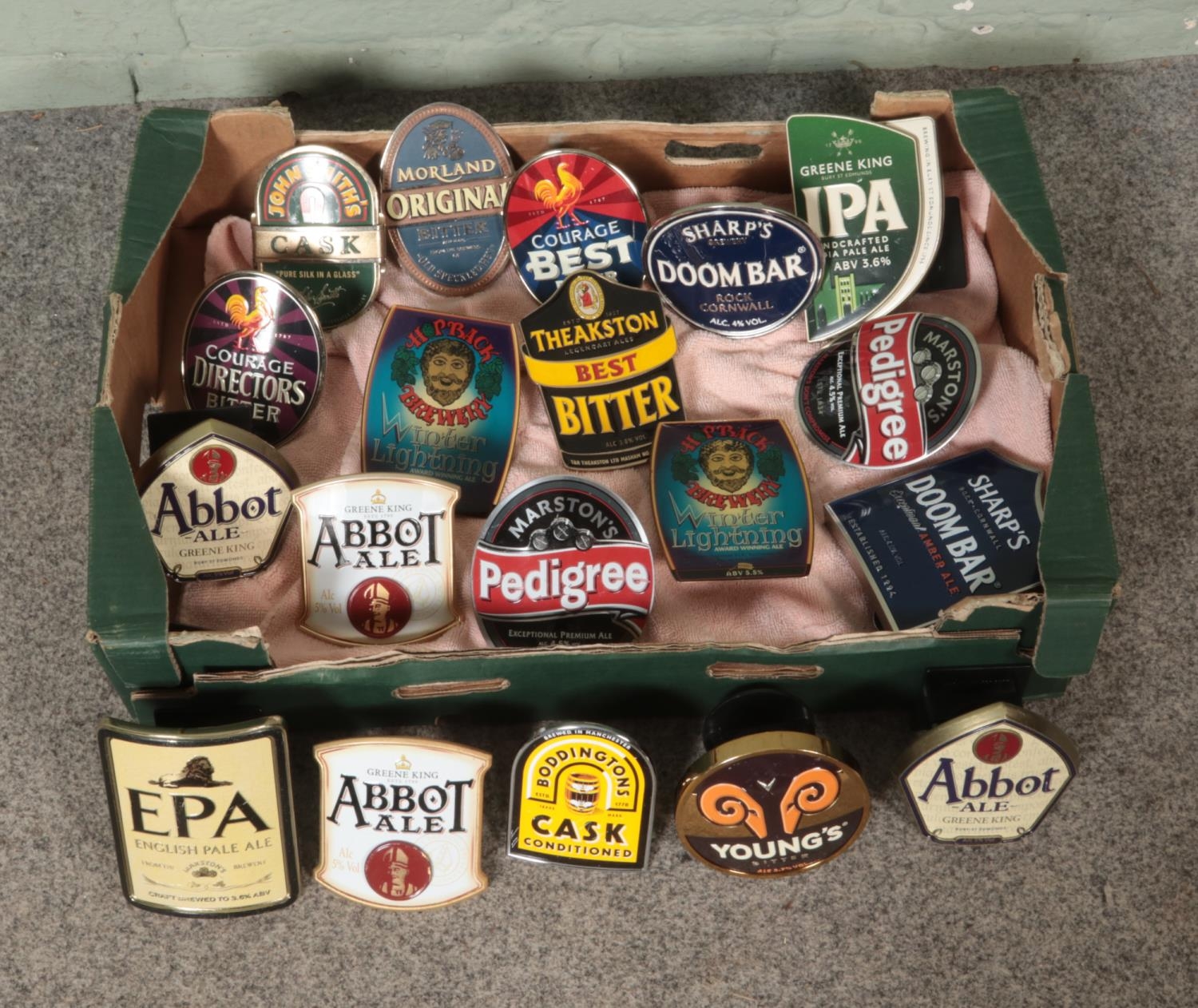A box of assorted beer pump badges to include Abbot Ale, Doombar, Courage Best Bitter, Morland Original, etc.