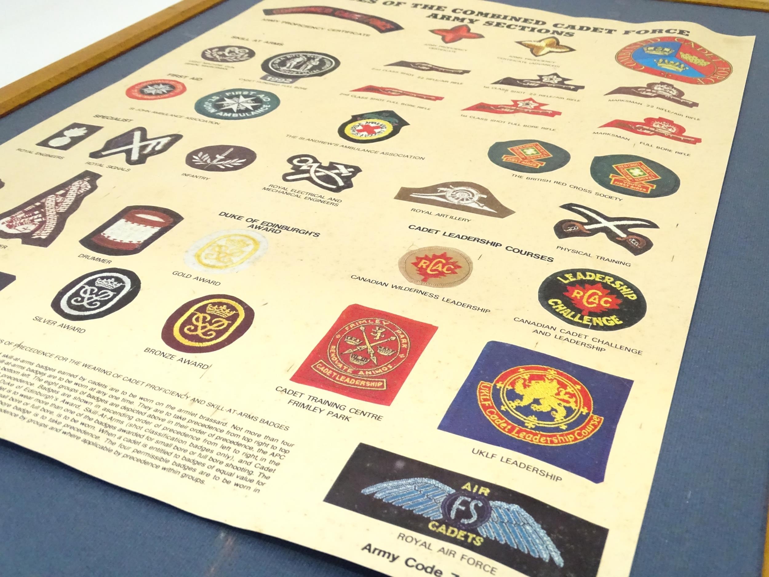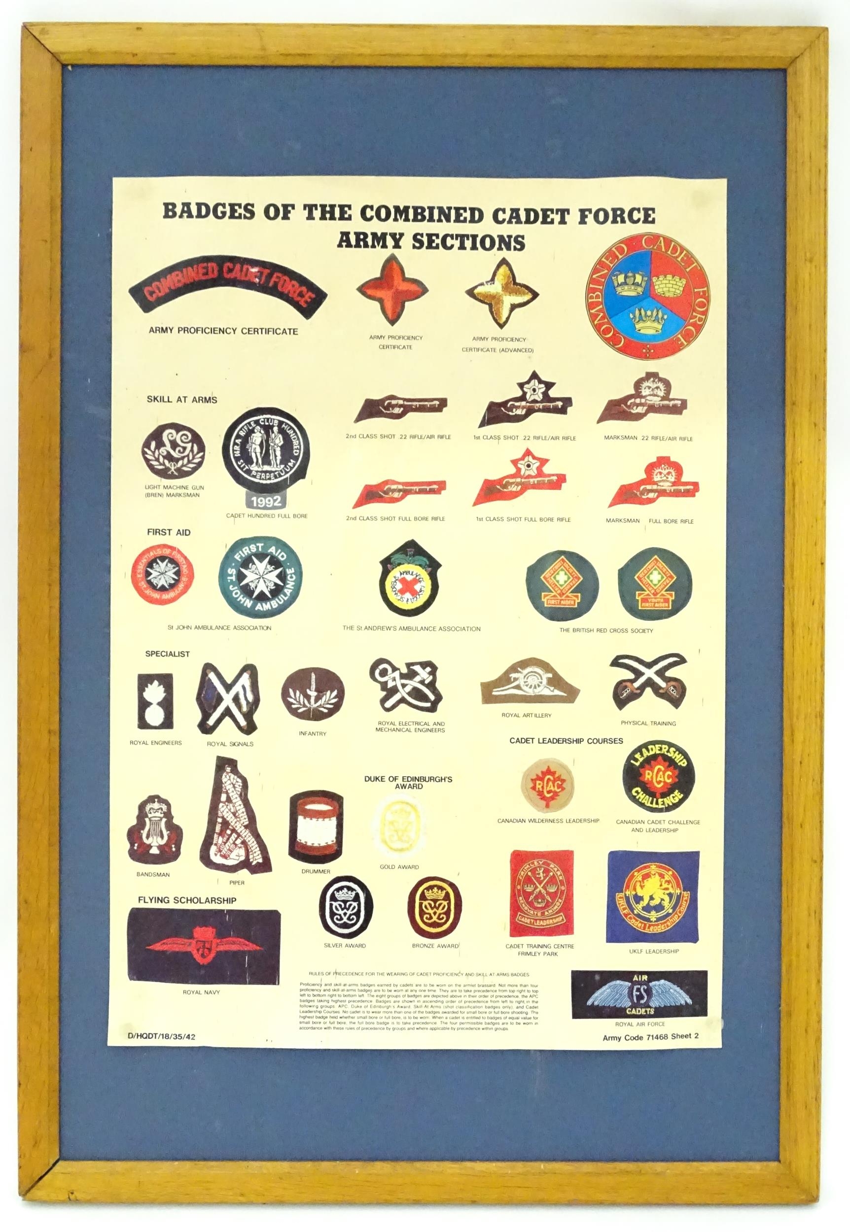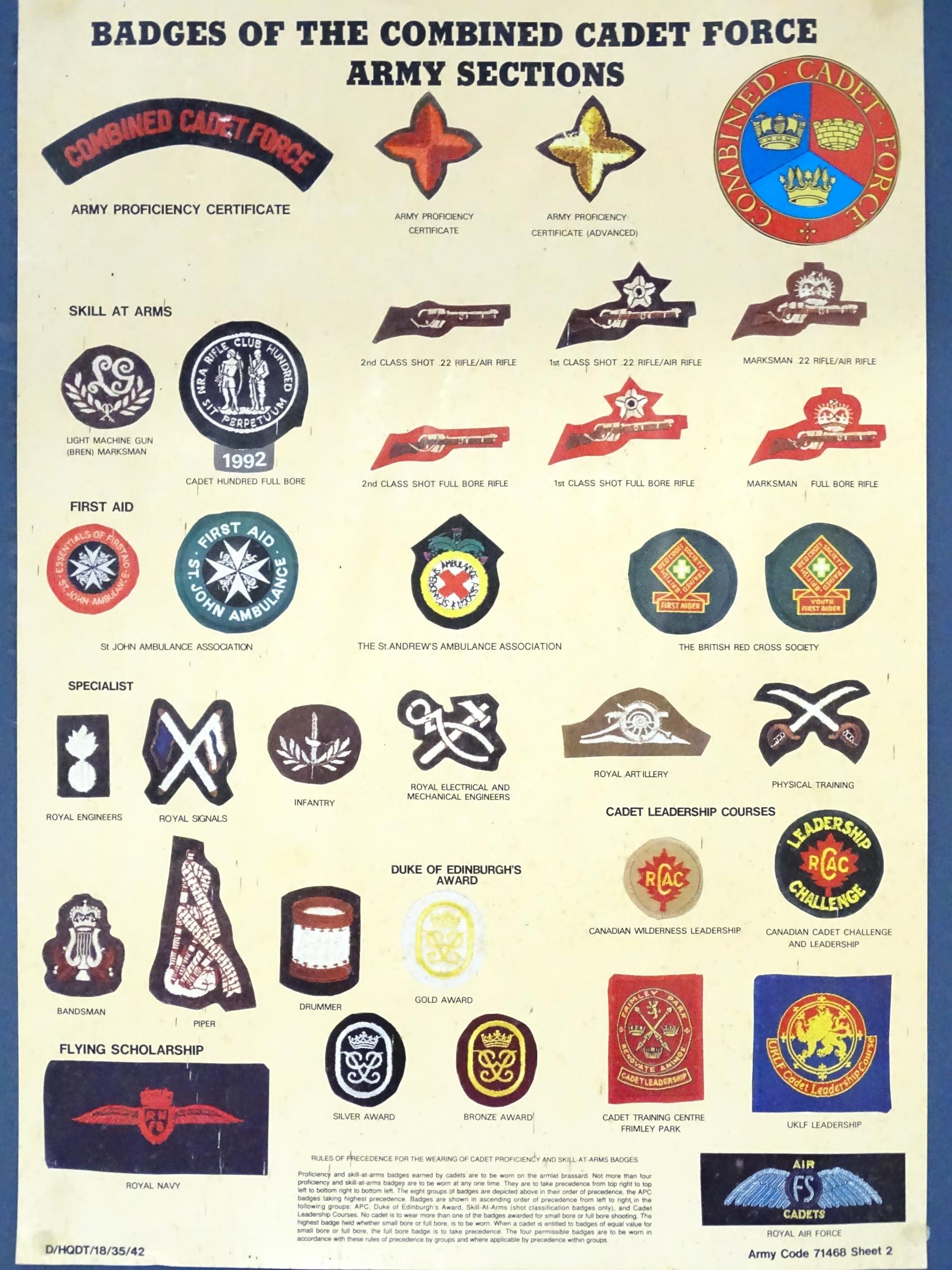 Militaria : a mid 20thC Army poster depicting CCF cadet badges, the frame marked on the reverse with EIIR crown cipher and dated 1961. Approx 23 1/2" x 16 3/8"
