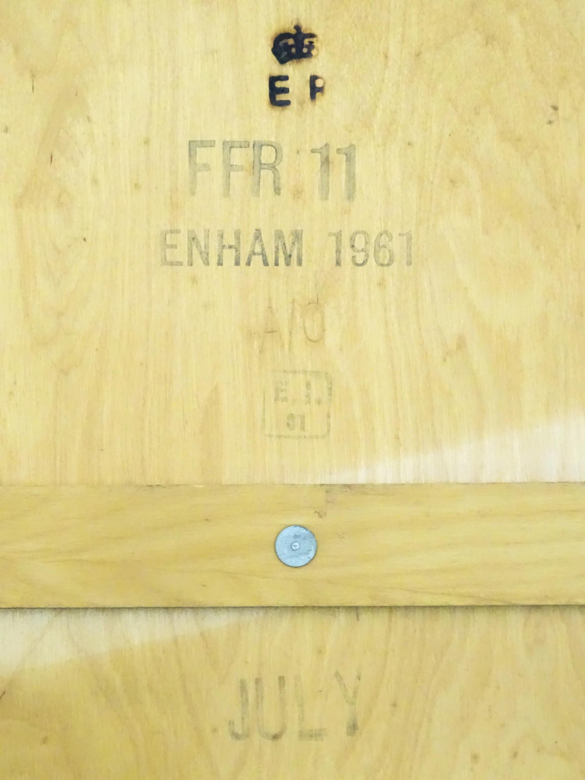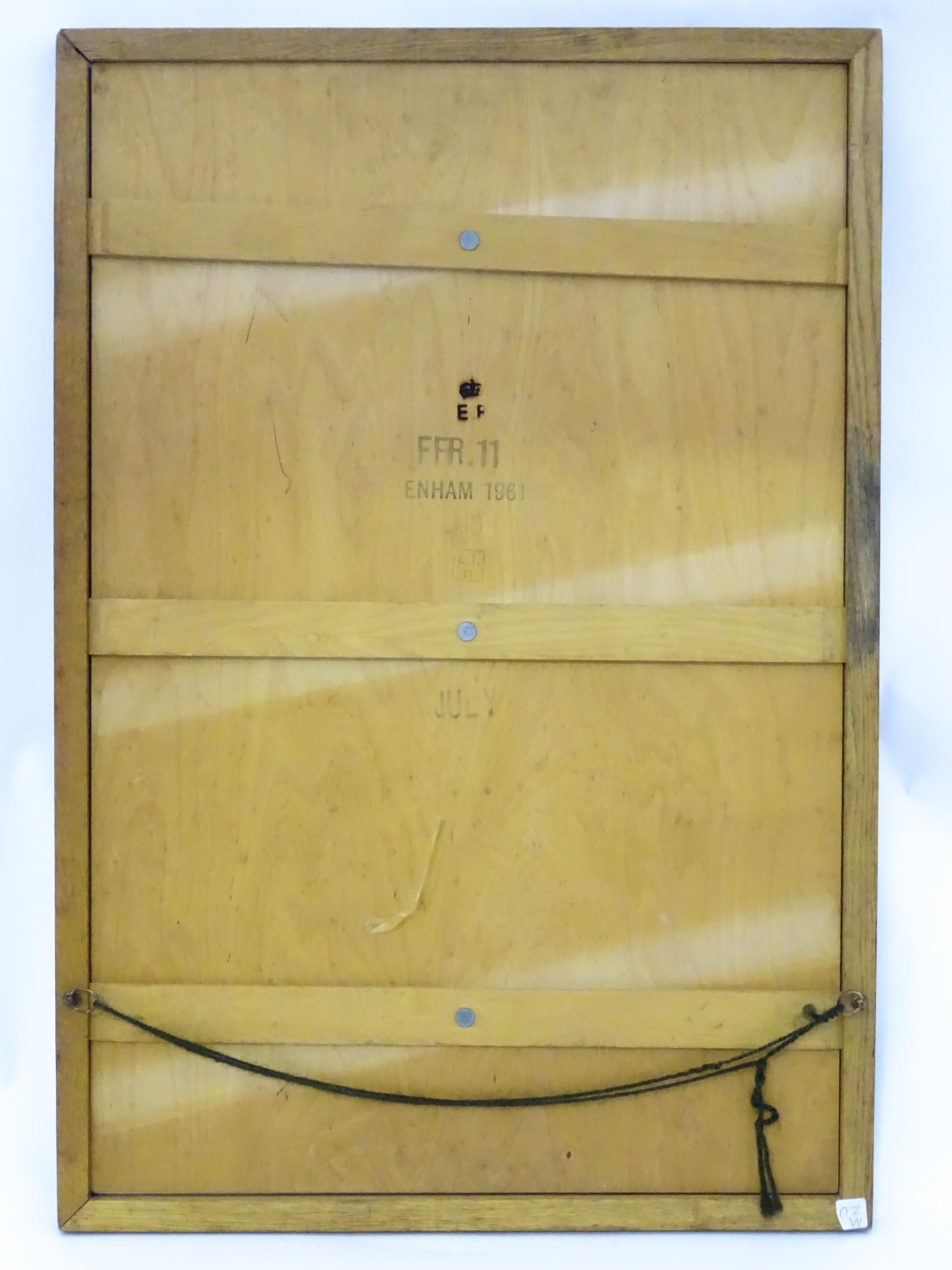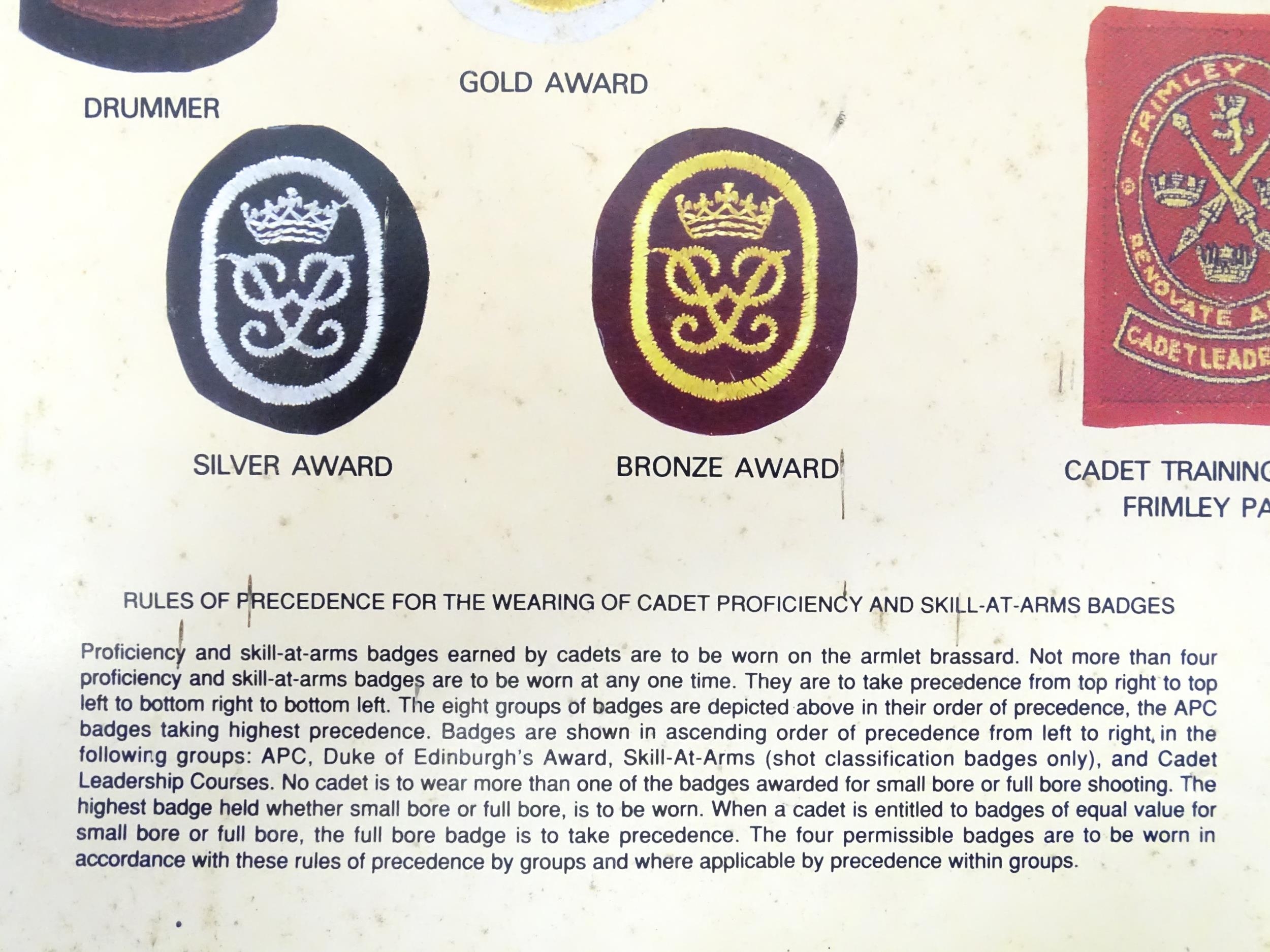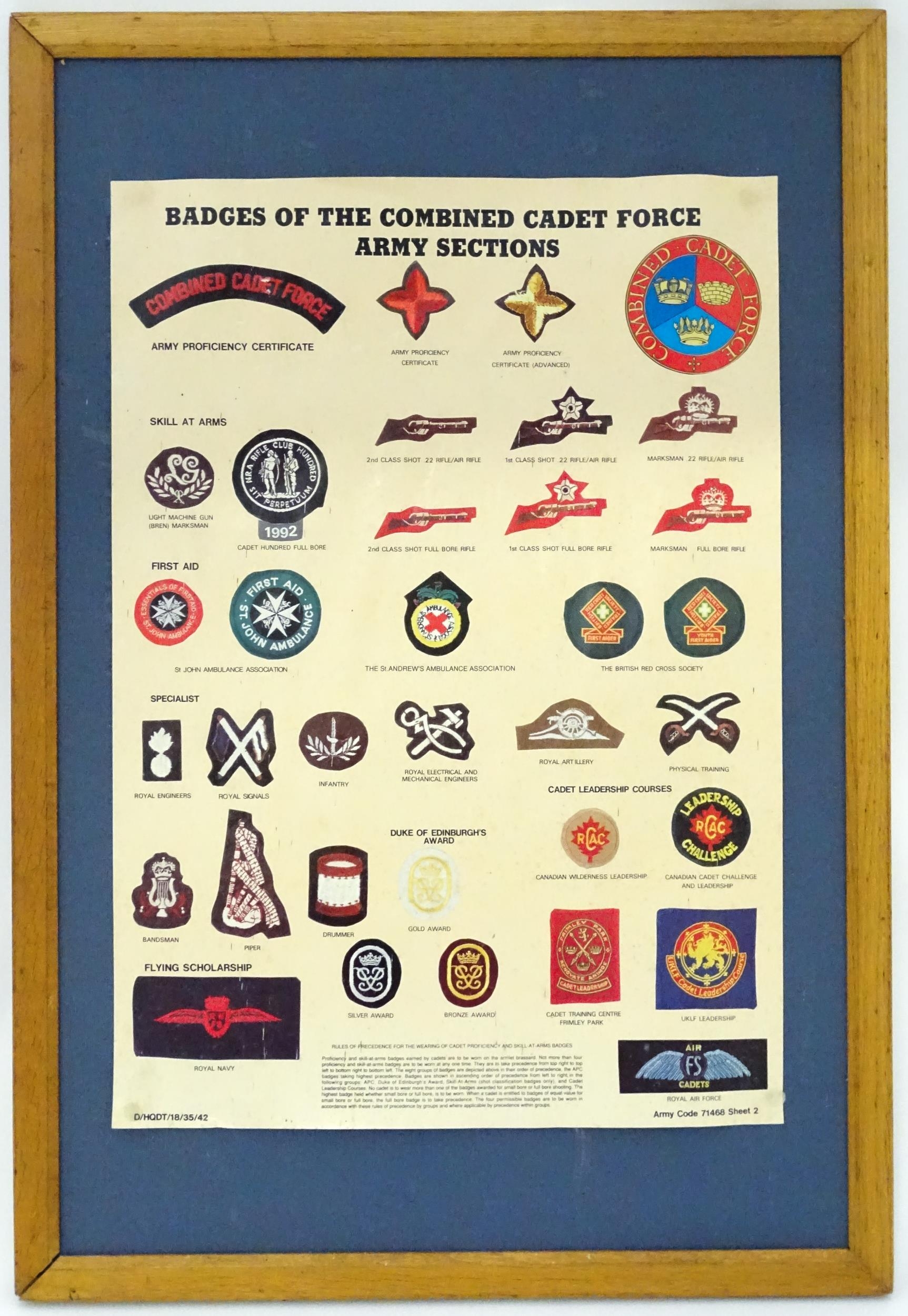 Militaria : a mid 20thC Army poster depicting CCF cadet badges, the frame marked on the reverse with EIIR crown cipher and dated 1961. Approx 23 1/2" x 16 3/8"