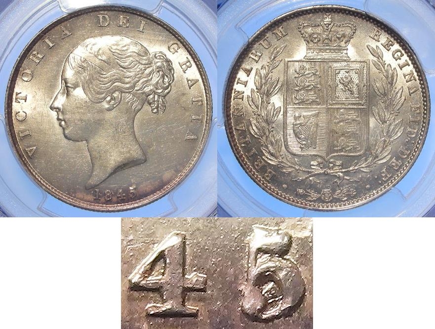 Halfcrown 1845/3 UNC, extremely rare especially in this grade. Slabbed PCGS MS63 as '1845 blundered 5' but the overdate is published in Spink under S.3888 and in ESC as #2723.