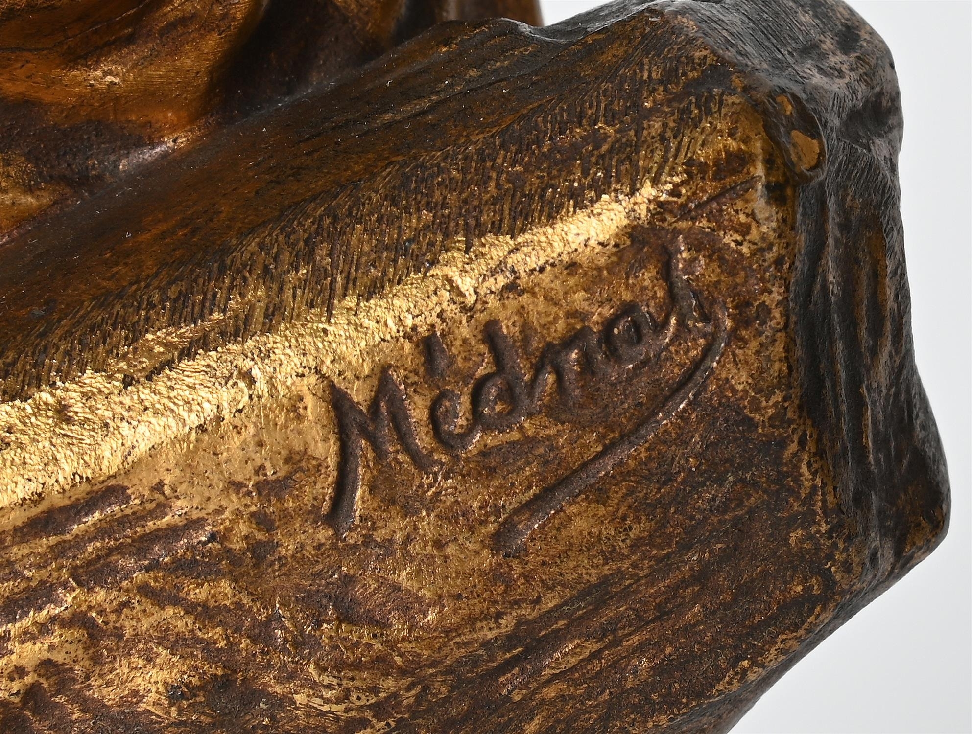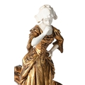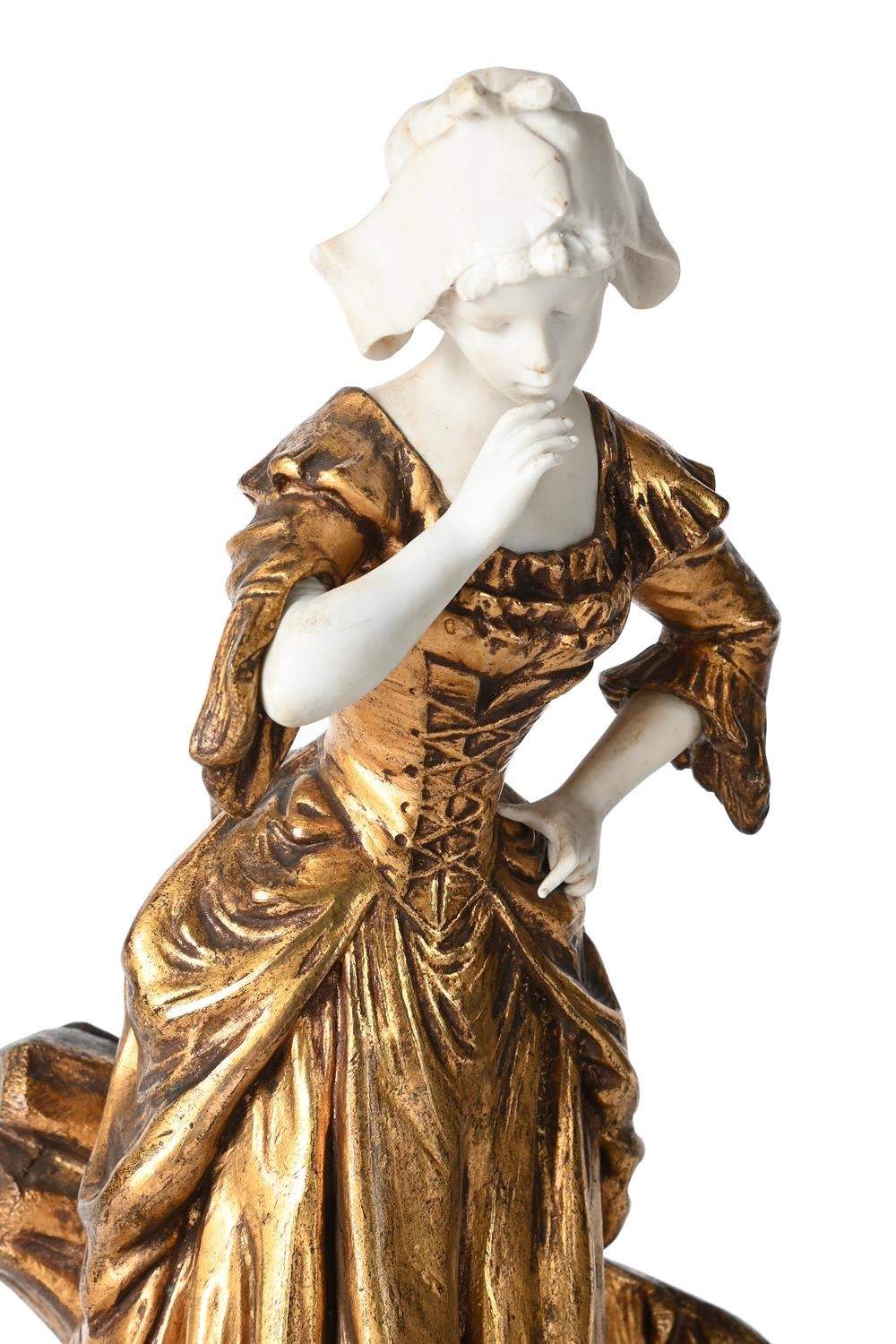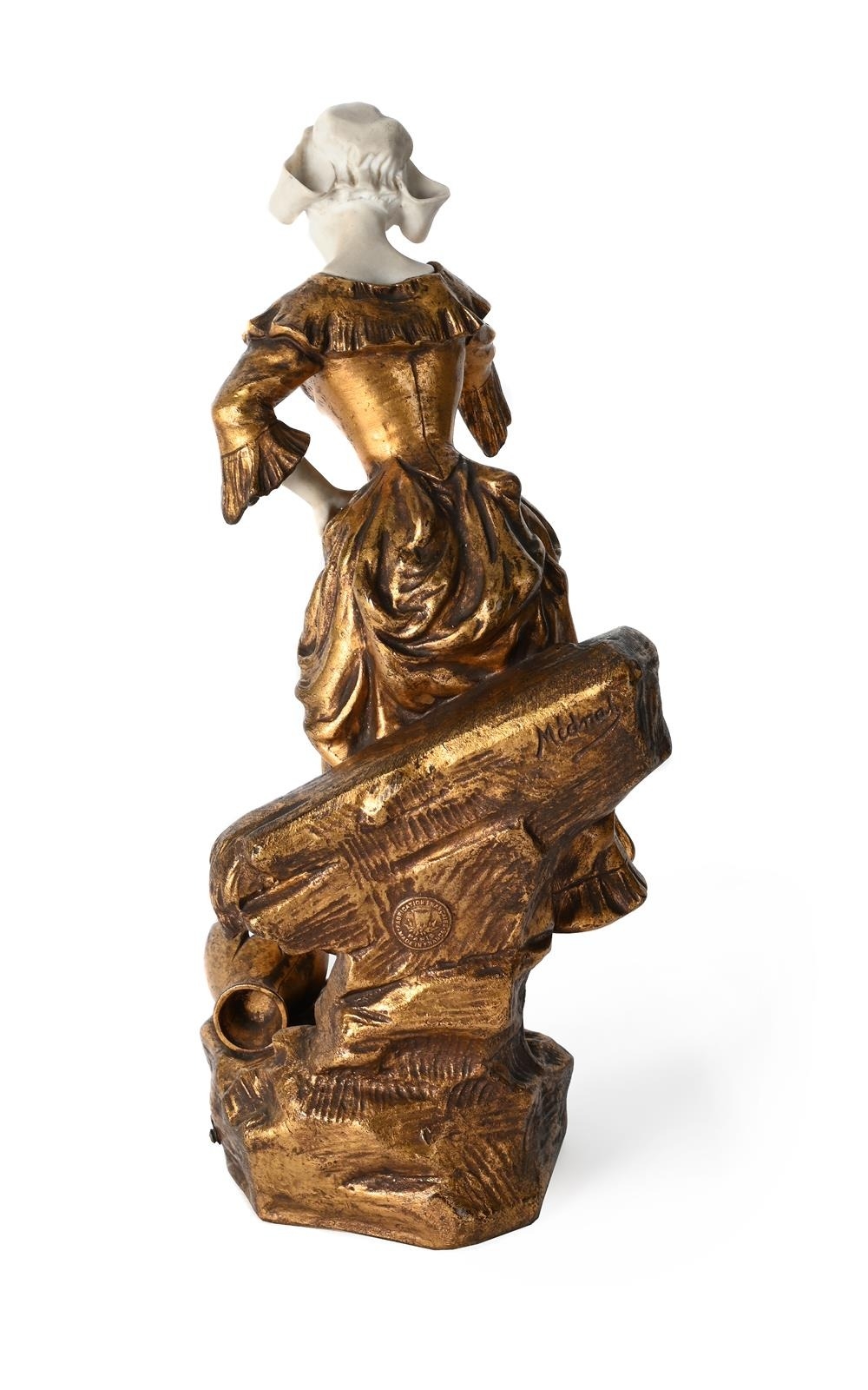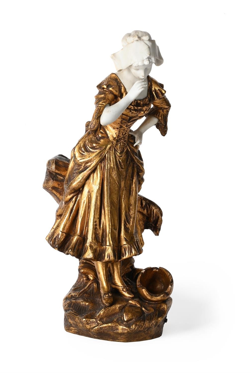 MEDNOT, A GILT METAL AND BISQUE PORCELAIN FIGURE 'LA CRUCHE CASSEE' FRENCH, EARLY OR MID 20TH CENTURY Modelled as a milkmaid with broken pitcher at her feet, signed to cast, French medallion to reverse 28cm high