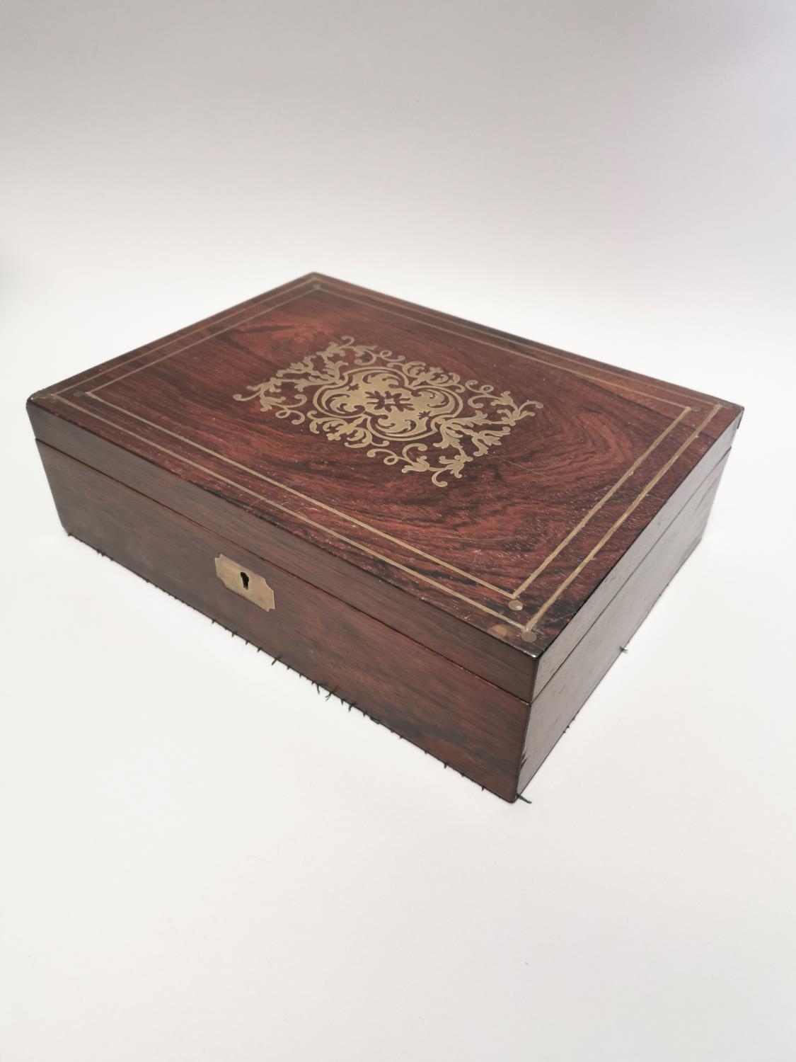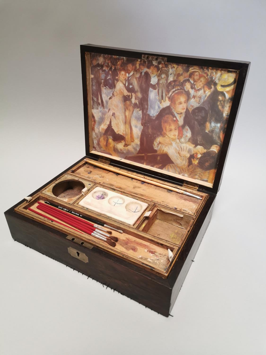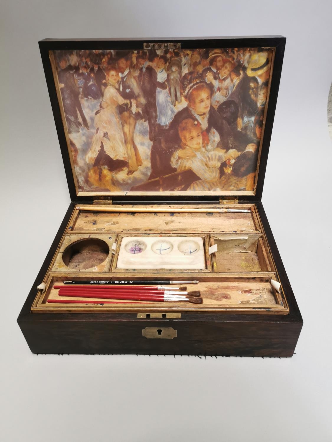 19th. C. rosewood artist's box { 9cm H X 32cm W X 24cm D }.