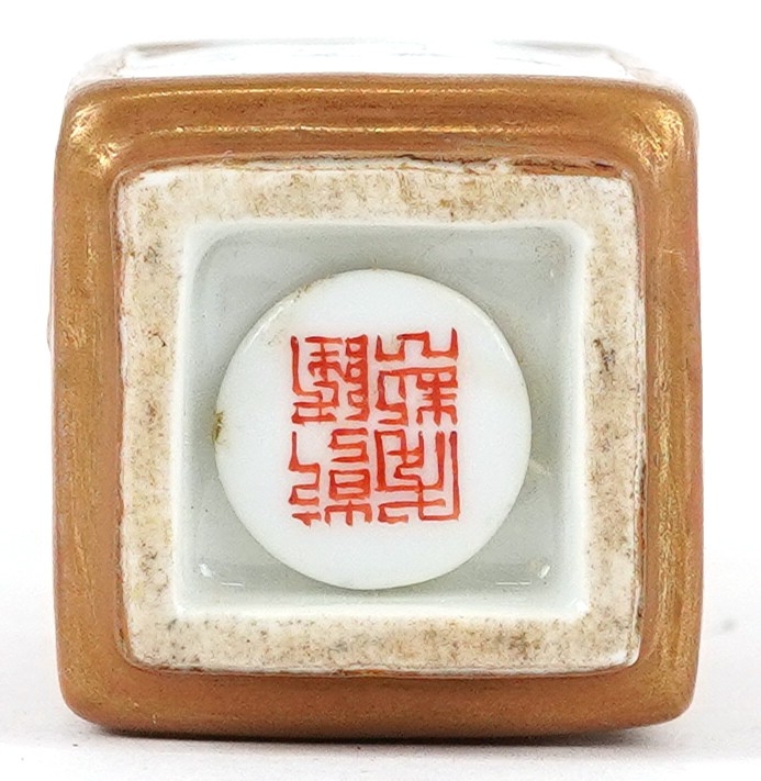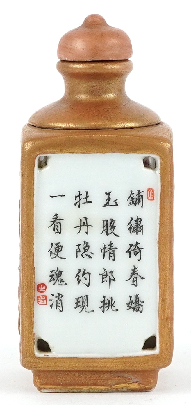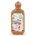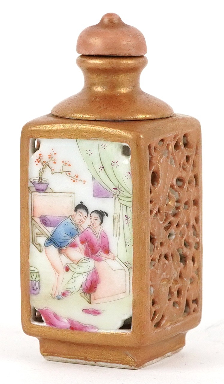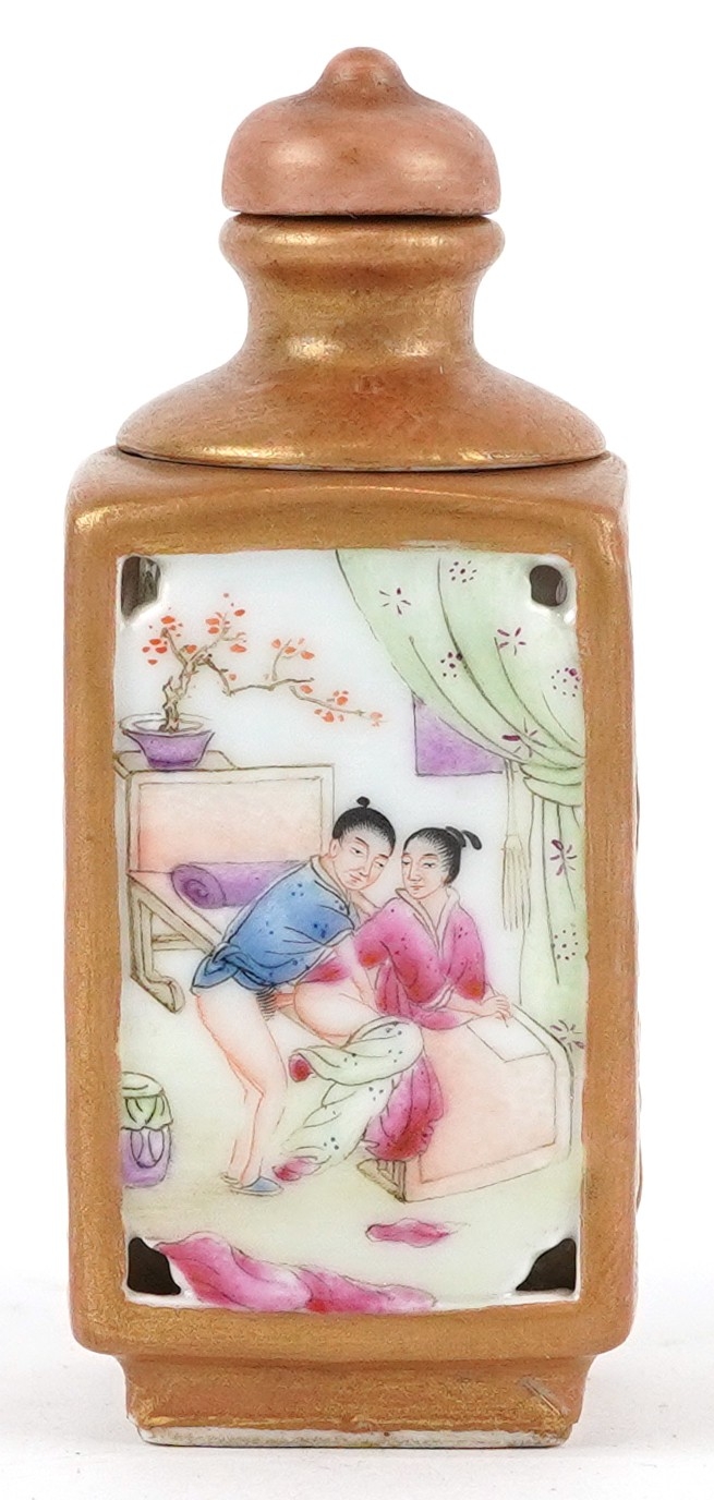 A Chinese porcelain scent bottle hand painted with an erotic scene and inscription, character marks to the base, 7cm high.