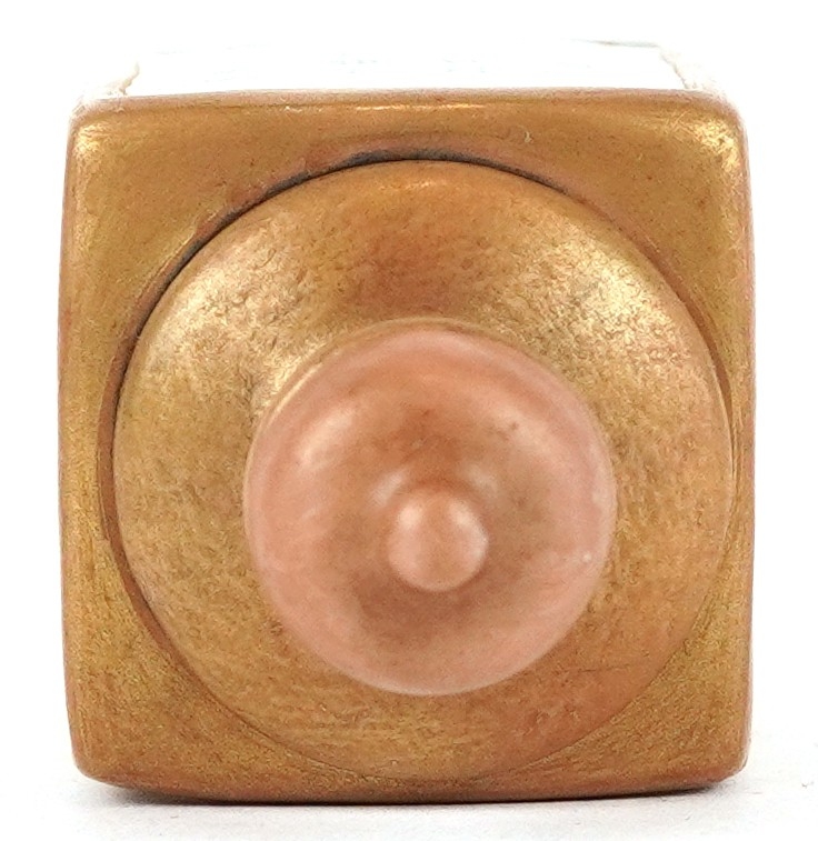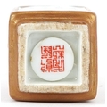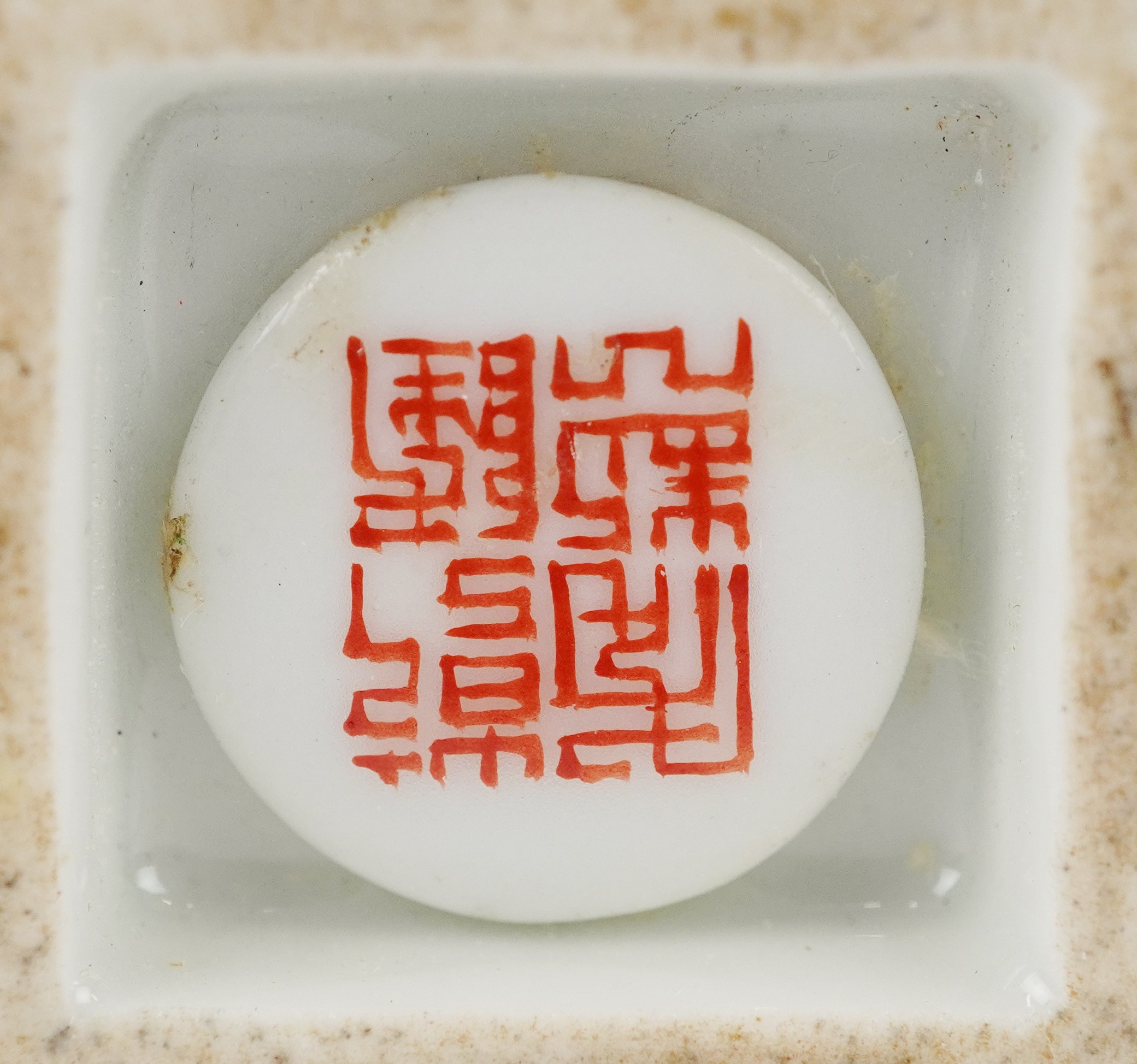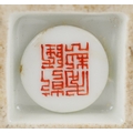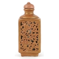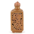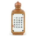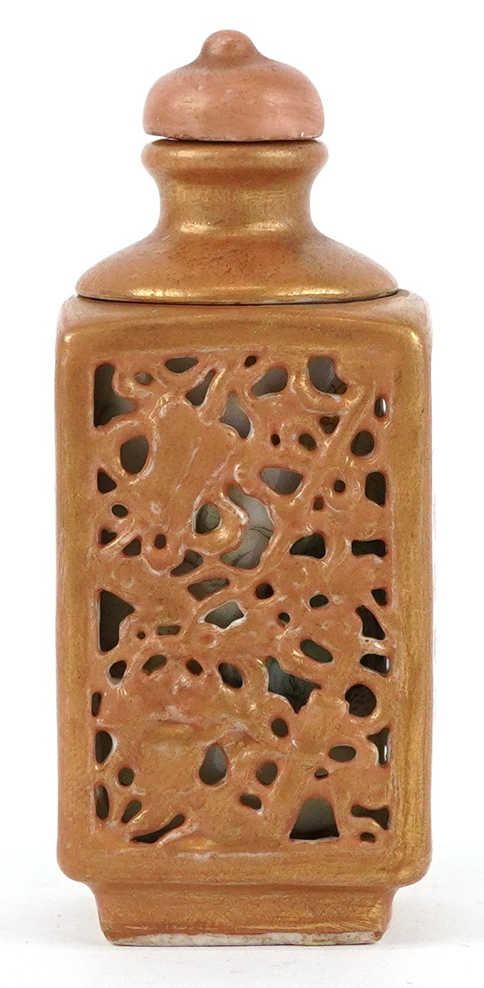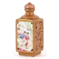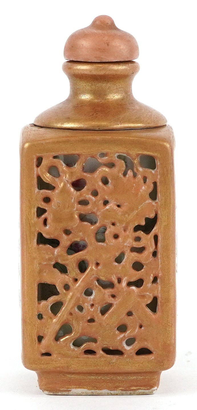 A Chinese porcelain scent bottle hand painted with an erotic scene and inscription, character marks to the base, 7cm high.
