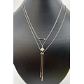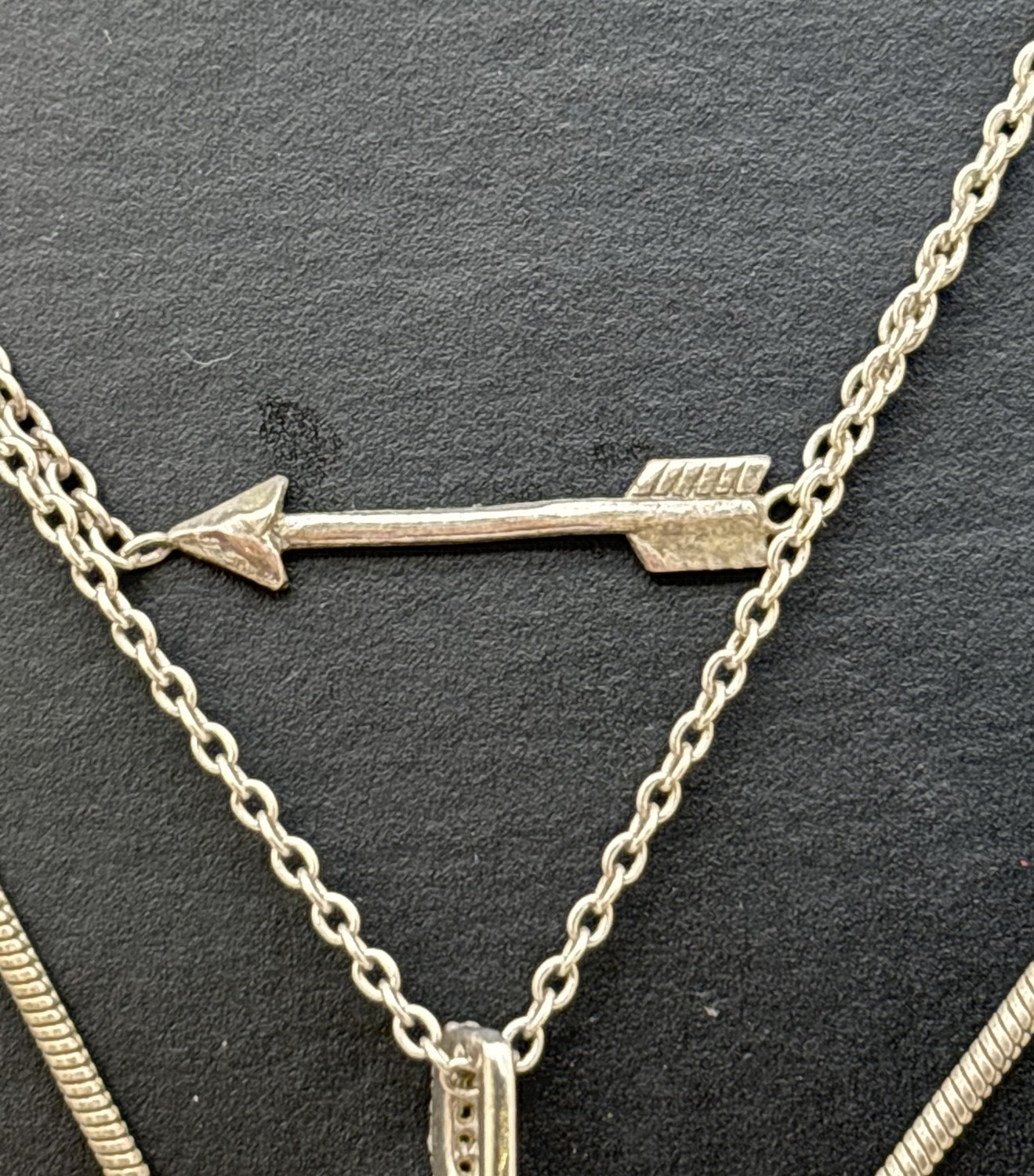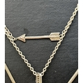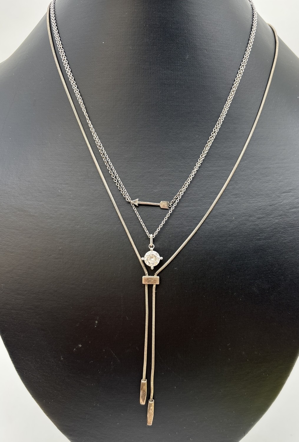 3 silver pendant necklaces. A 16" belcher chain with fixed arrow pendant; an 18" belcher chain with clear stone set solitaire pendant; and a 24" snake chain necklace with capped chain double drop. All clasps or fixings marked 925.