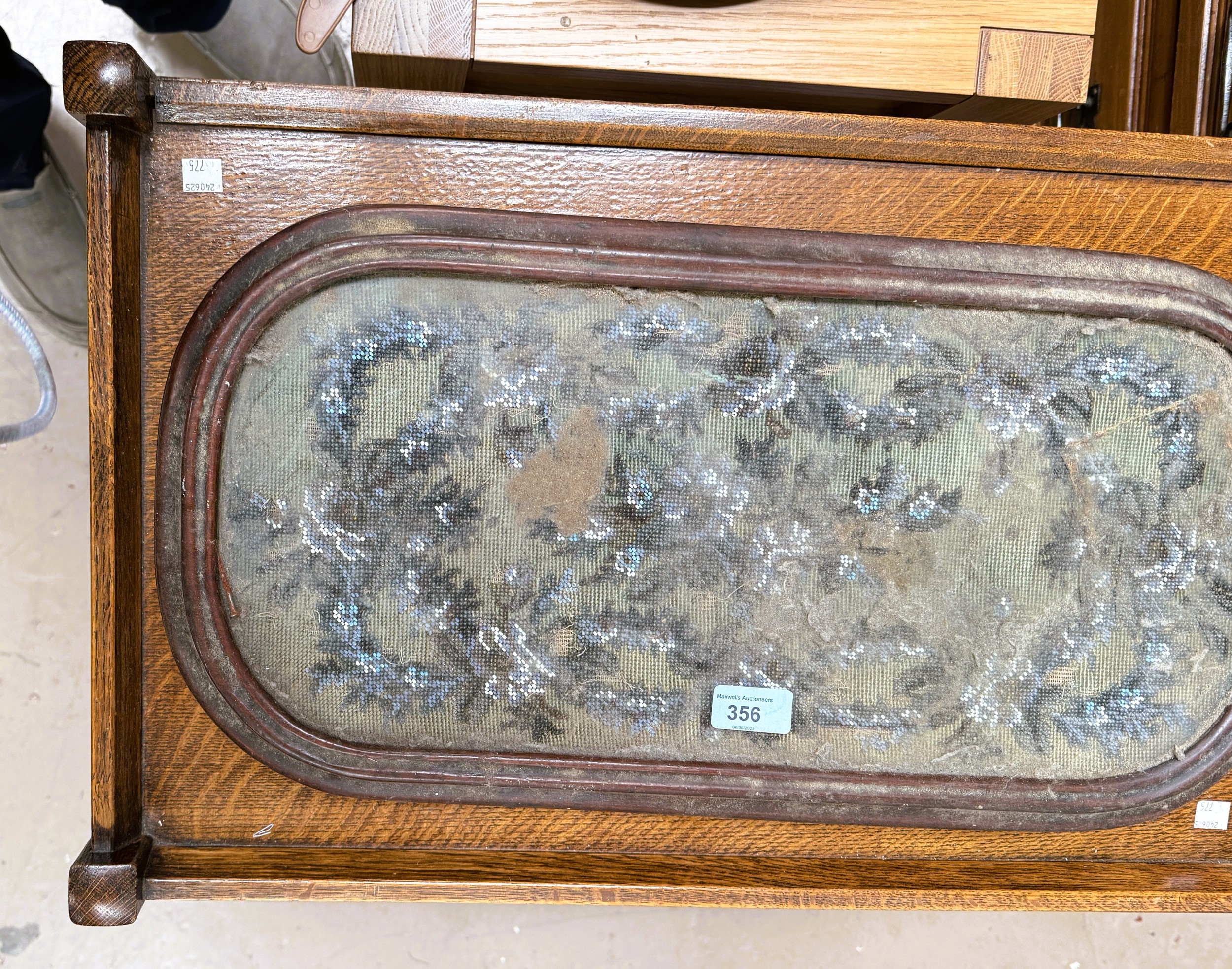 A Victorian moulded rectangular beadwork teapot stand; a pair of 18th century style prints of children in ornate frames, height overall 44cm & a similar pair.