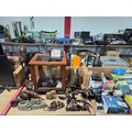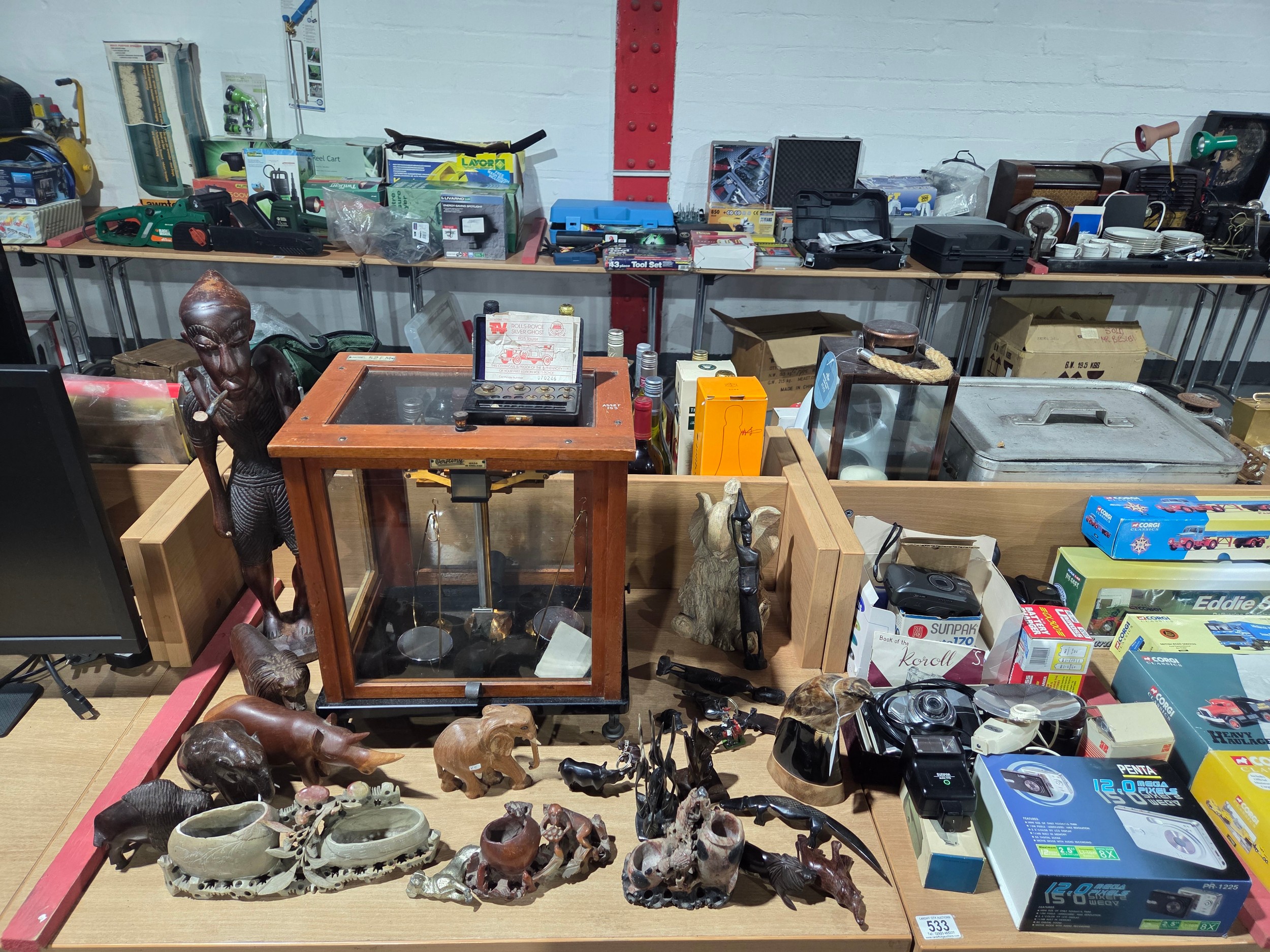 A cased scientific scales, vintage cameras, wooden items, soapstone carvings, etc