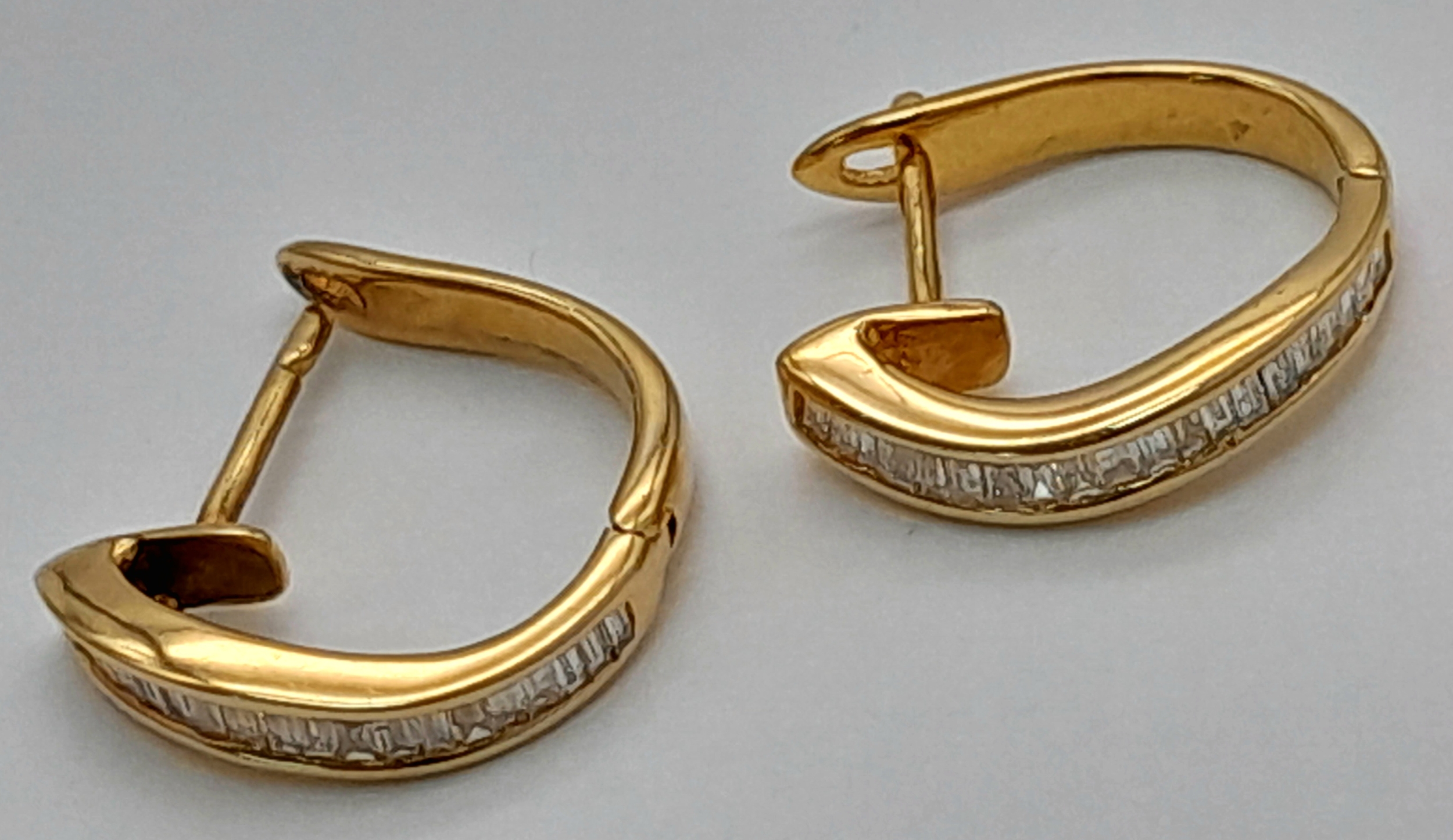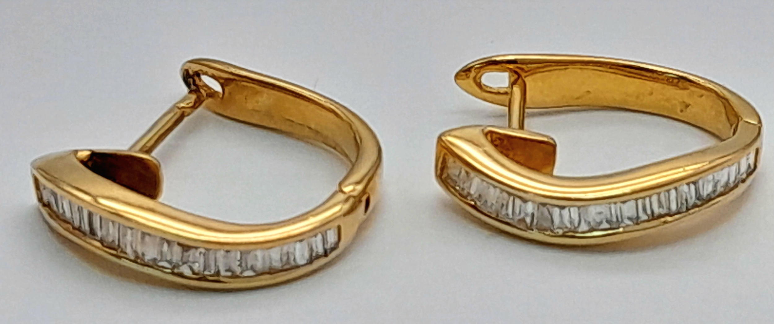 A PAIR OF 18K YELOW GOLD BAGUETTE CUT DIAMOND SET HOOP EARRINGS. TOTAL WEIGHT 2.3G. DIAMOND WEIGHT 0.25CT. SC 8064