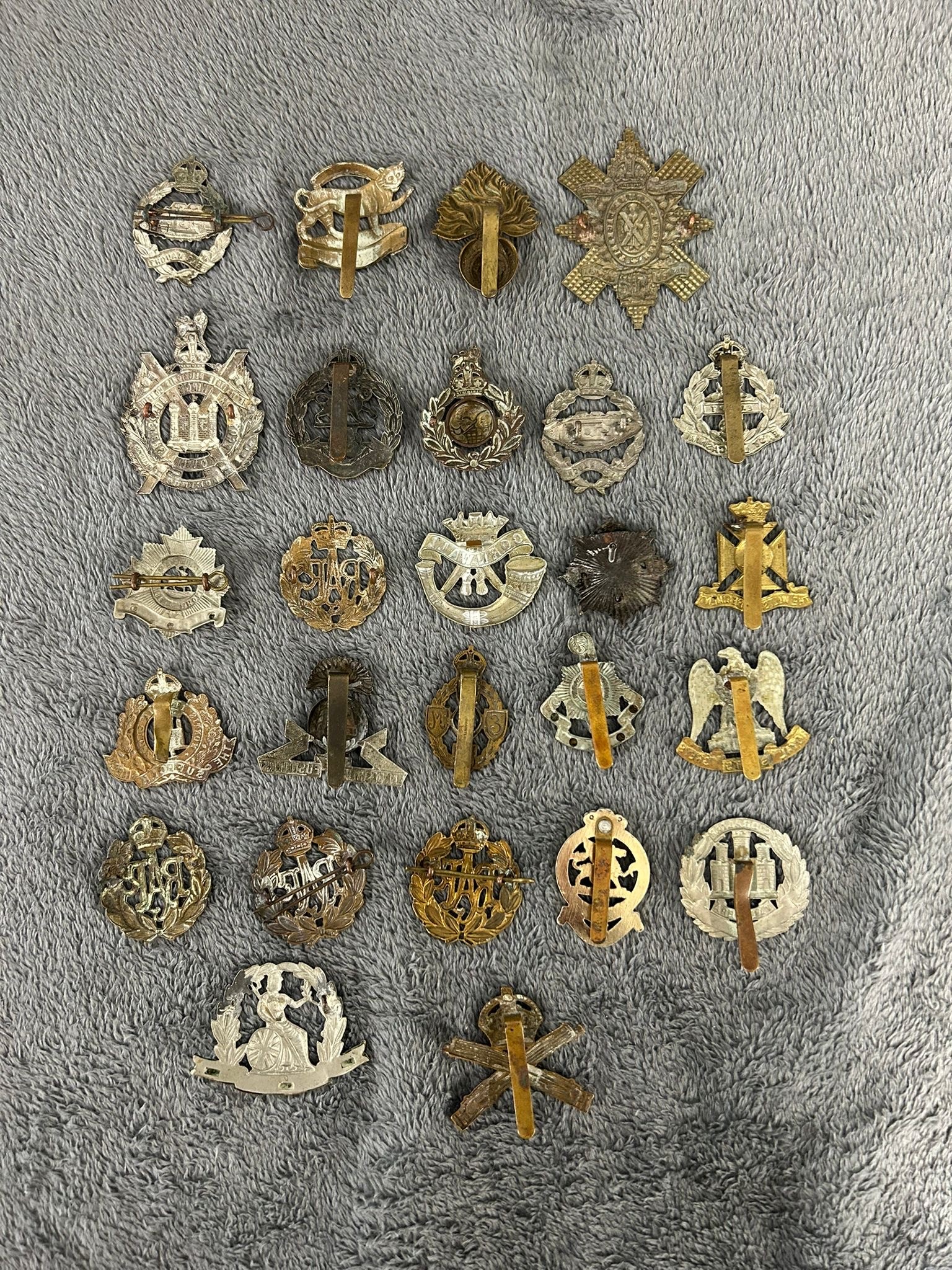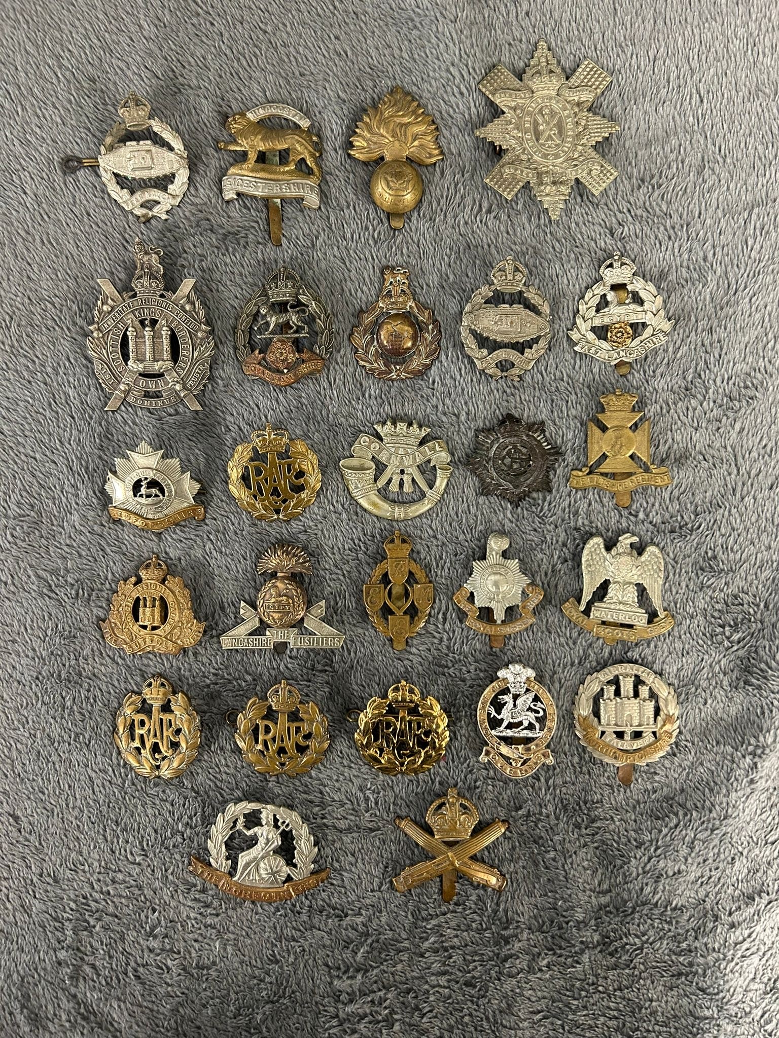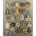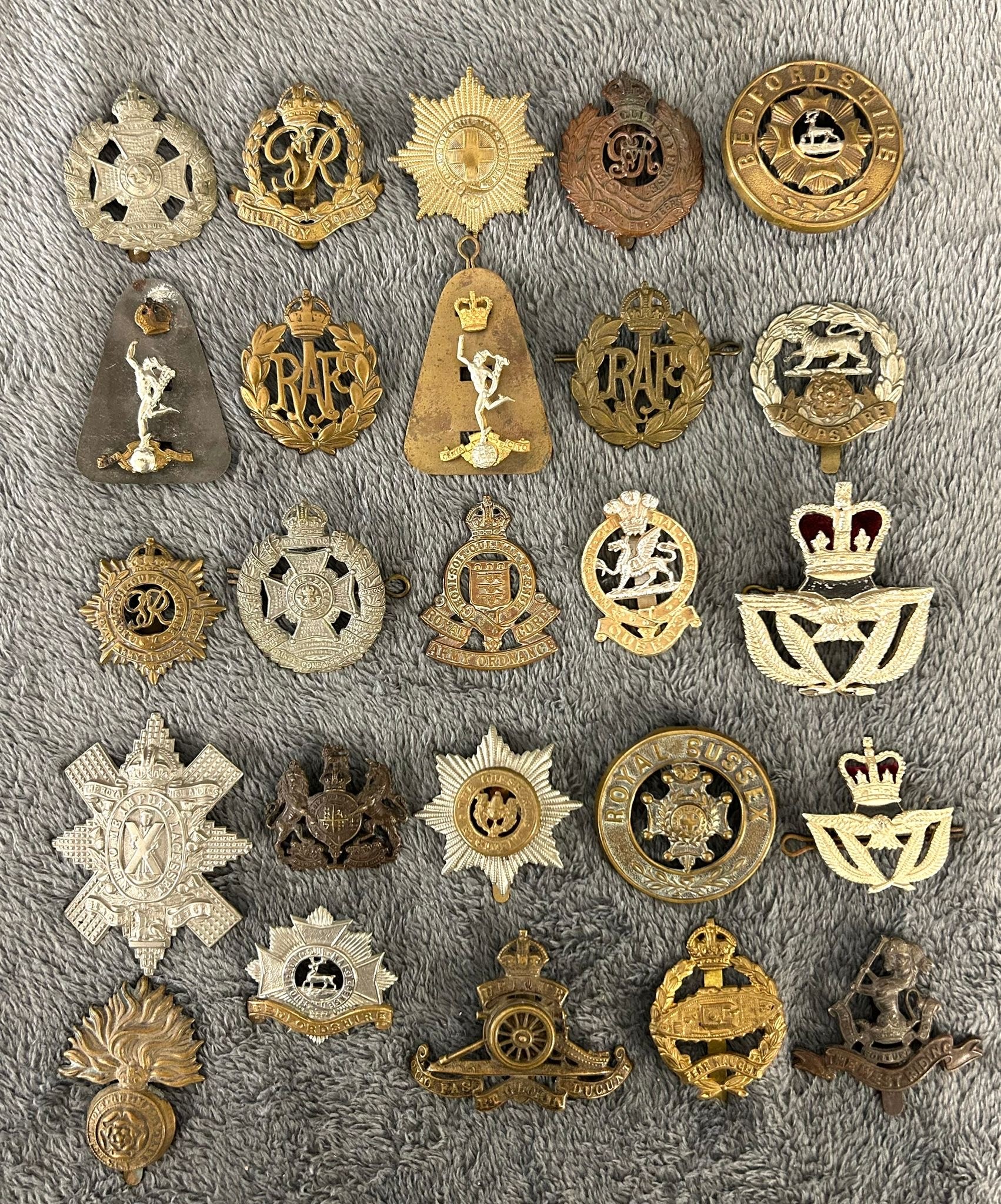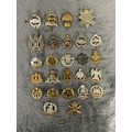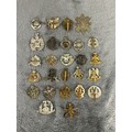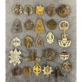 Two OR's HPCs of the Bedfordshire and Royal Sussex Regiments (several loops missing); also approx. 50 military cap badges, mostly regular infantry including all-brass Suffolk Regiment (slider AF). Generally GC, some lacking lugs or sliders, some worn.