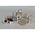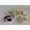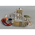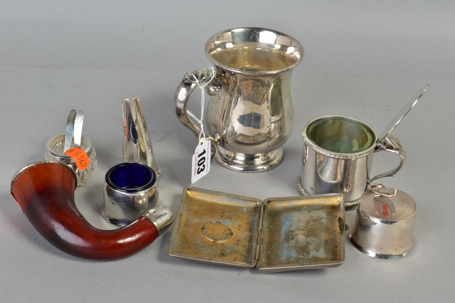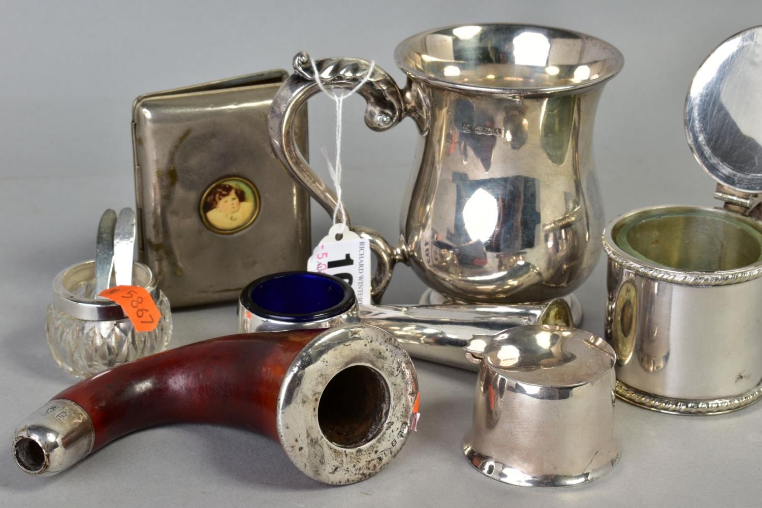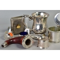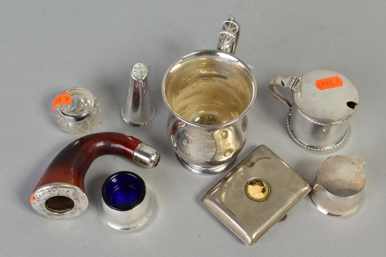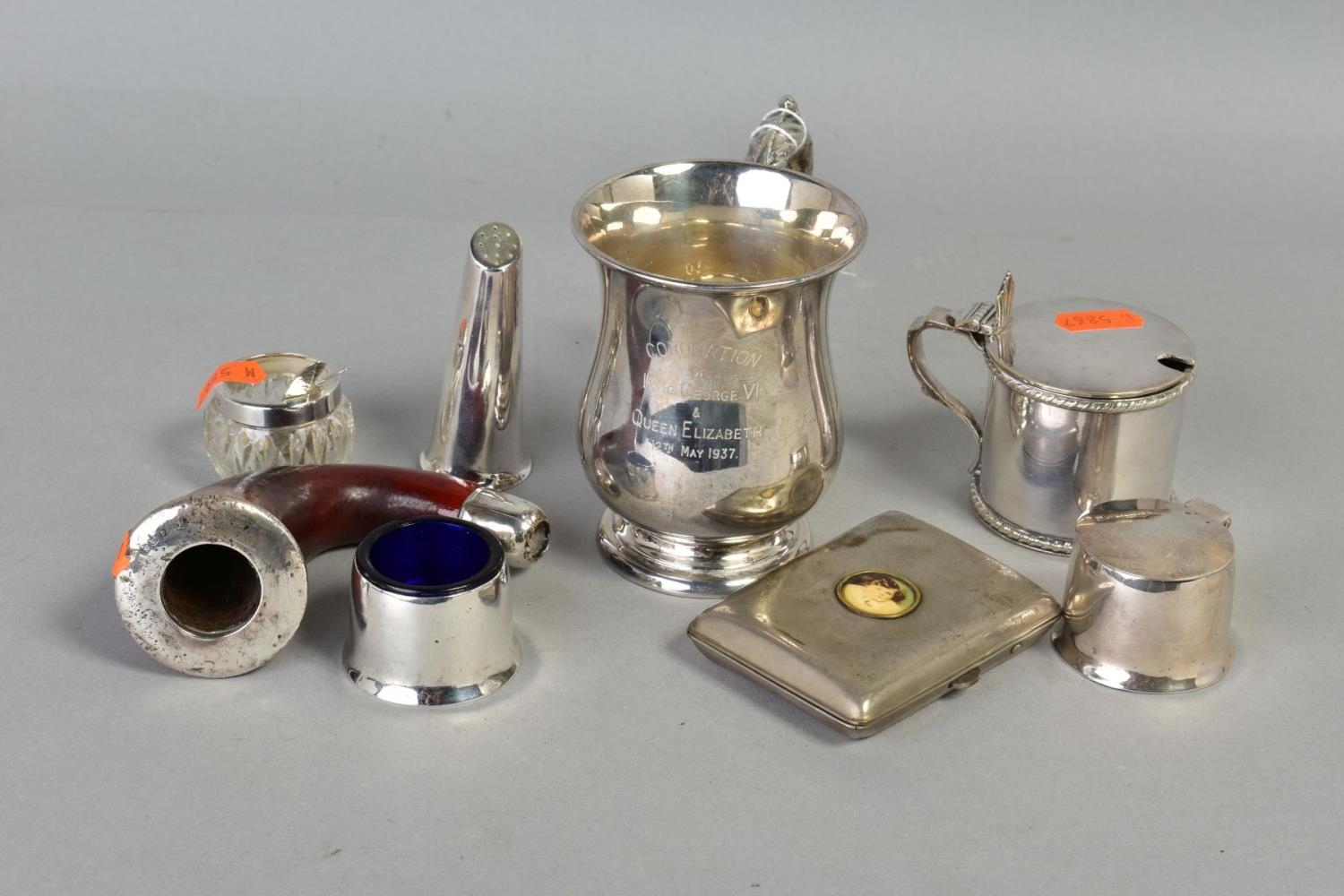A PARCEL OF SILVER AND PLATE, including a George V silver mug of baluster form, bears inscription to body and underside, makers John Tuton & Co, Sheffield 1936, a silver mounted pipe lacking mouthpiece, a plain circular three piece cruet set comprising silver open salt matching covered mustard and pepperette, sponsors British Airways Executive Club, Birmingham 1983, an EPNS drum shaped mustard, etc, approximate gross weight of weighable silver 9.65ozt, 300.2 grams (parcel)