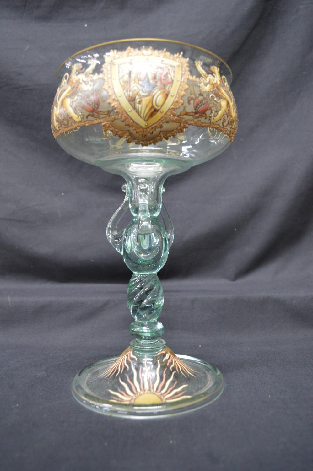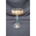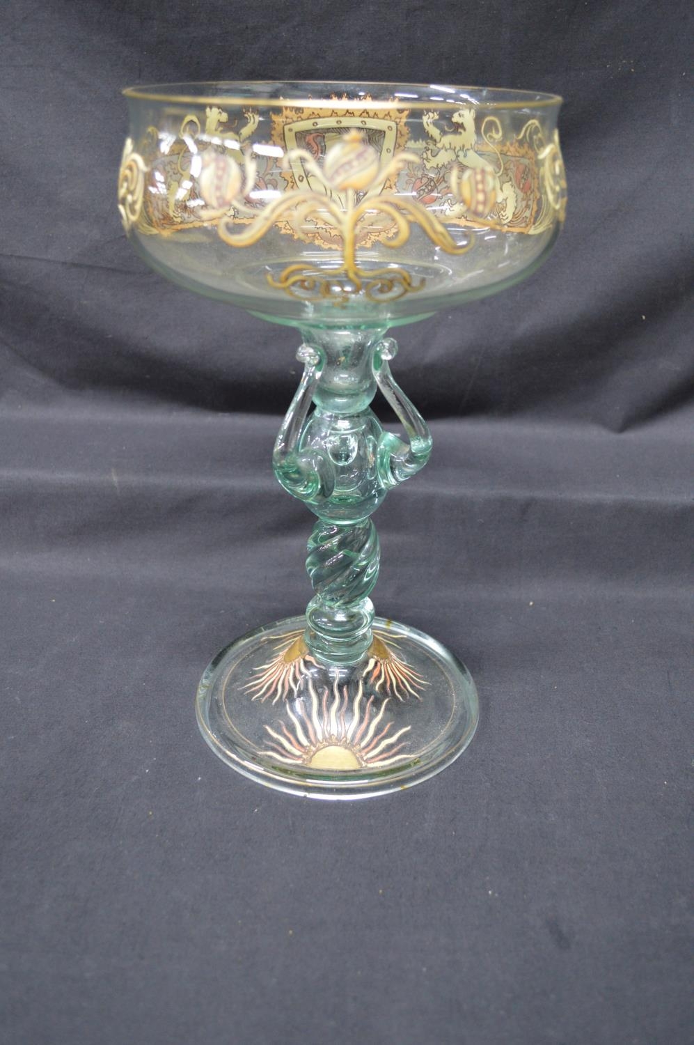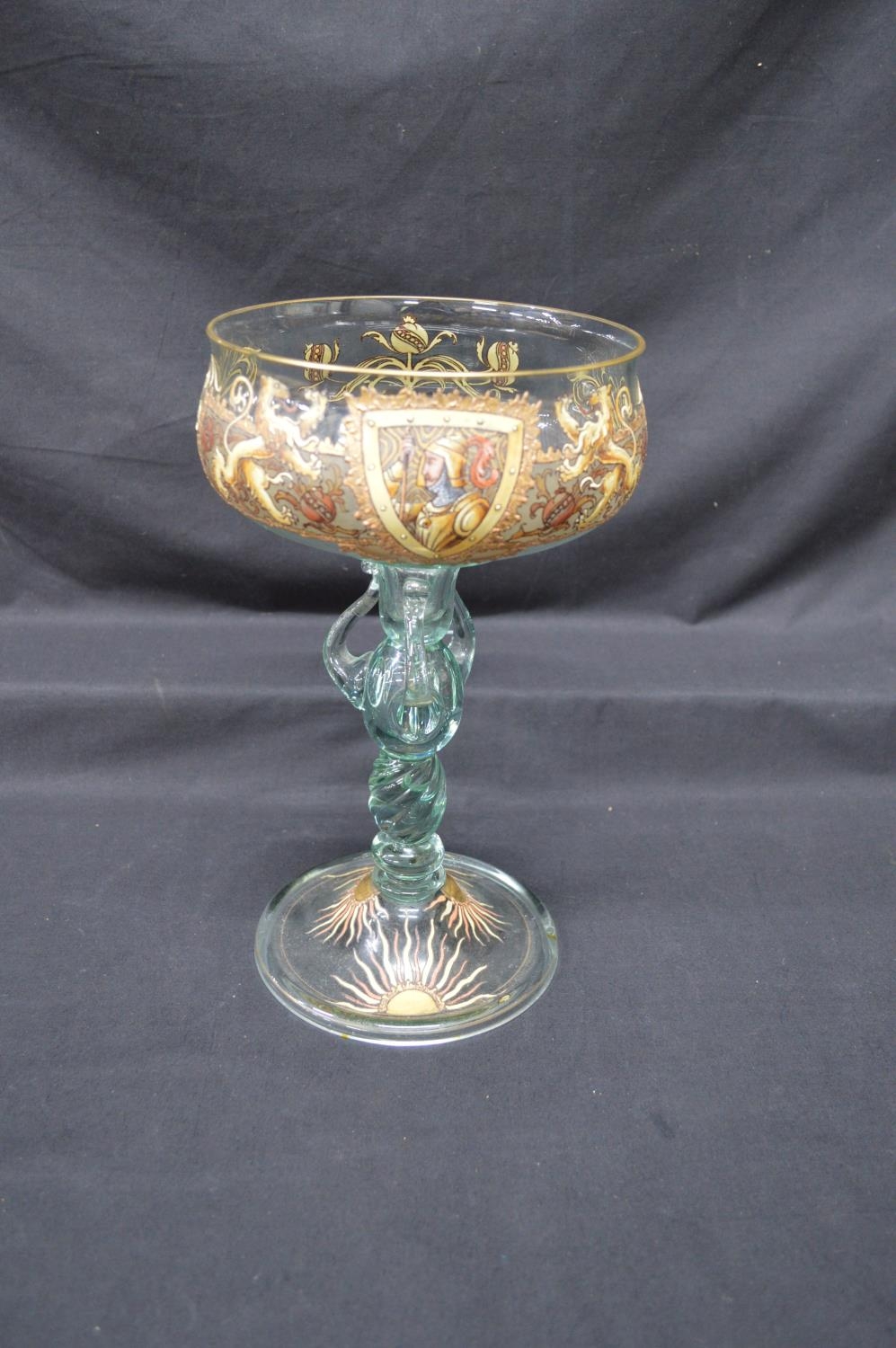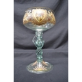 Glass chalice having hand painted enamel decoration, standing on conical circular base - 11.5" tall