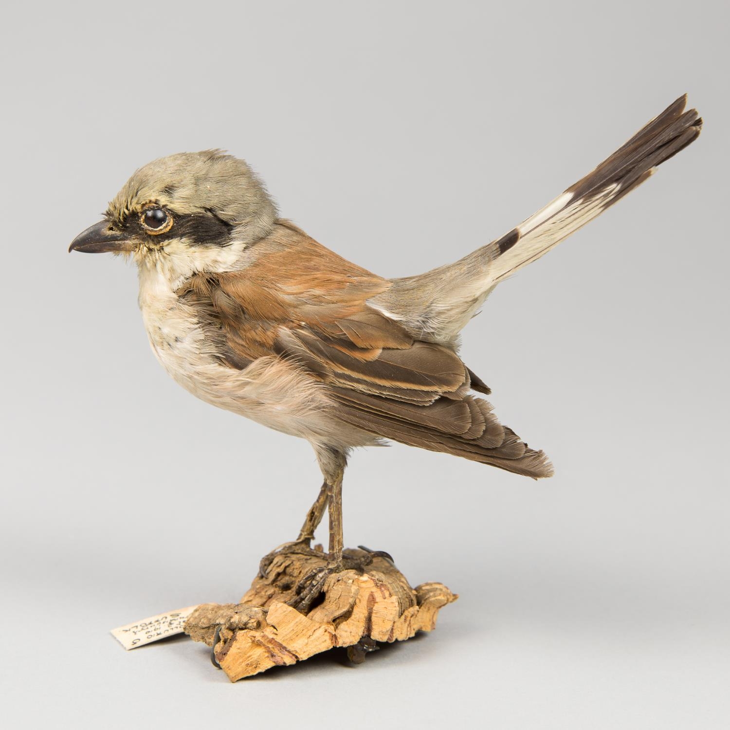 AN EARLY 20TH CENTURY TAXIDERMY RED-BACKED SHRIKE UPON A NATURALISTIC BASE.
