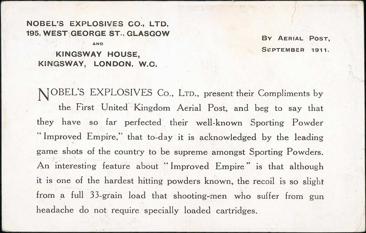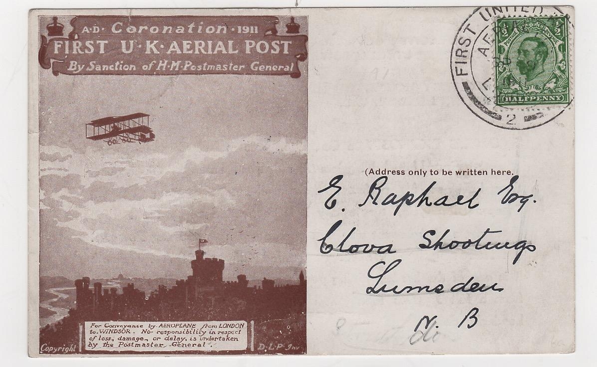 1911 (Sep 9) Brown London postcard with Nobels Explosives advert printed on the reverse, used with Aerial Post c.d.s code "2" to "Clova Shootings, Lumsden, N.B", minor creasing and two small edge tears, a very scarce advert. Photo on Page 12.