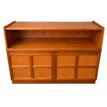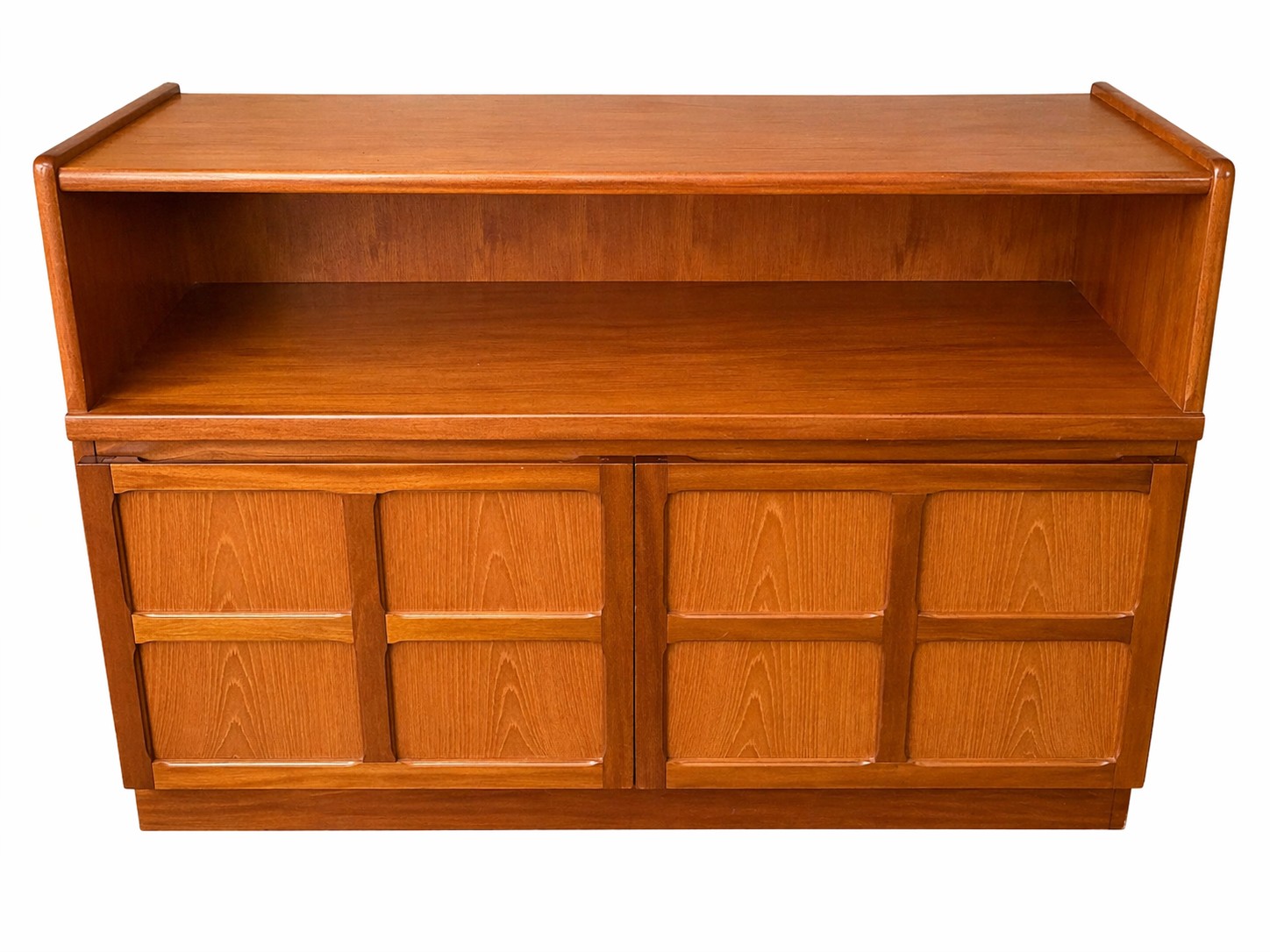 Mid Century Teak Nathan unit, the rectangular surface over an open shelf and two cupboard doors