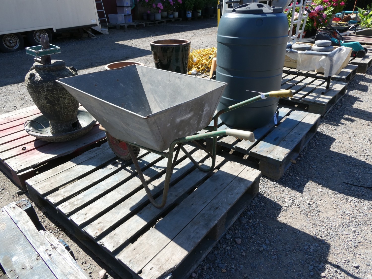 A galvanised garden wheelbarrow