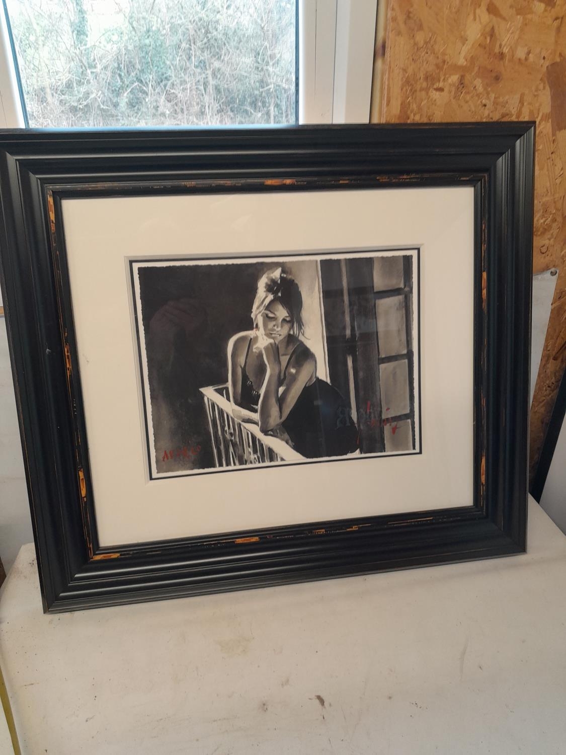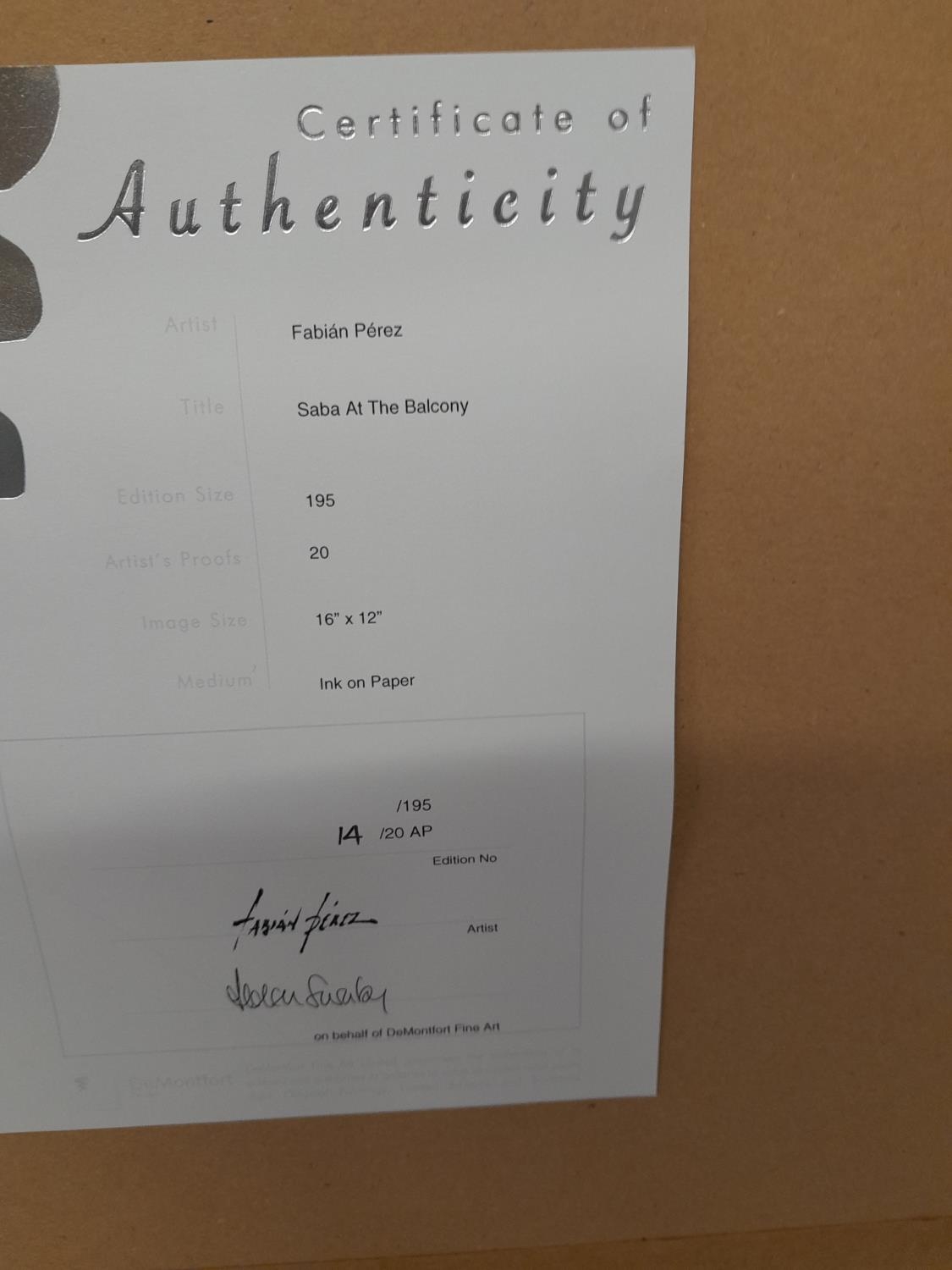 Fabian Perez, Saba at the Balcony, limited edition giclée black and white print 14/20, signed and COA verso, distributed by DeMontfort Fine Art, framed and glazed overall measurements including frame 68 cms x 77 cms, print measures 31 cms x 41 cms