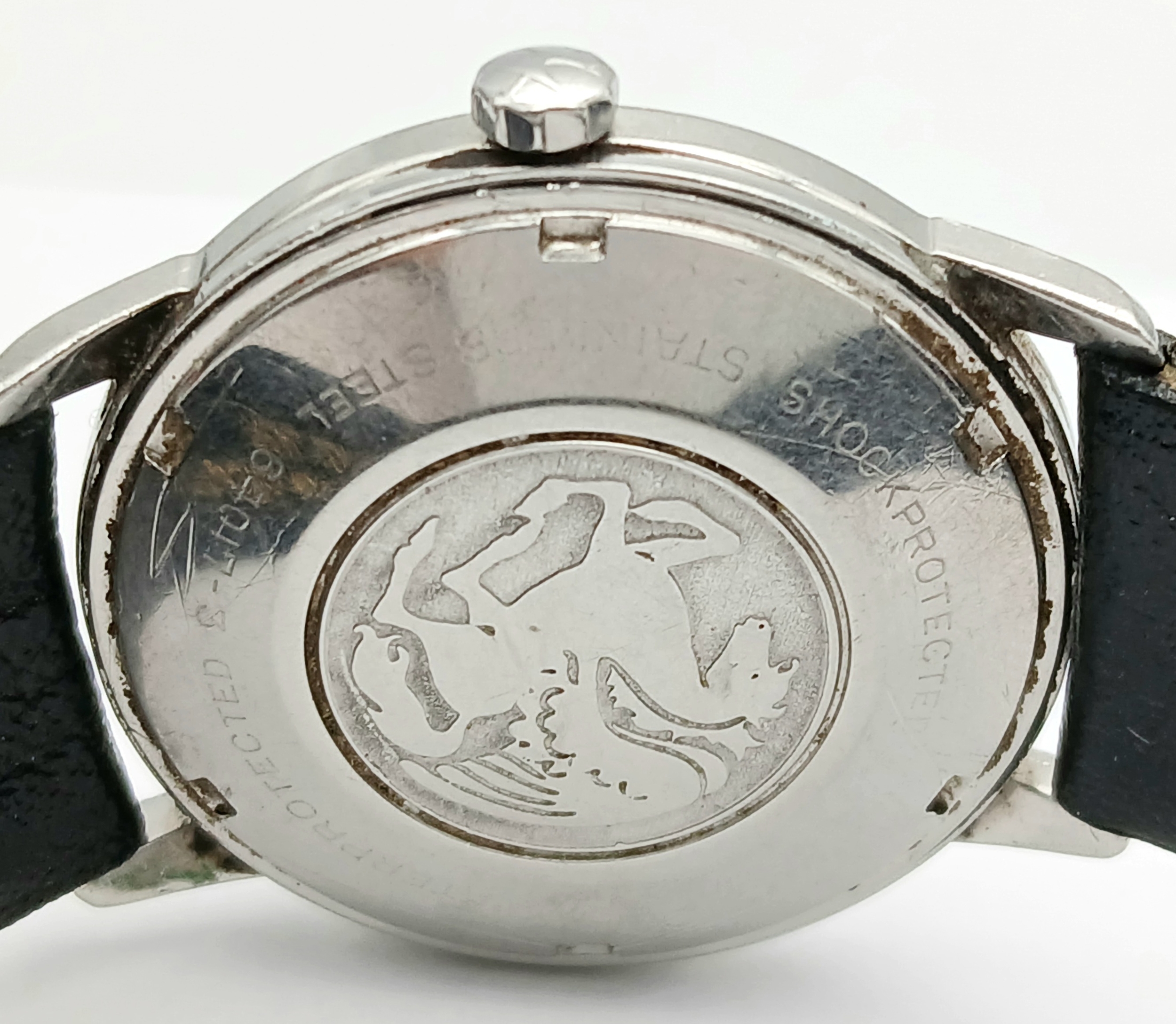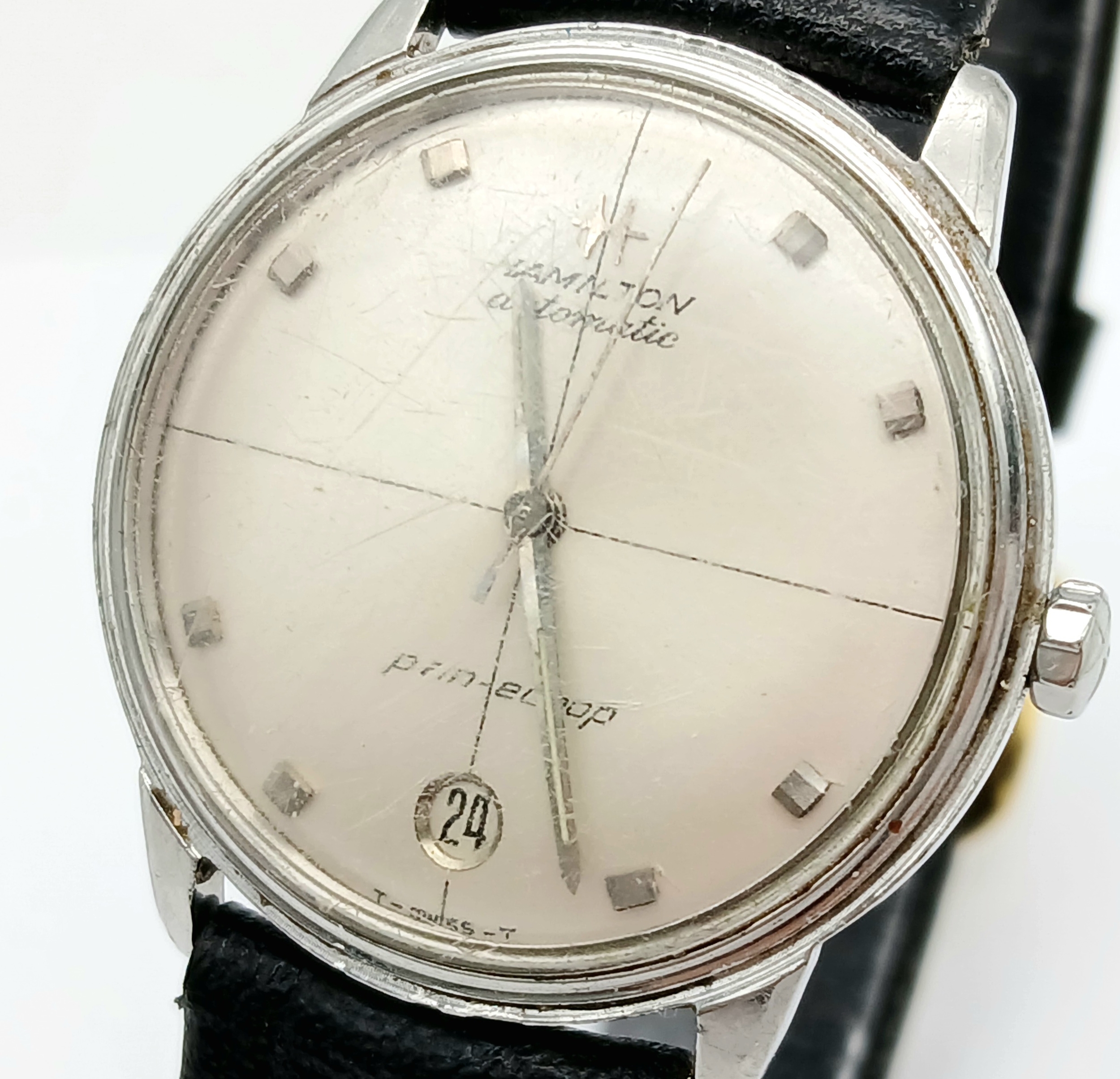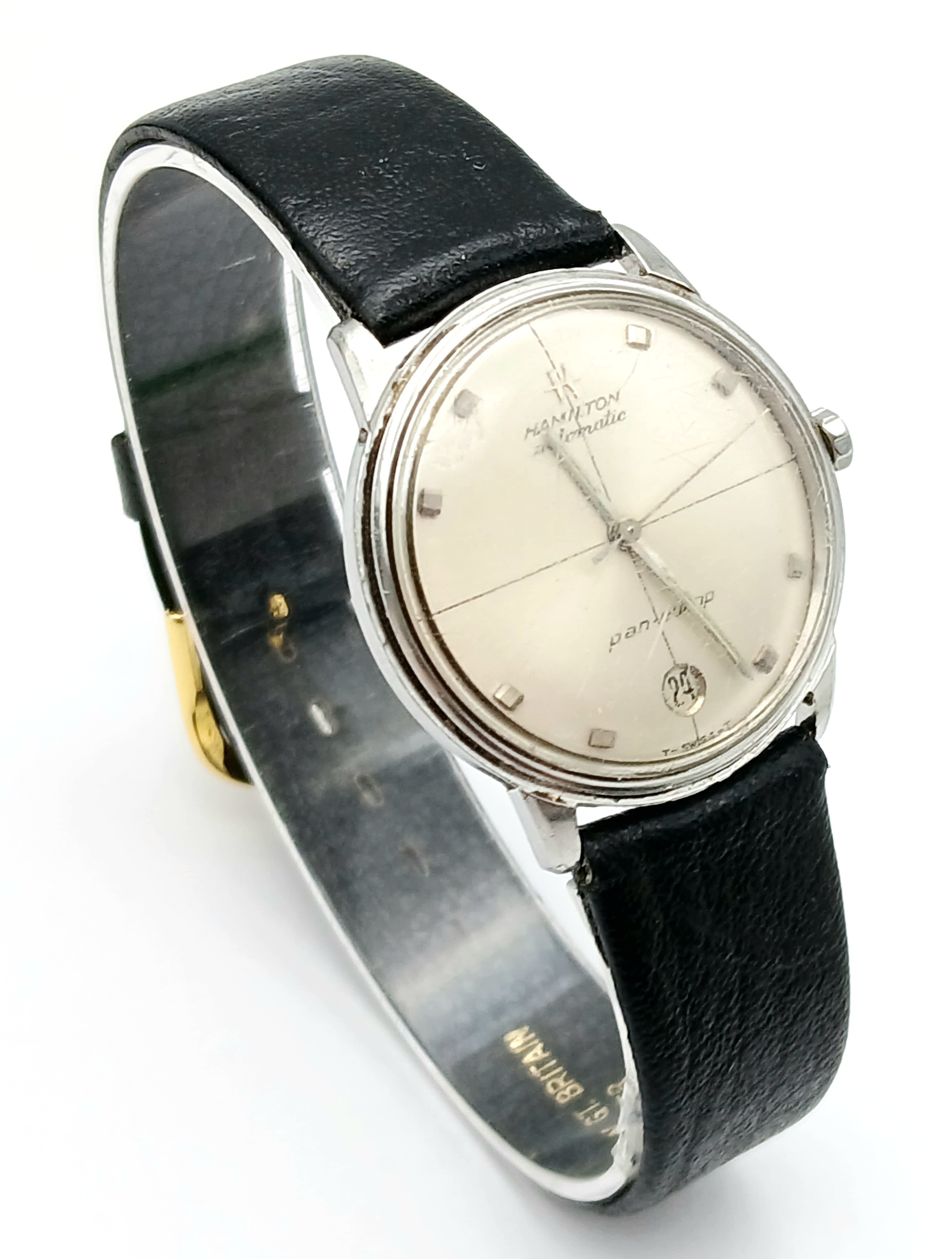Gentleman’s HAMILTON AUTOMATIC WRISTWATCH. Black leather strap . Circular Date window at 6 o’clock. Glass Scratched. Full working order.