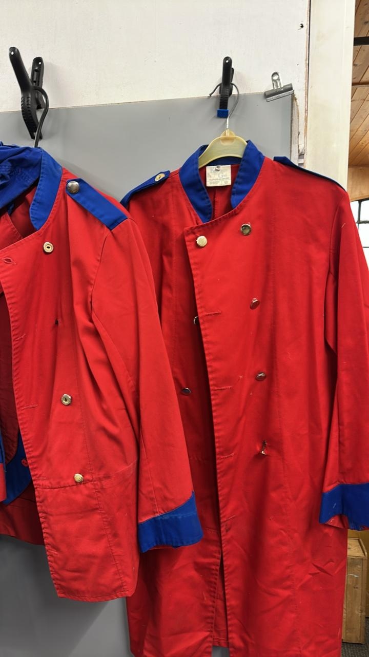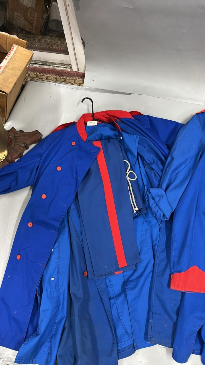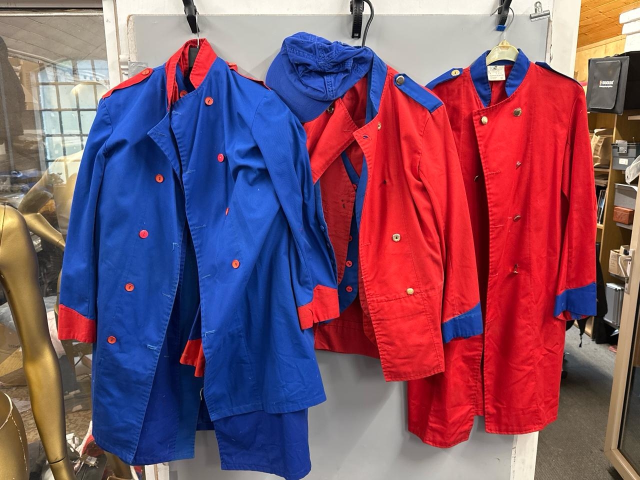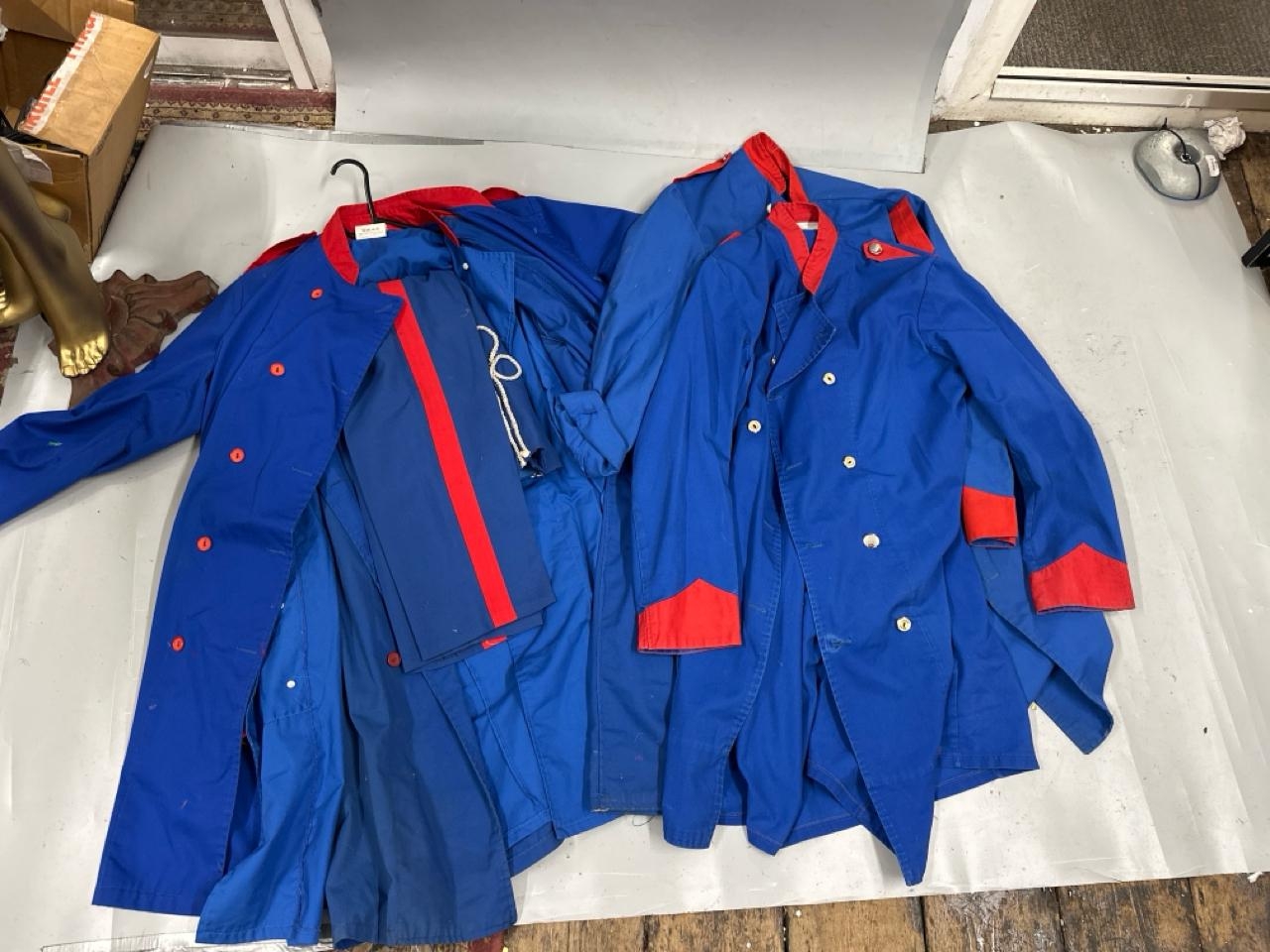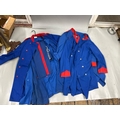 A collection of 'stage worn' military style circus costume 3/4 length jackets, jackets, trousers and waist coats. /Rail 4