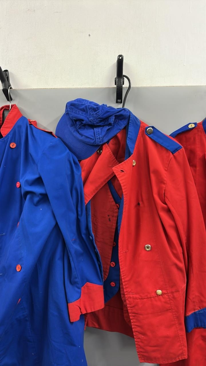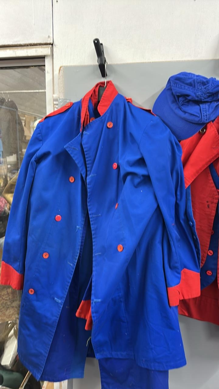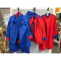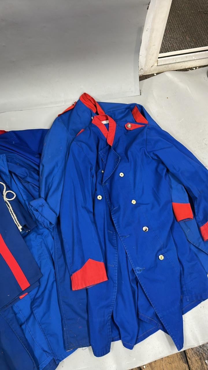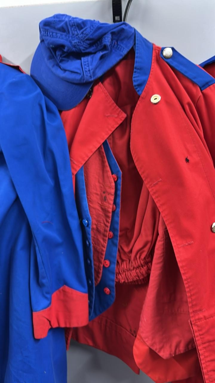 A collection of 'stage worn' military style circus costume 3/4 length jackets, jackets, trousers and waist coats. /Rail 4