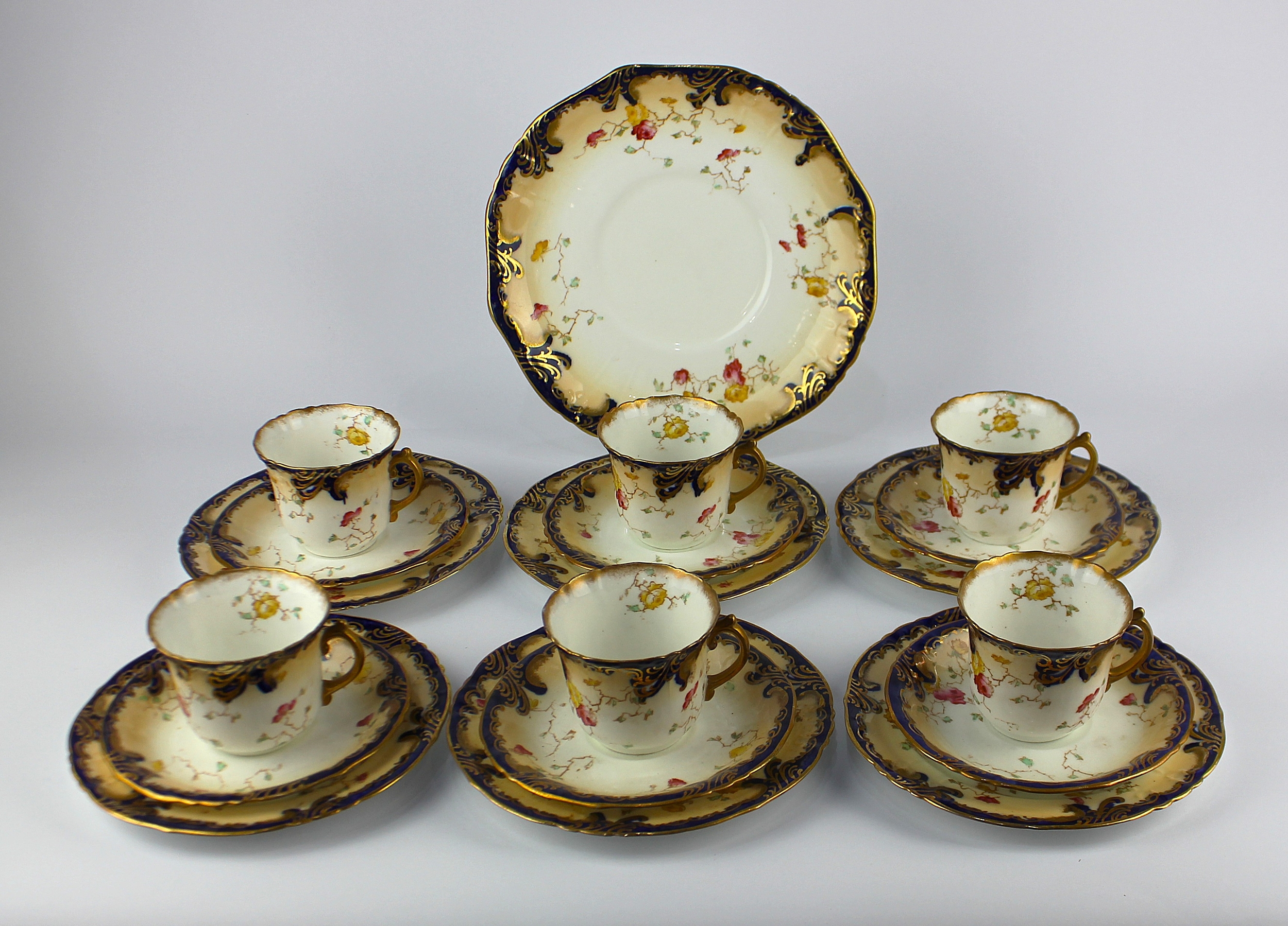 A late Victorian part tea service, comprising; six cups, six saucers, six side plate and a serving plate, unmarked, decorate with floral sprays (19)