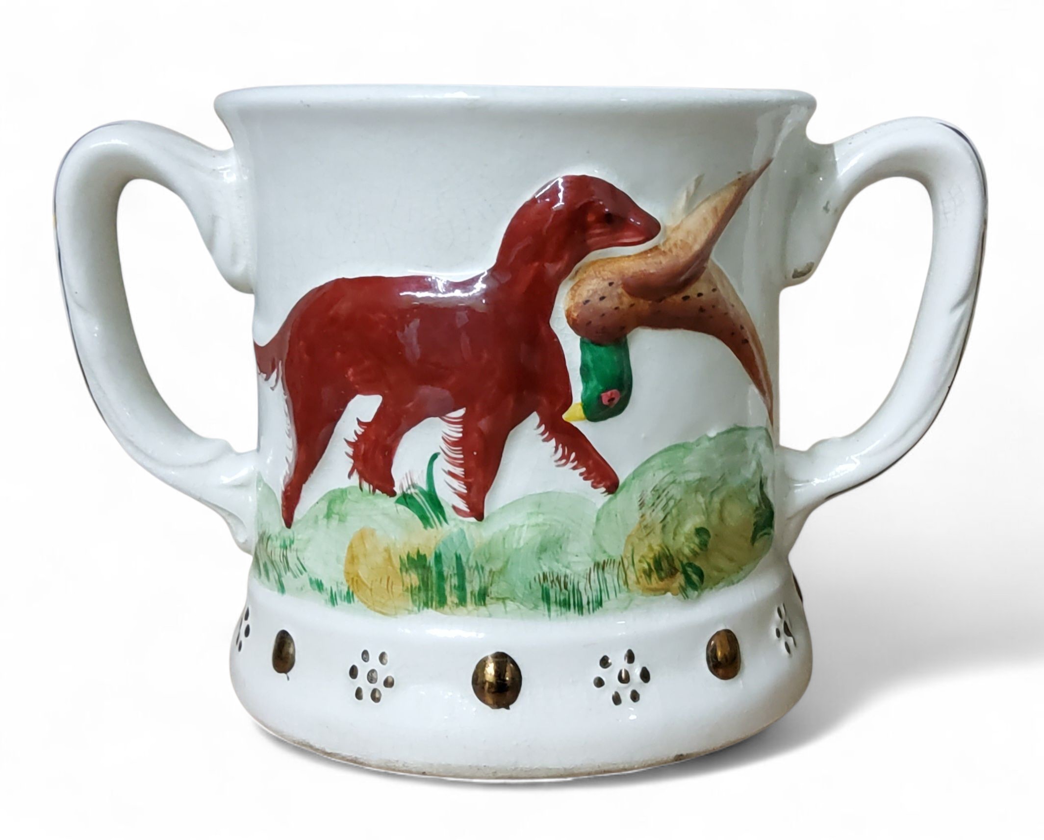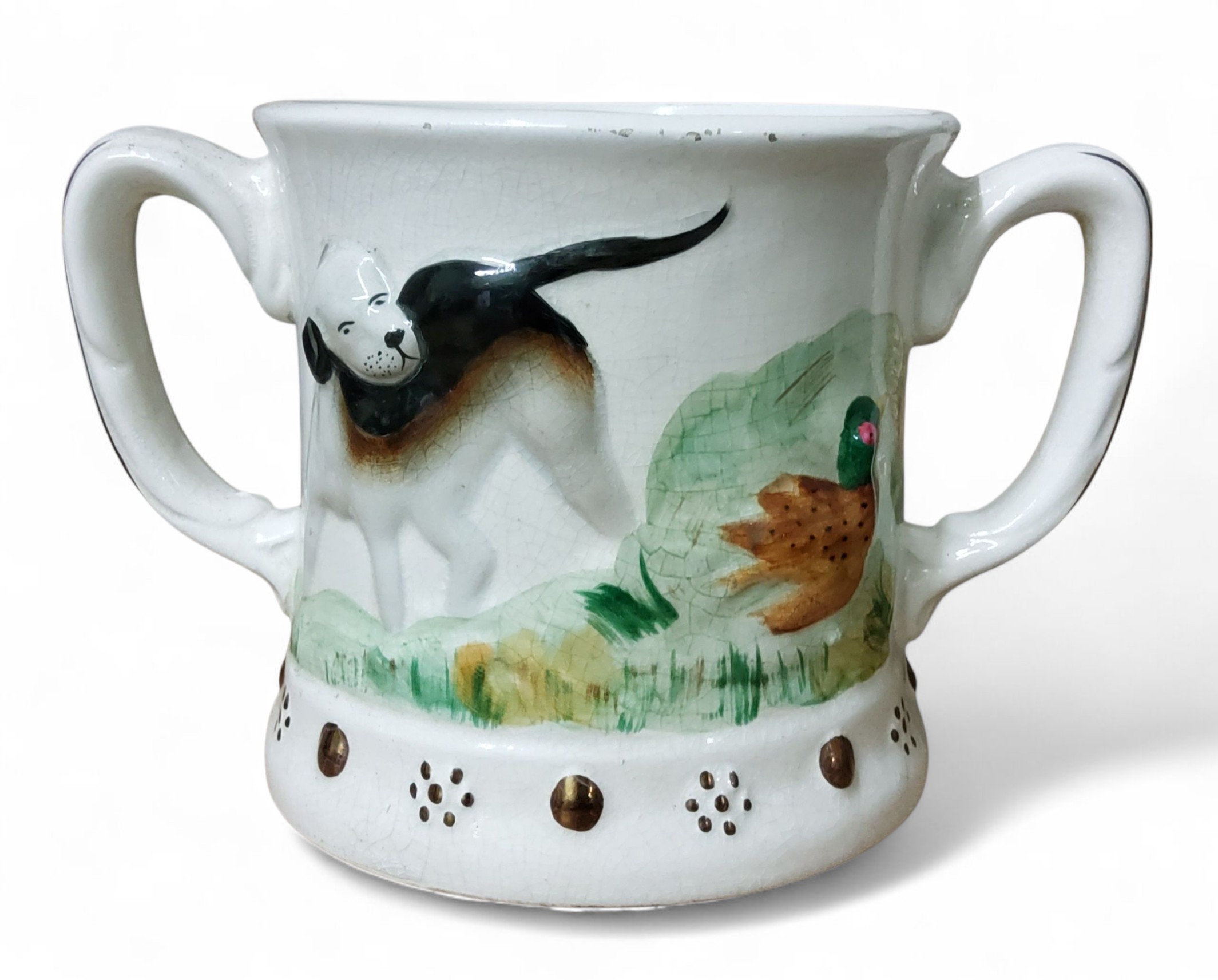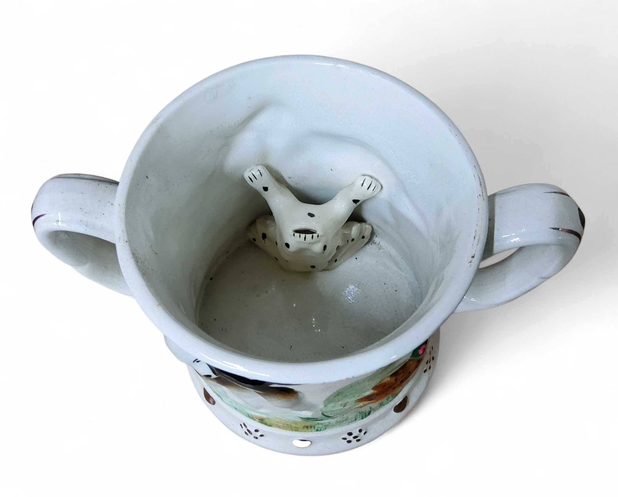 A Staffordshire frog mug, in relief with gun dogs and pheasant, the interior with frog, 13.5cm high