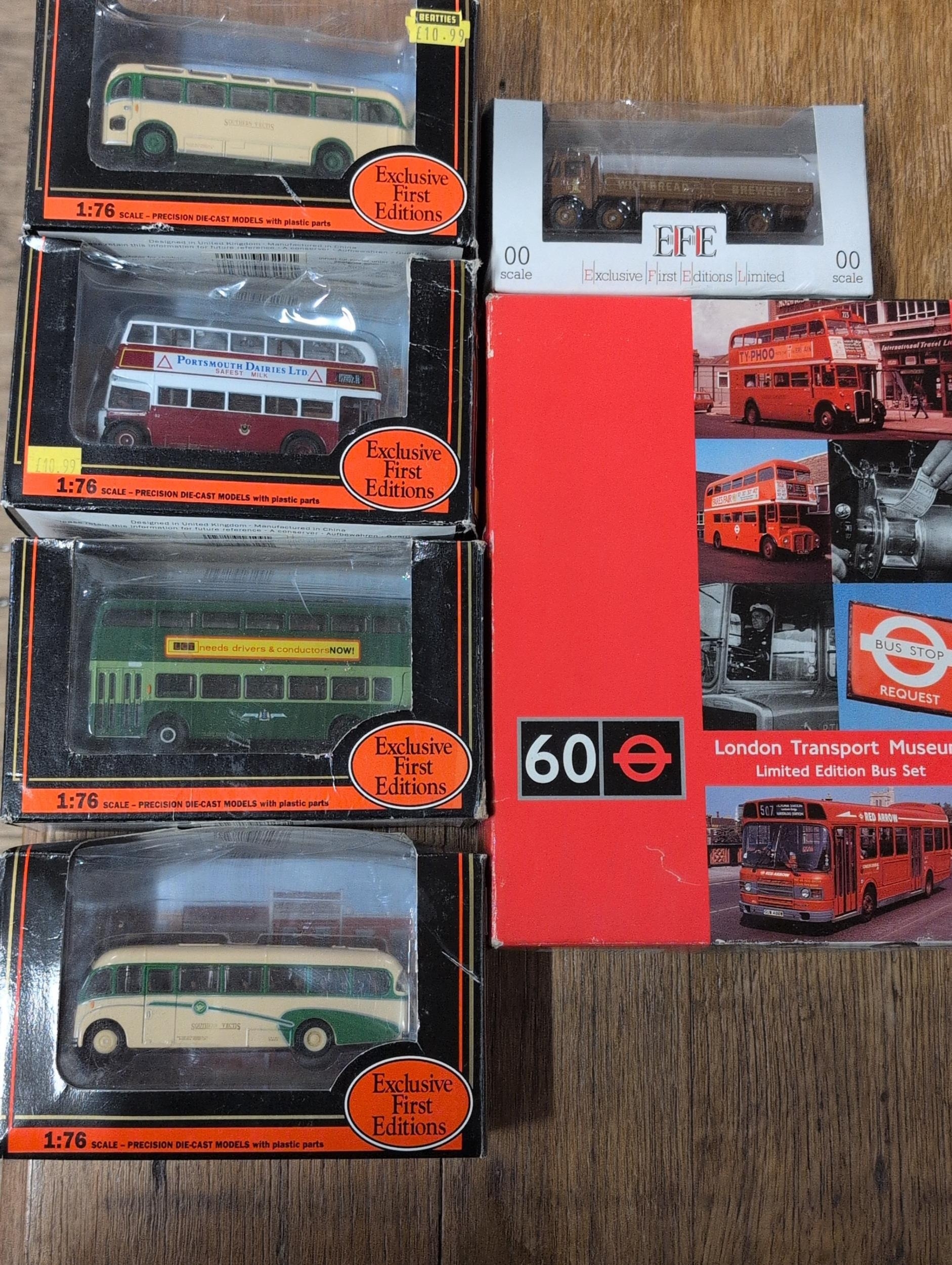 A Collection of boxed Exclusive First Editions (EFE) 1:76 Scale Die-Cast Model Buses and a Truck