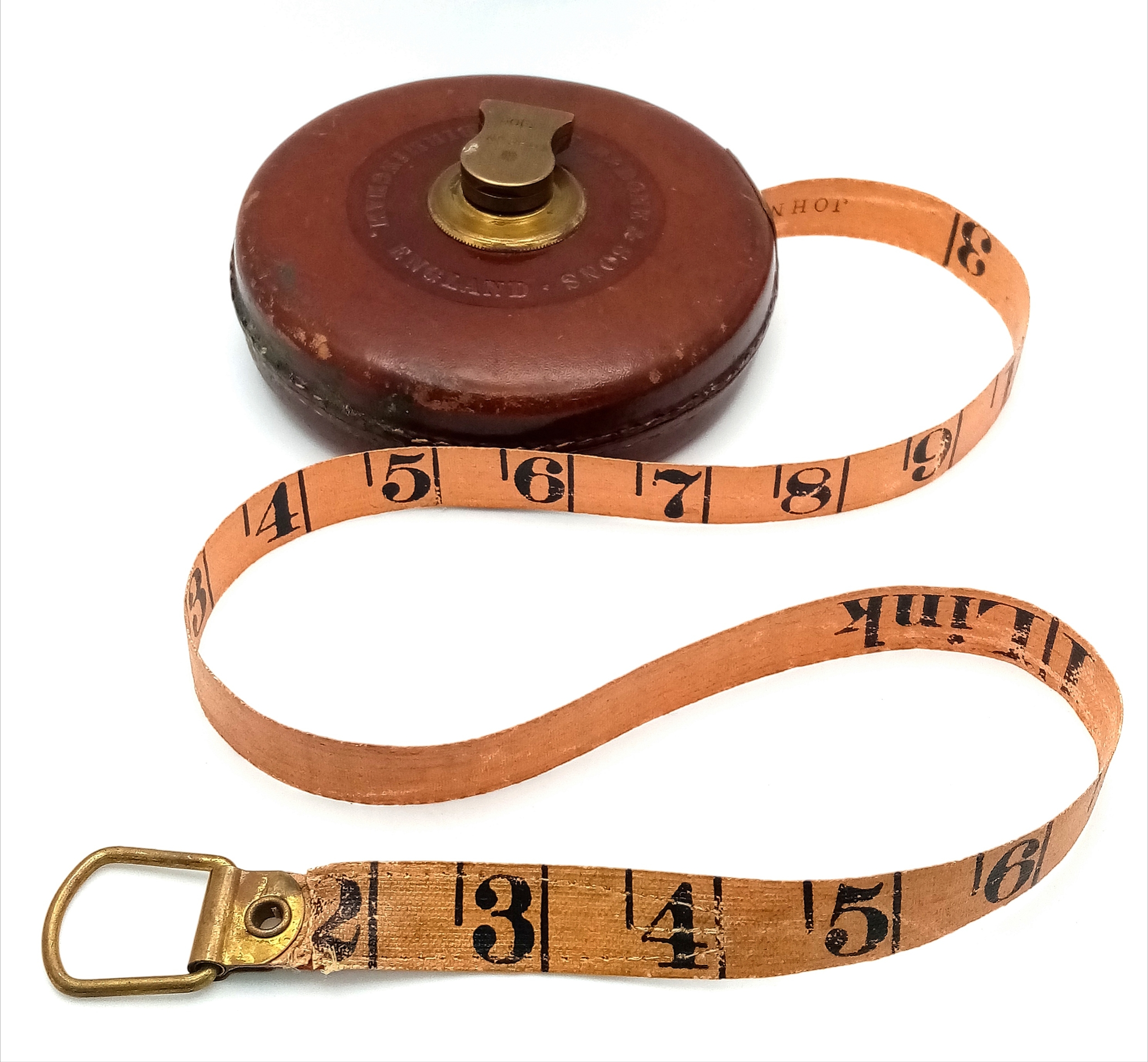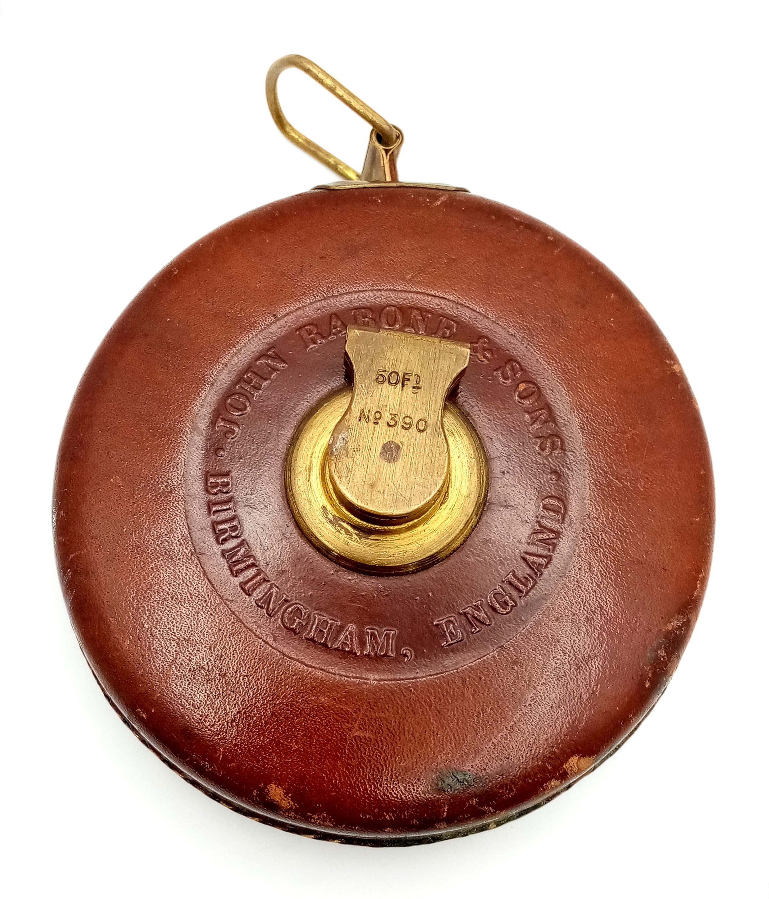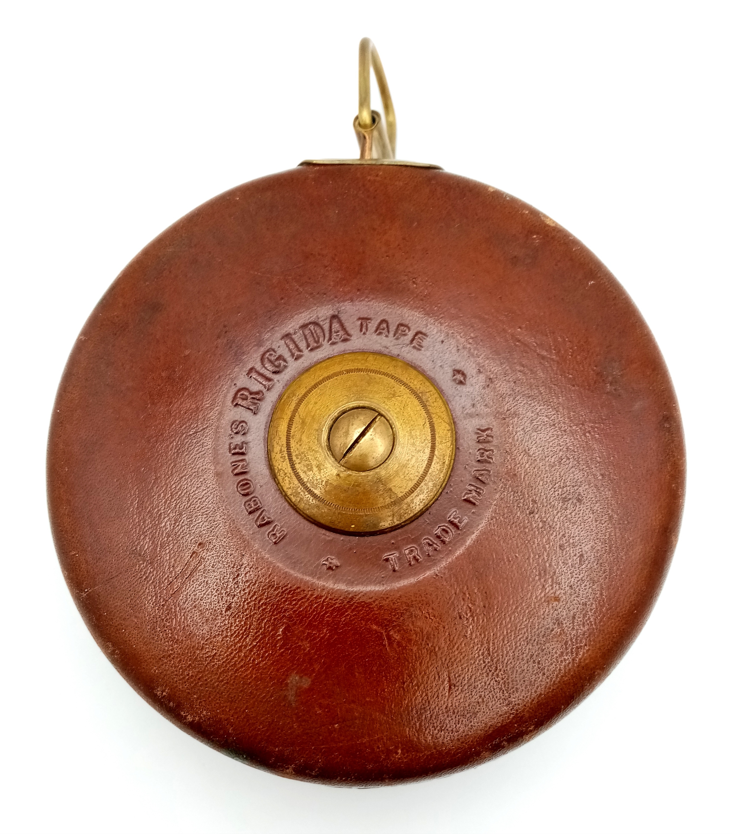 A VINTAGE RABONES RIGIDA TAPE MADE BY JOHN RABONE & SONS IN BIRMINGHAM RETRACTS AS SMOOTHLY AS THE DAY IT WAS MADE . 11cms DIAMETER ANS 50ft TAPE LENGTH