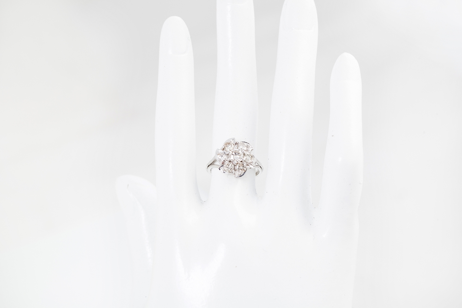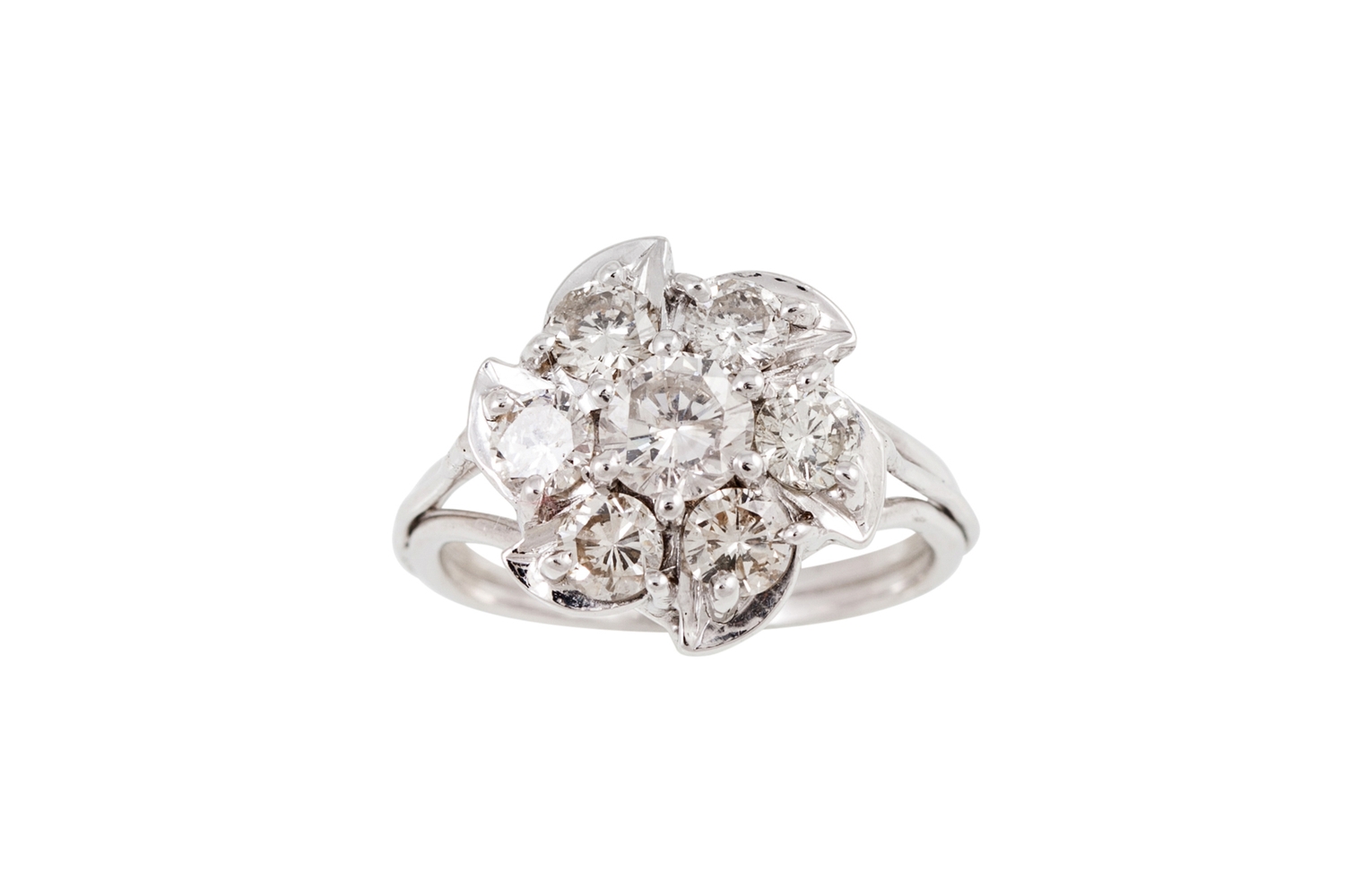 A DIAMOND CLUSTER RING, the brilliant cut diamonds mounted in 18ct gold. Estimated; weight of diamonds; 1.50 ct, colour and clarity; I/J, SI, size I - J