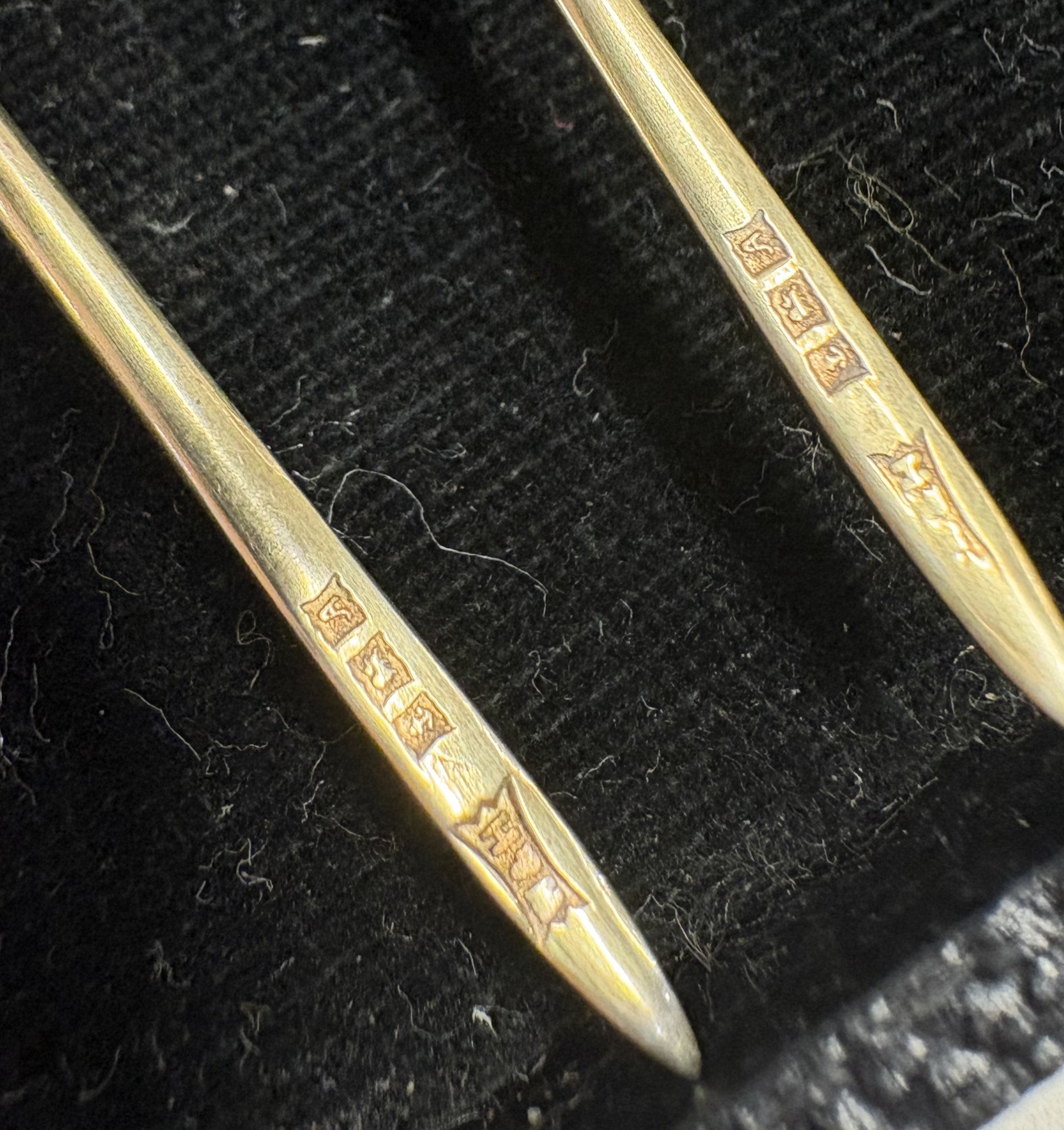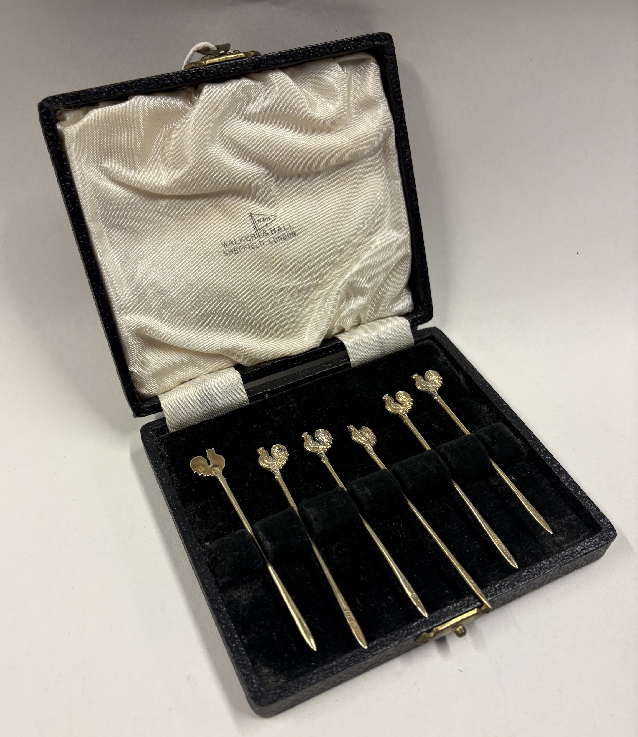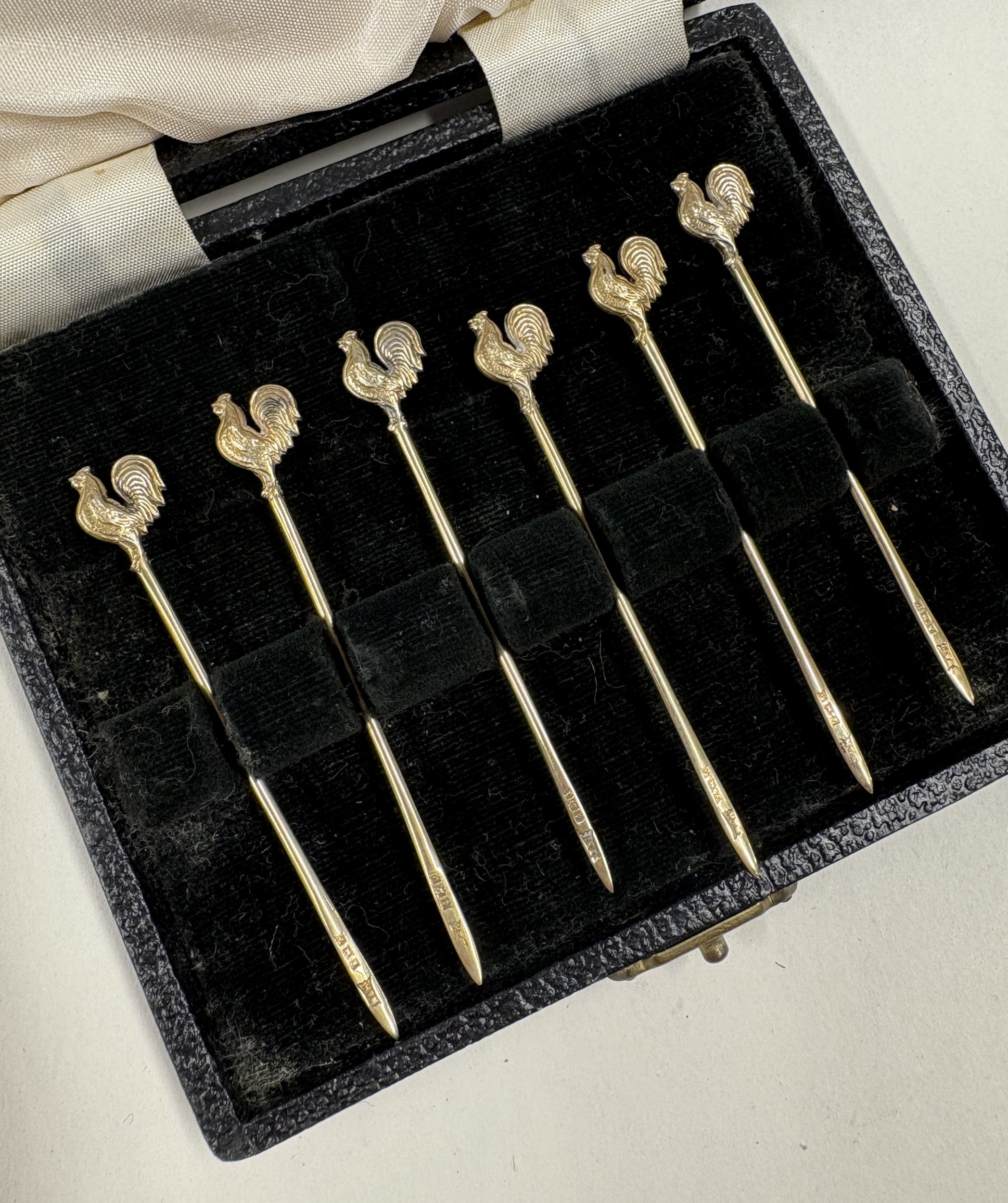 A set of six silver gilt sandwich picks with cockerel finials. Birmingham. Approx. 7 grams. Est. £80 - £120.