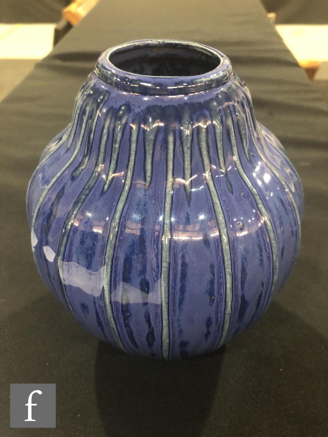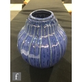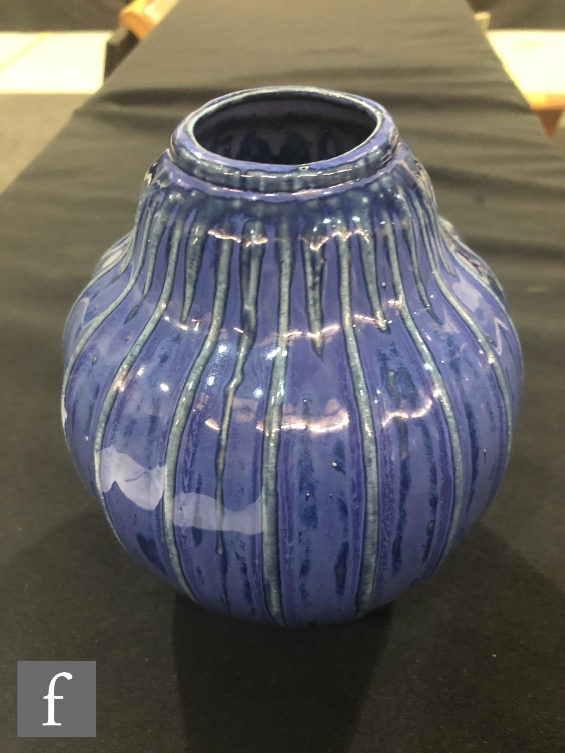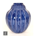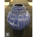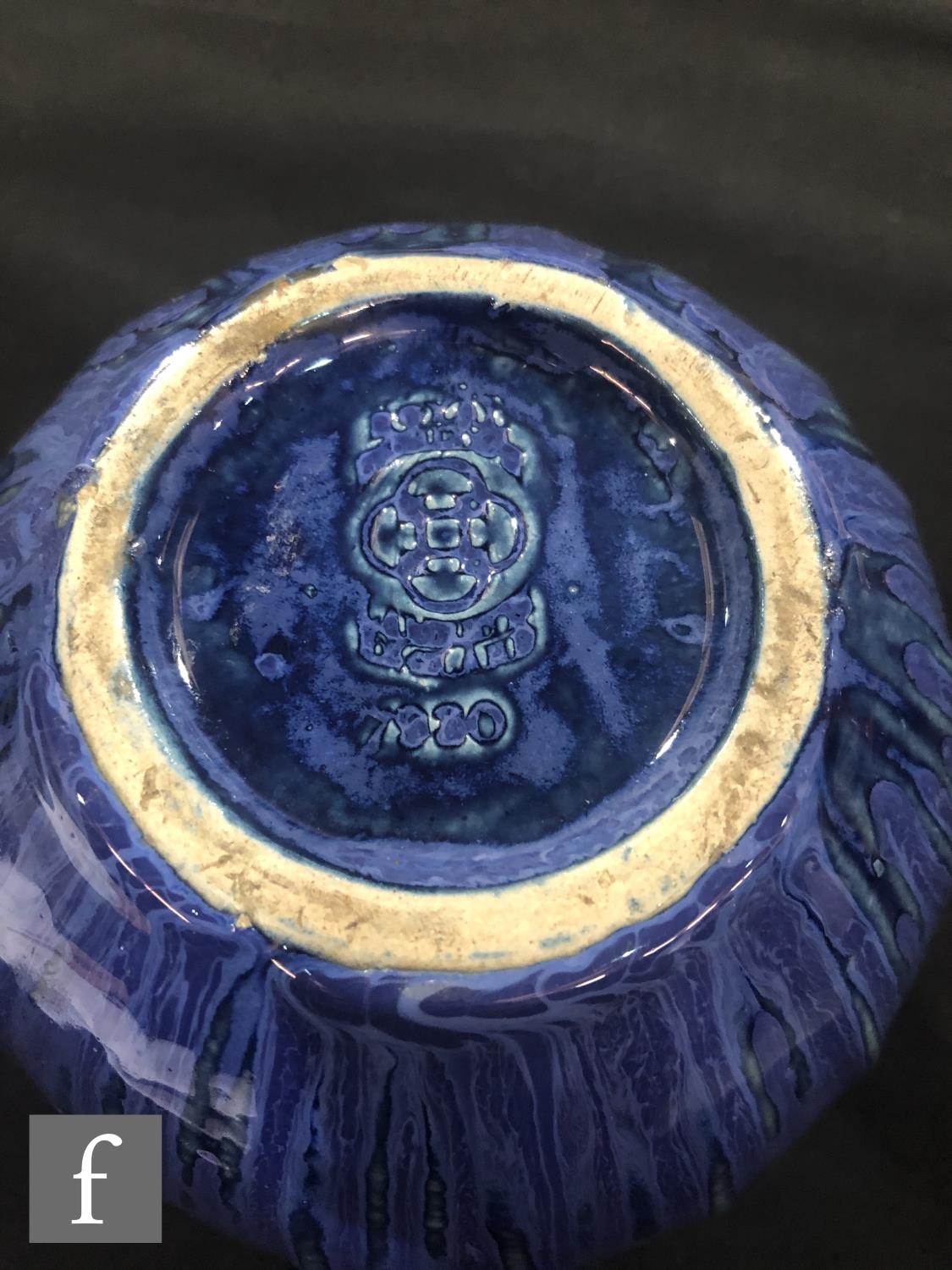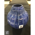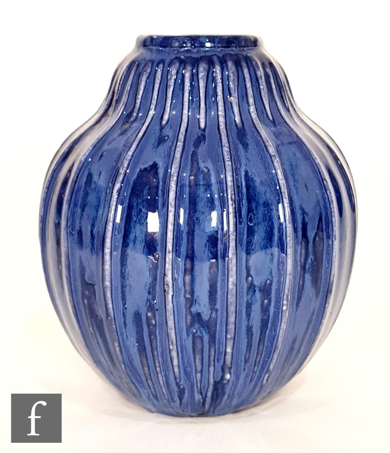 Doulton Lambeth - An early 20th Century vase of gourd form, the whole decorated in a streaked blue glaze with green linear detail to the raised sections, impressed mark, height 17cm.