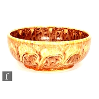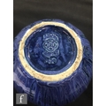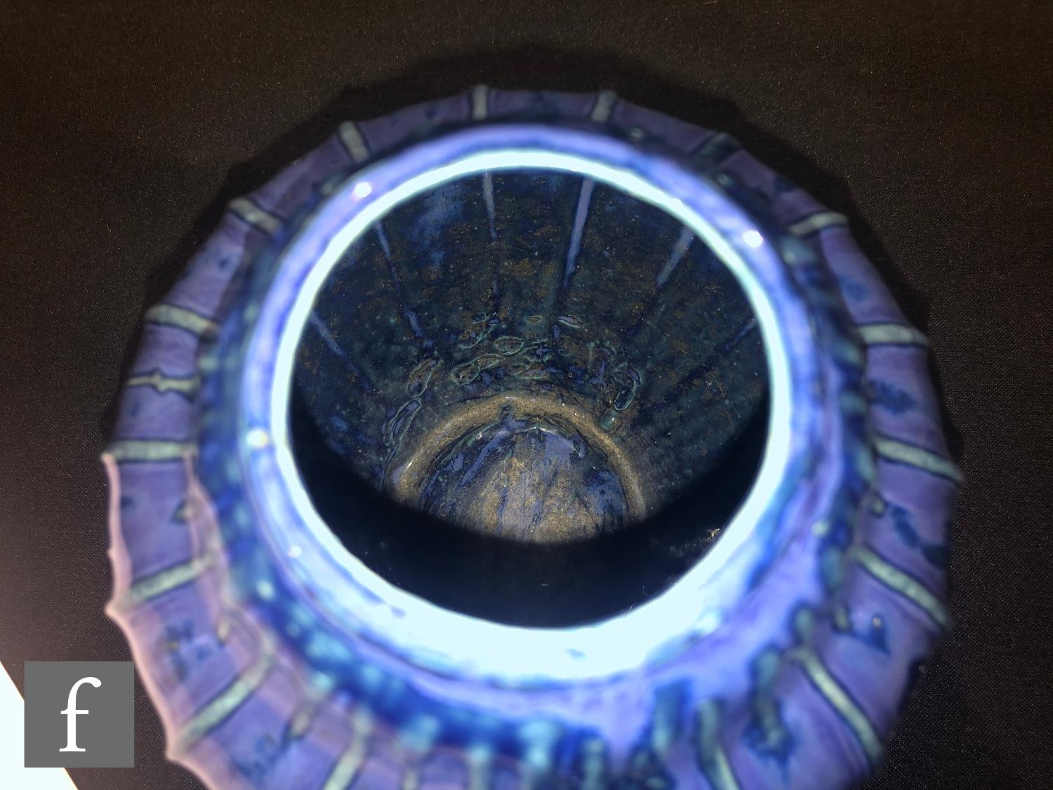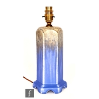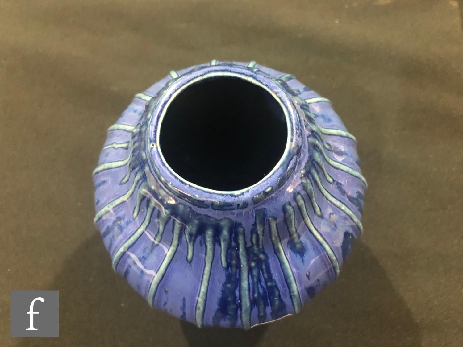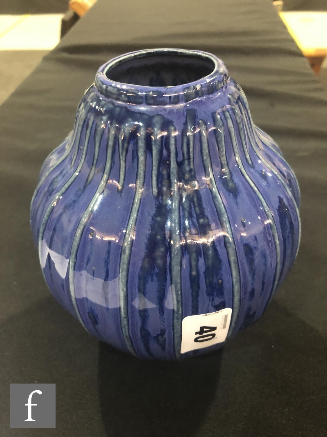 Doulton Lambeth - An early 20th Century vase of gourd form, the whole decorated in a streaked blue glaze with green linear detail to the raised sections, impressed mark, height 17cm.