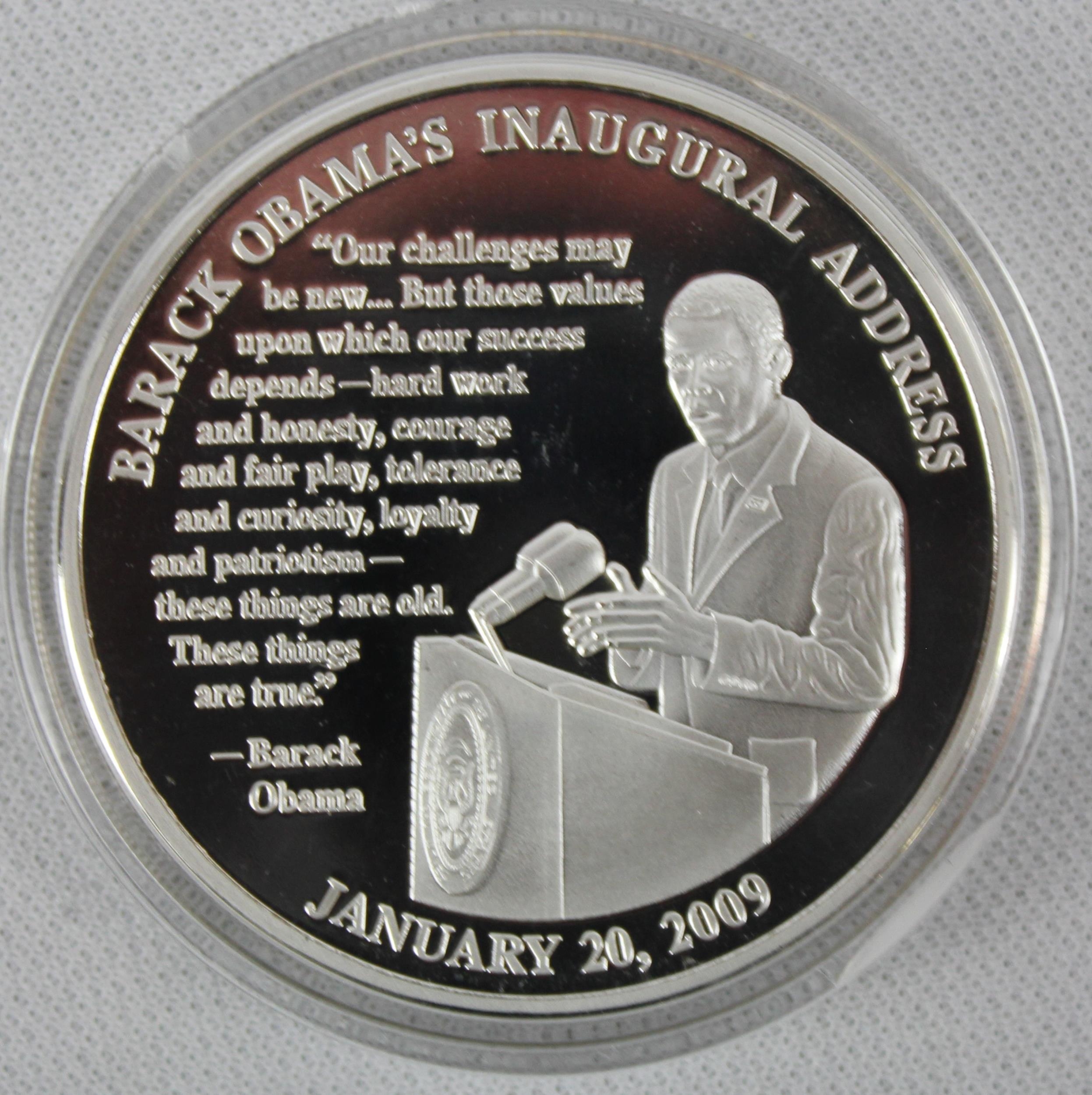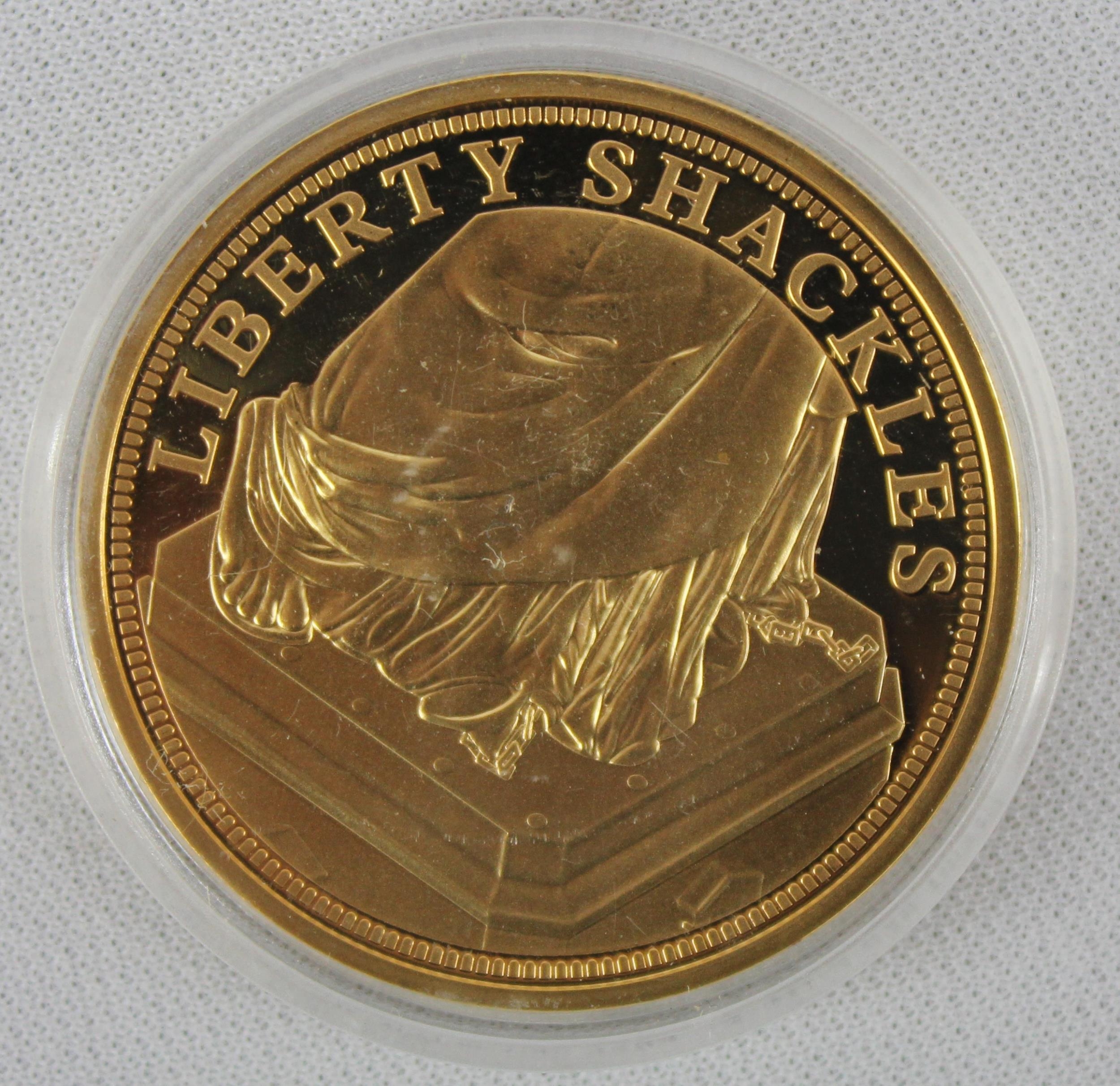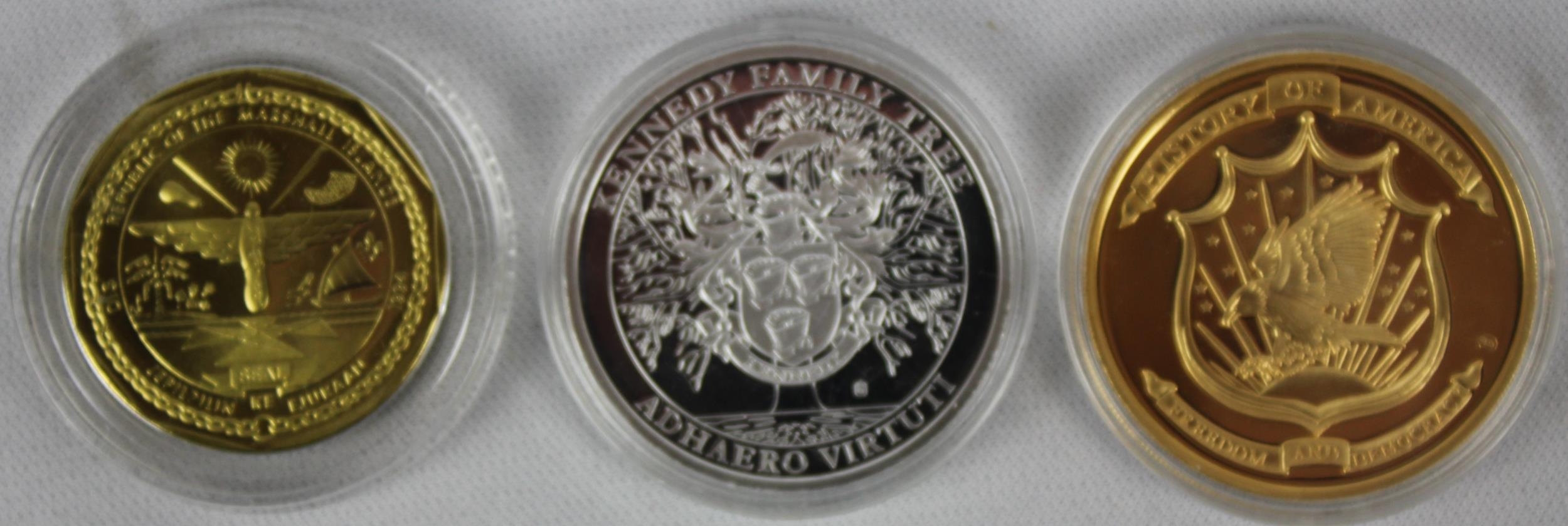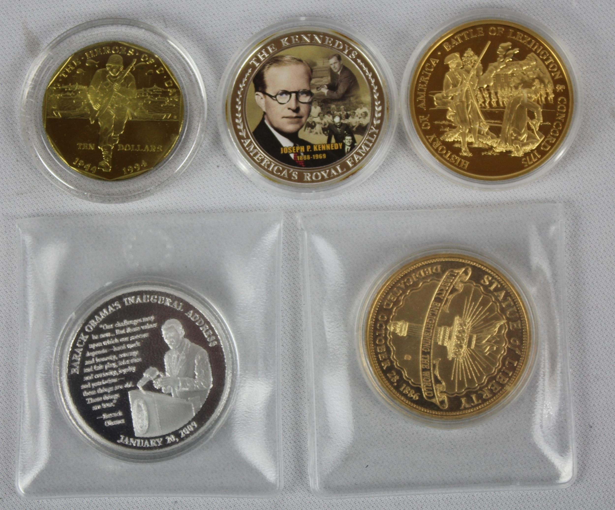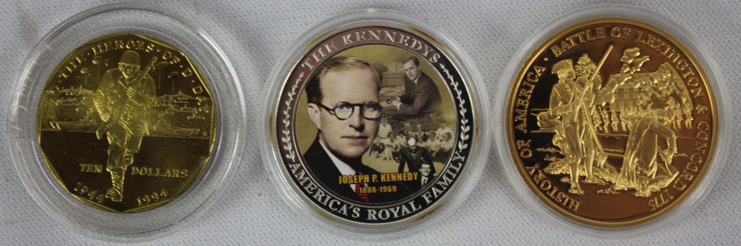 5 COMMEMORATIVE COINS: THE HEROES OF D-DAY REPUBLIC OF THE MARSHALL TEN DOLLARS 1944-1994, HISTORY OF AMERICA BATTLE OF LEXINGTON & CONCORD 1775, THE KENNEDYS - JOSEPH P KENNEDY 1888-1969, STATUE OF LIBERTY DEDICATED OCTOBER 28 1886 - LIBERTY SHACKLES & BARACK OBAMA'S INAUGURAL ADDRESS JANUARY 20 2009