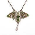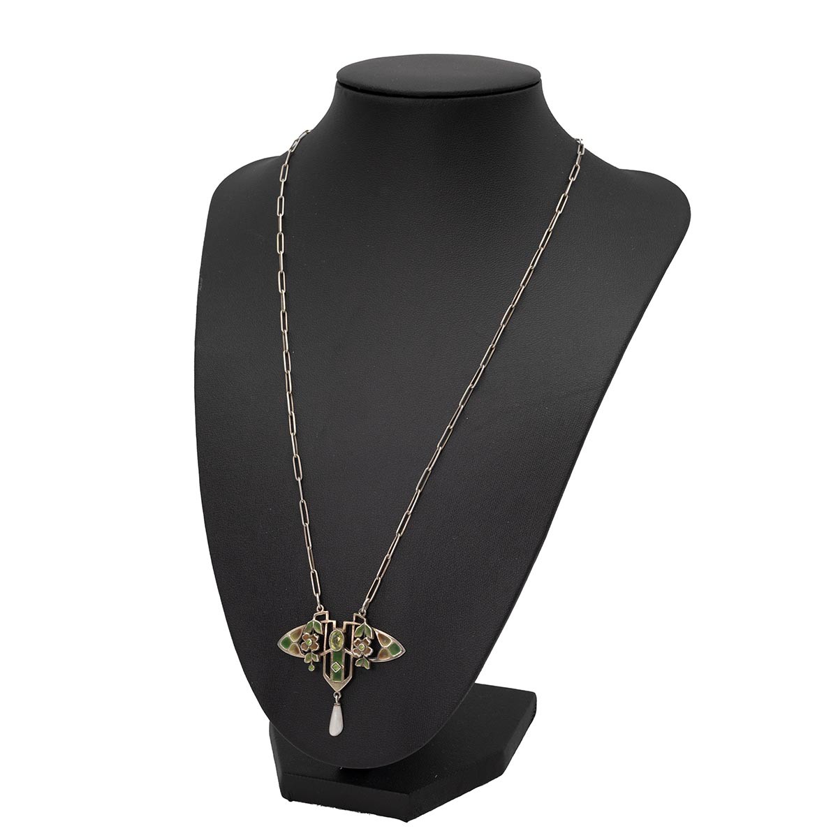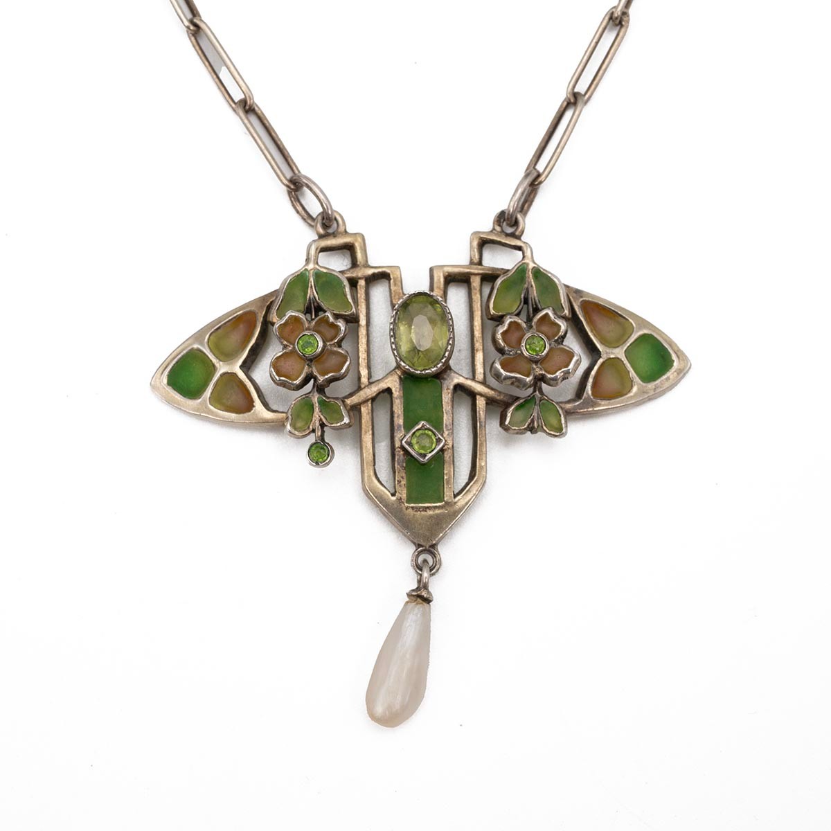 A 20th-century Jungenshill style pendant of Art Nouveau style, set with enamel, peridots and a drop pearl, drop 29cm.
