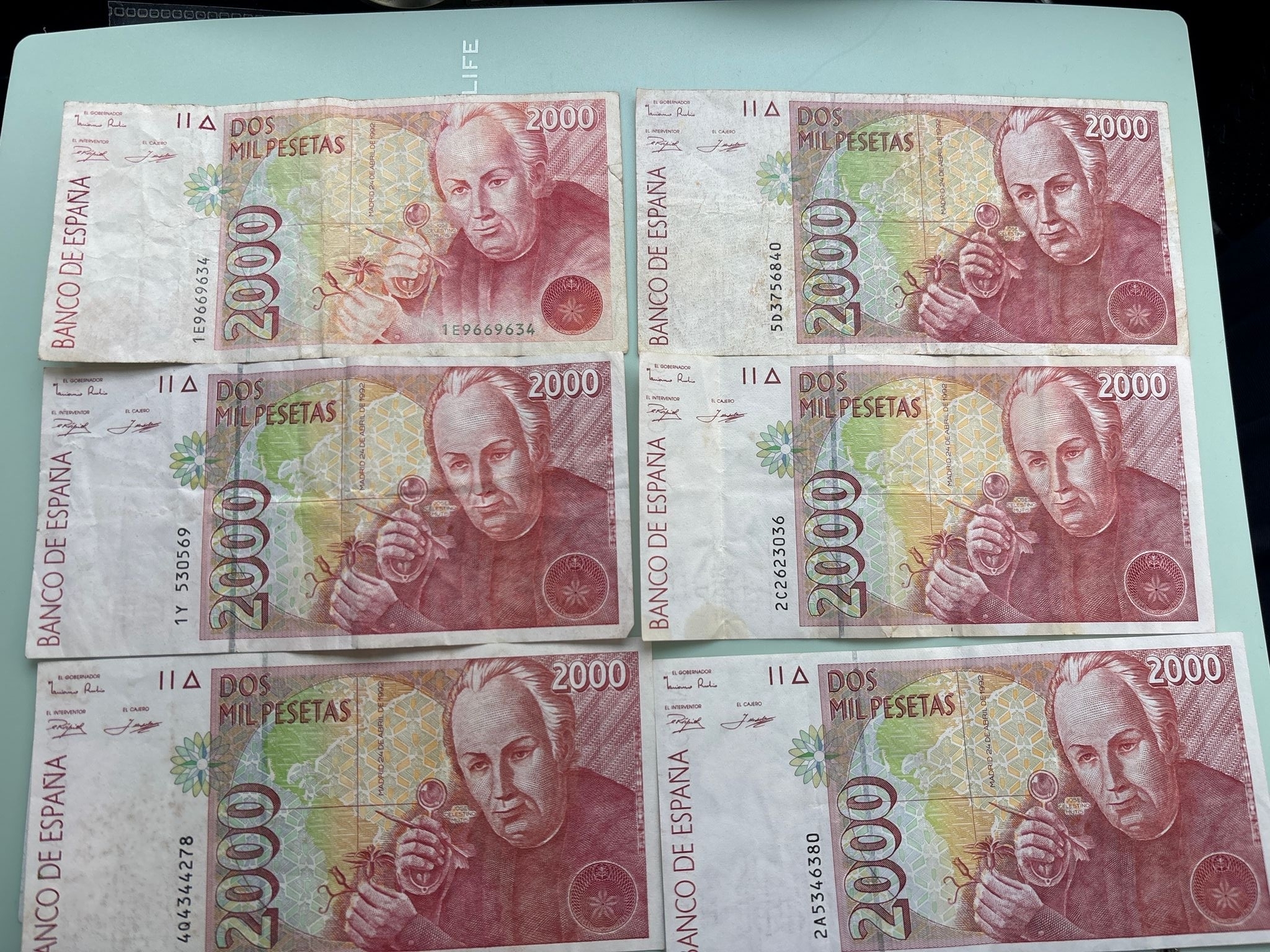 Spain 2000 Pesetas Banknote Collection – 6 Notes (1992 Issue).Mixed group of Spanish Banco de España 2000 Pesetas notes featuring poet Juan Ramón Jiménez. All circulated with visible folds and handling wear. Classic pre-Euro European currency. Ideal starter or bulk collector lot. Sold as seen.