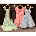 Overall rather good condition. The green dress has some staining to the hem, and overall some light discoloration, please see photos. The pink and the blue dresses are good.