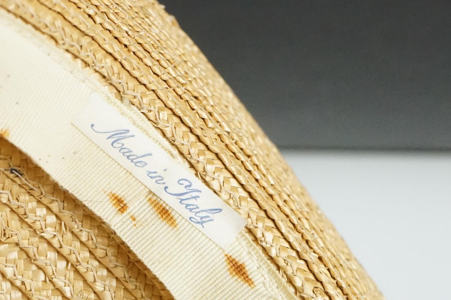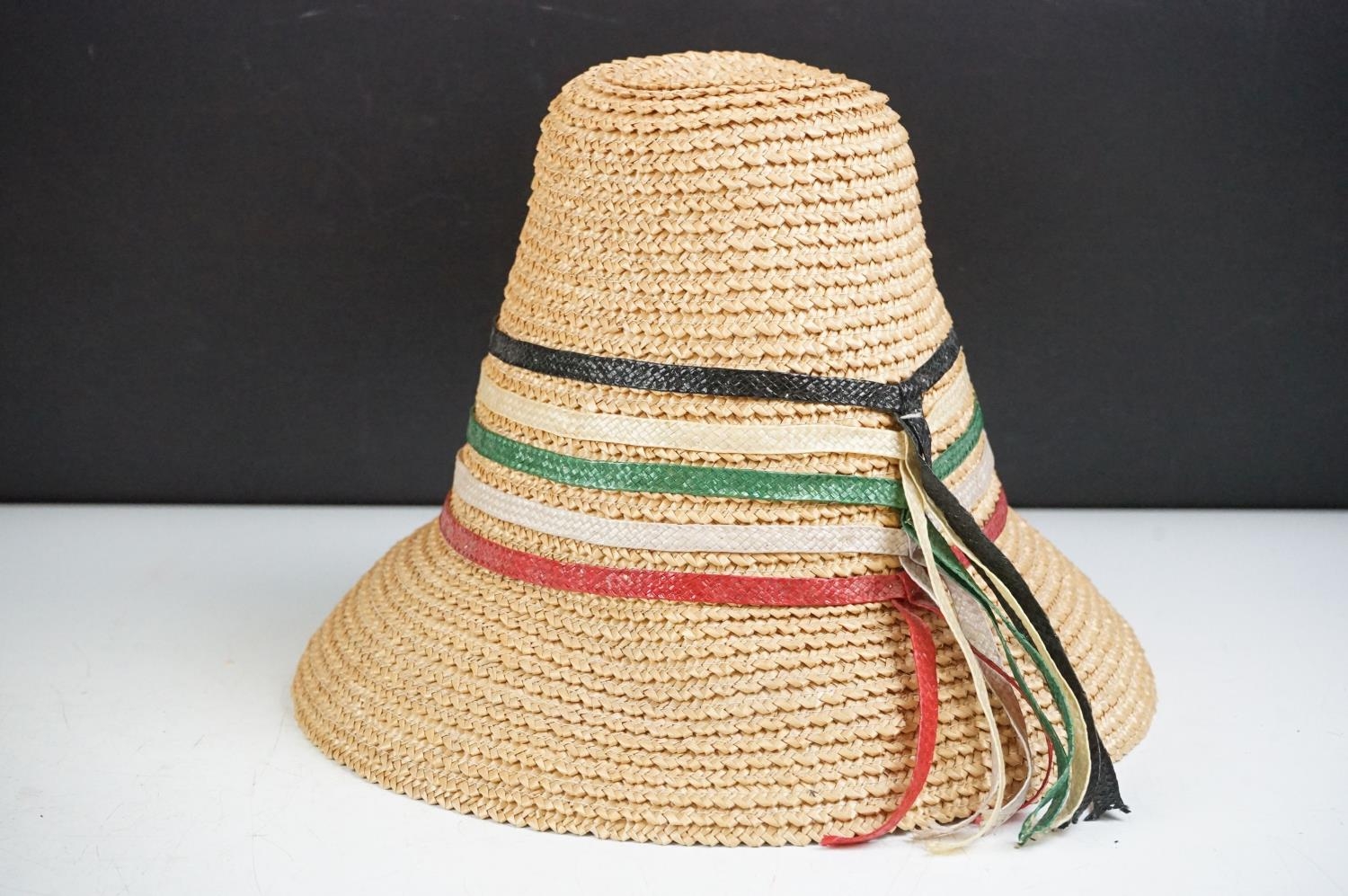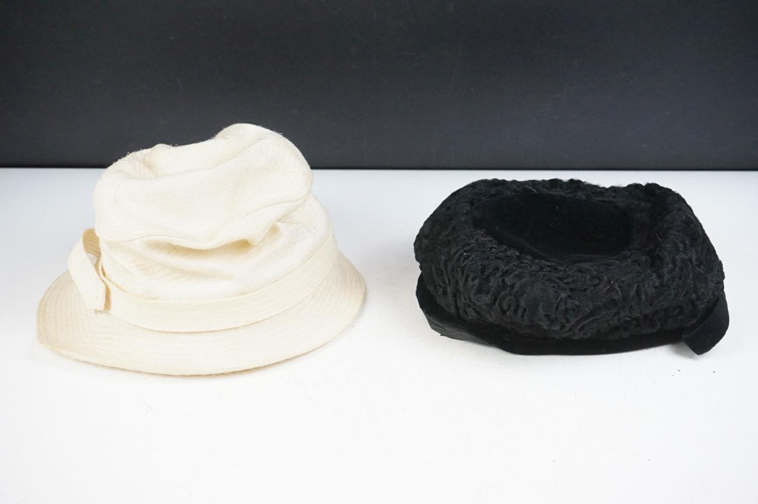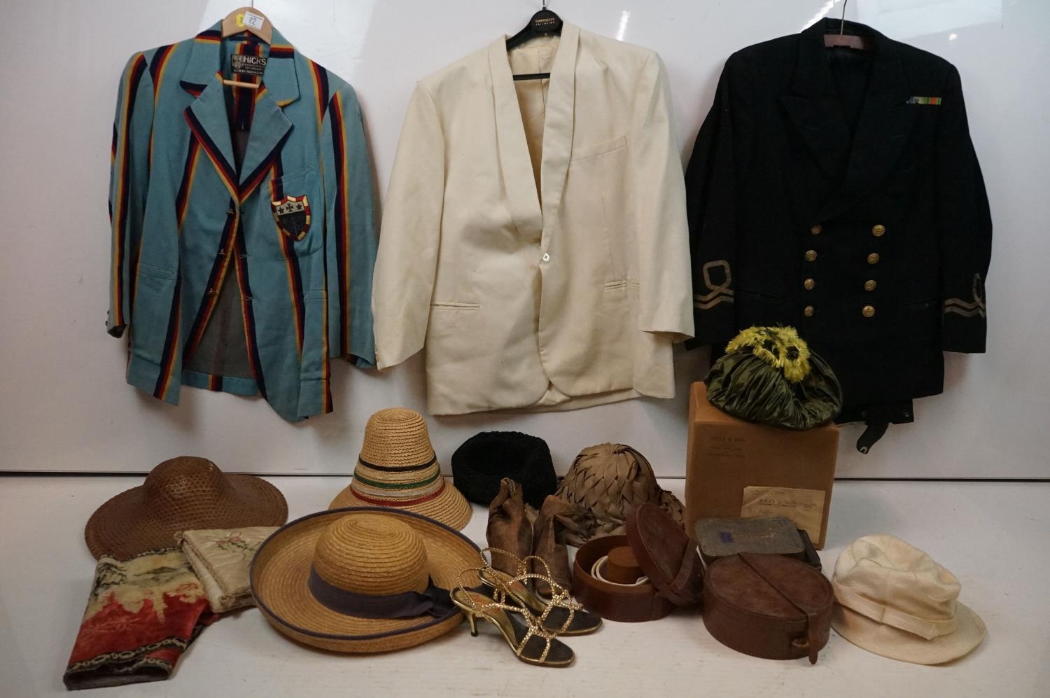 Group of clothing / fashion accessories to include a Royal Navy jacket, Austin Reed gentlemans jacket, Hicks of Birmingham university blazer, pair of Stradlers of Italy high-heeled shoes, two leather collar boxes (housing a quantity of collars), handkerchief box (with handkerchief), ladies hats (featuring a boxed Jolly & Son of Bath example, woven sun hats, Paul Irene of Paris....), pair of ladies leather ankle boots, etc; plus a small Middle Eastern wool runner with figural decoration