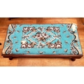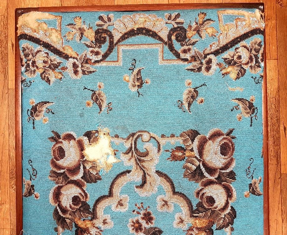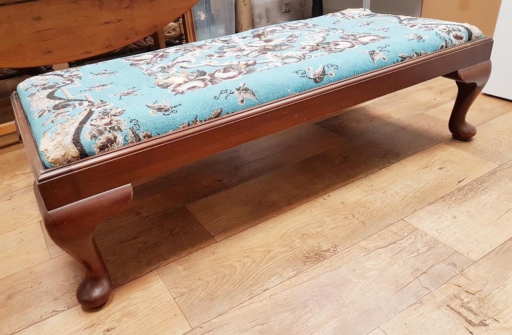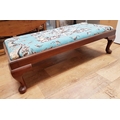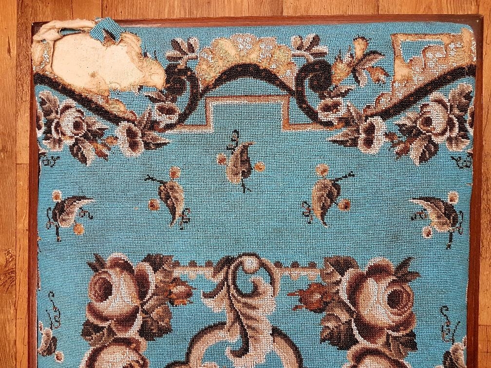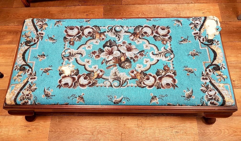 A large Victorian Mahogany Beaded Tapestry Footstool with striking blue design. Measuring 50 inches x 25 inches, some damage to corners of beadwork