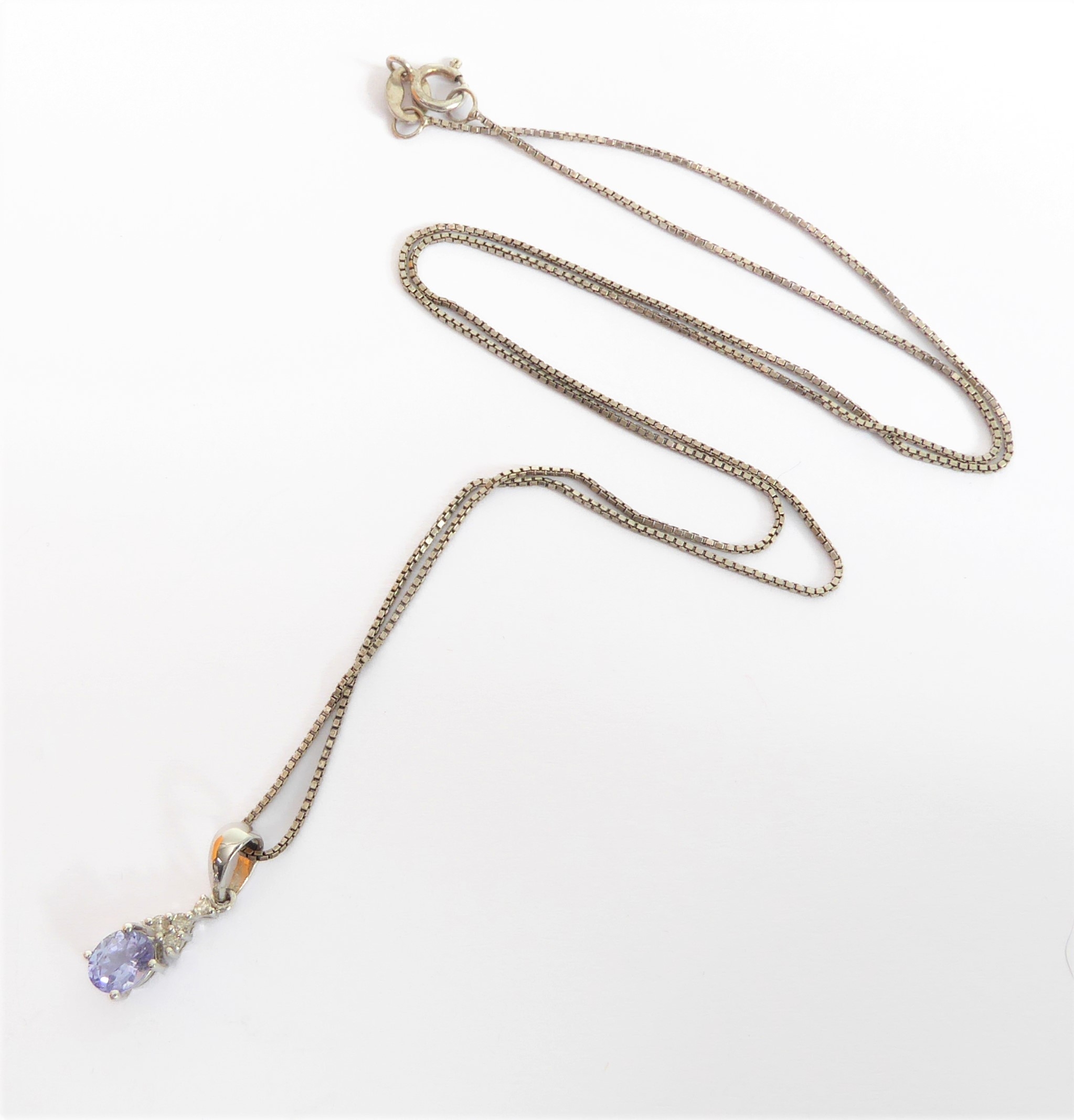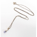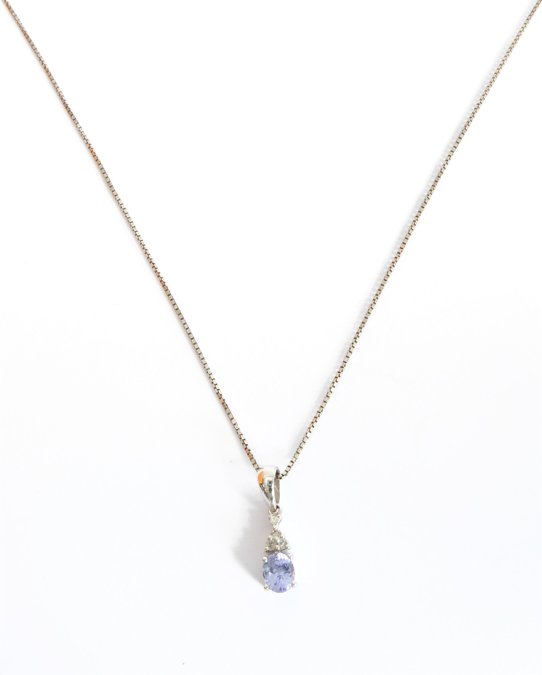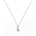 A silver pendant set with a hand-cut oval tanzanite: below four further smaller white stone chips (possibly diamonds), upon a silver chain