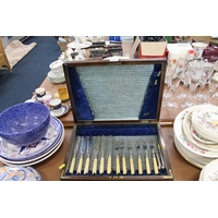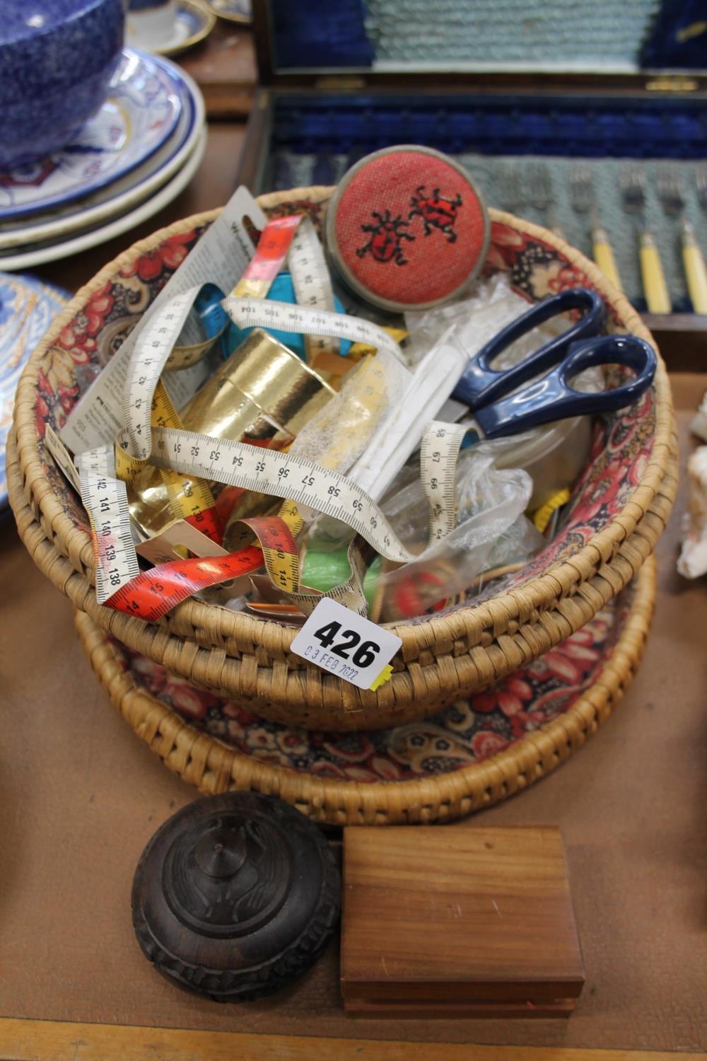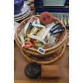 Basket containing haberdashery, a carved wood pot and cover, etc.