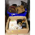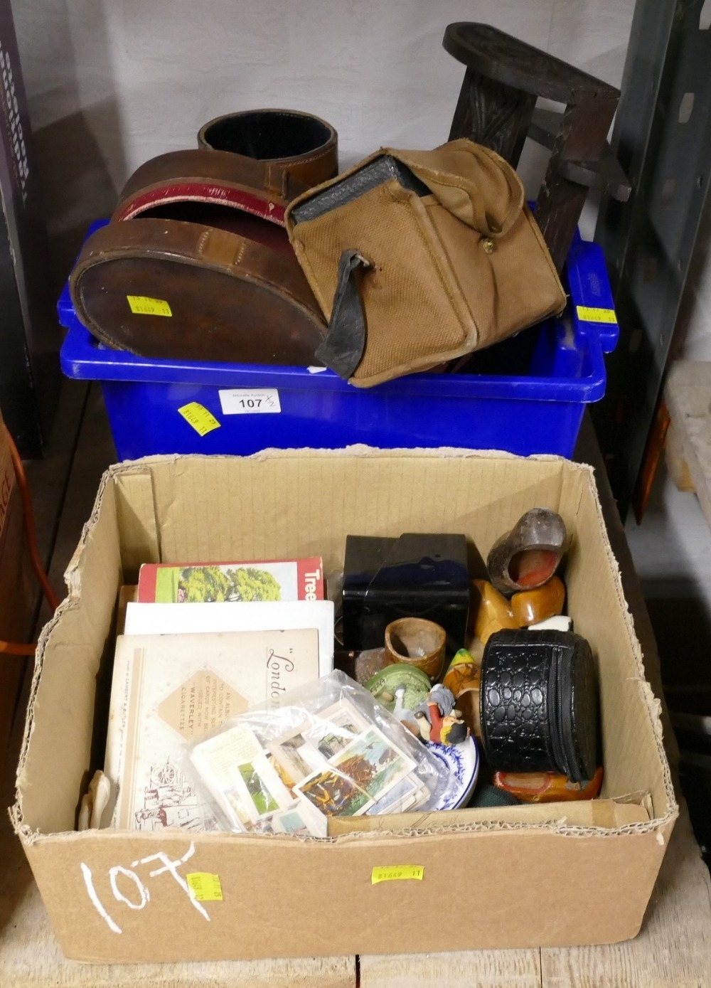 Vintage leather cases (empty), Brownie camera, cigarette cards, ornaments etc